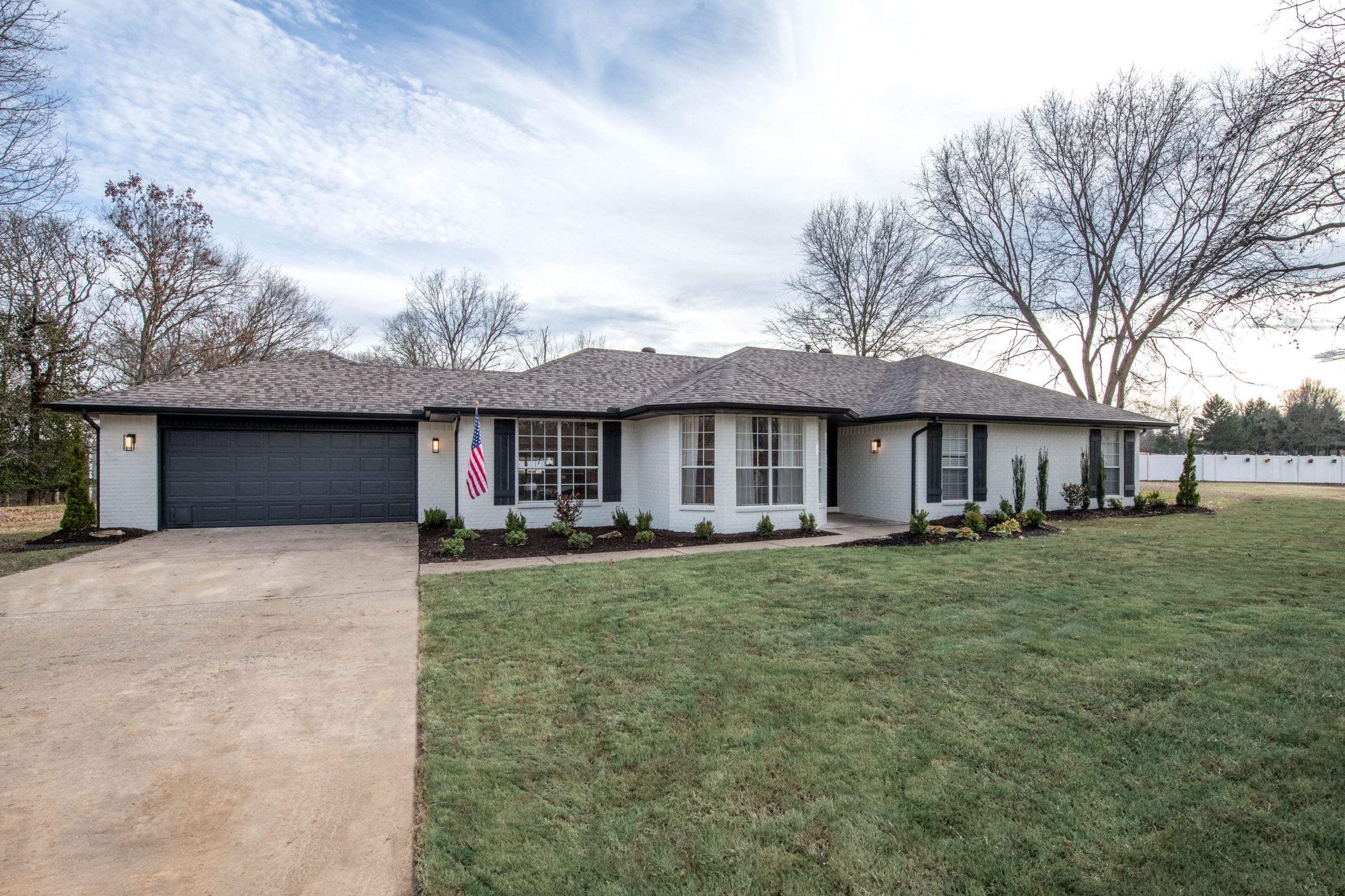 The exterior of this home was pretty straightforward. Dustin and Hannah wanted to brighten up the dated brick with a traditional white color. With so much brick, we thought it would also be a good idea to break it up a bit with the contrast of black shutters. Dave whipped those up quickly, and they make such a big difference. We also switched out the front door for a more modern statement with a large window, and we finished everything off with fresh landscaping and new outdoor lights.