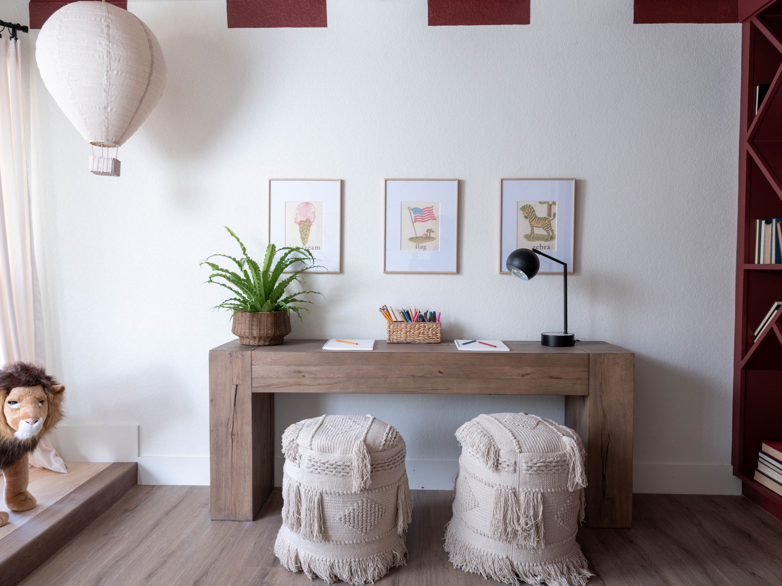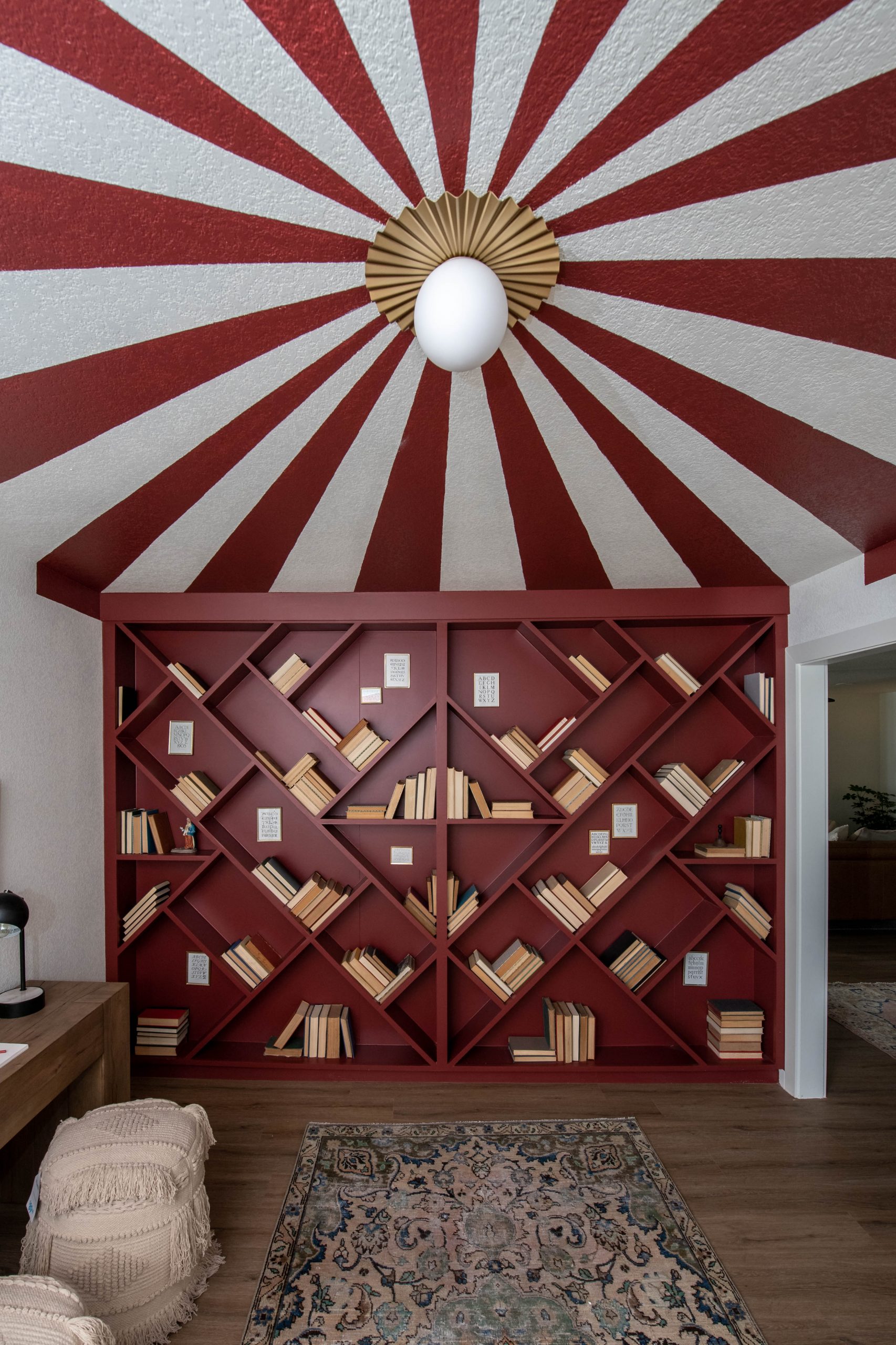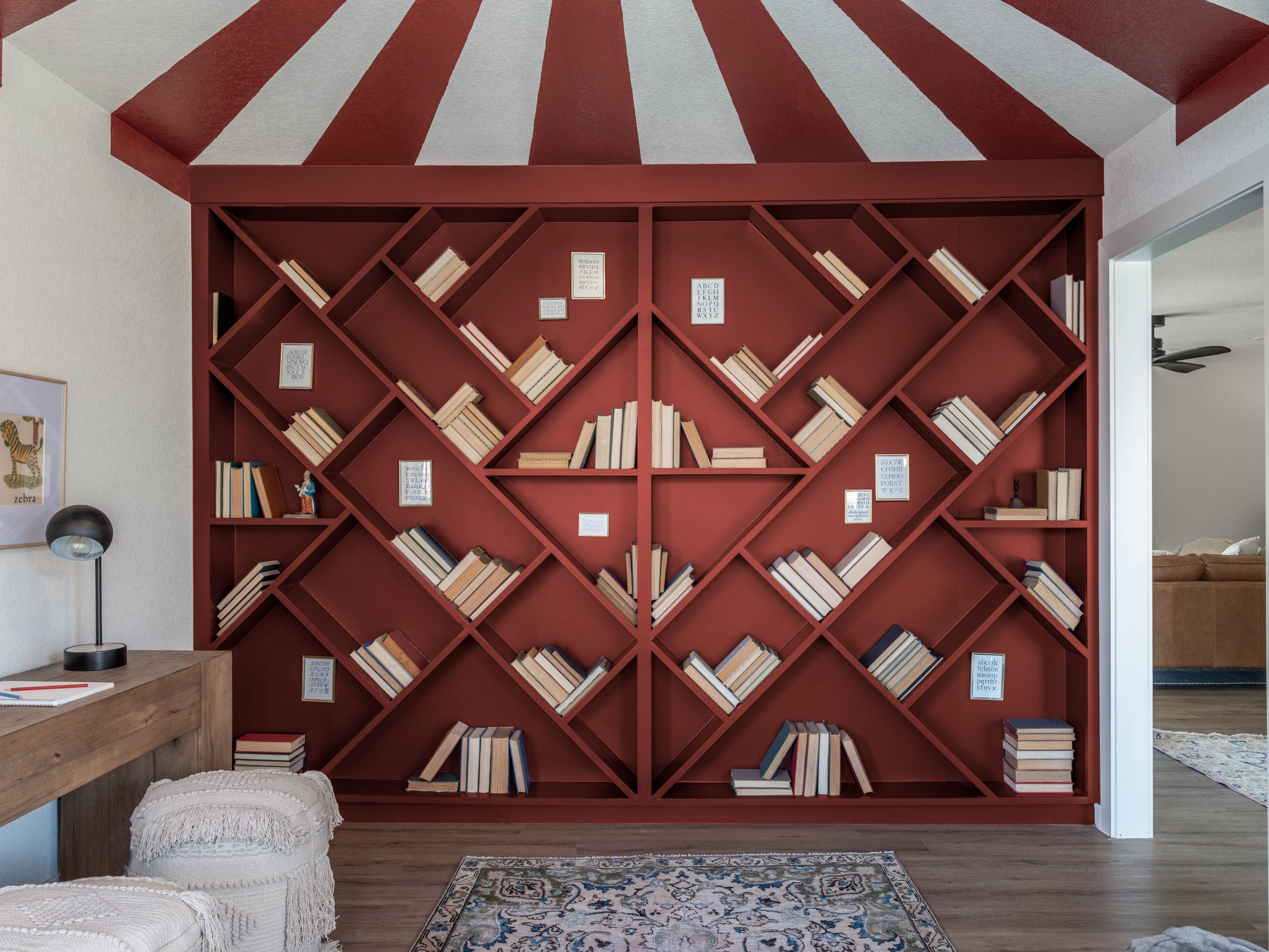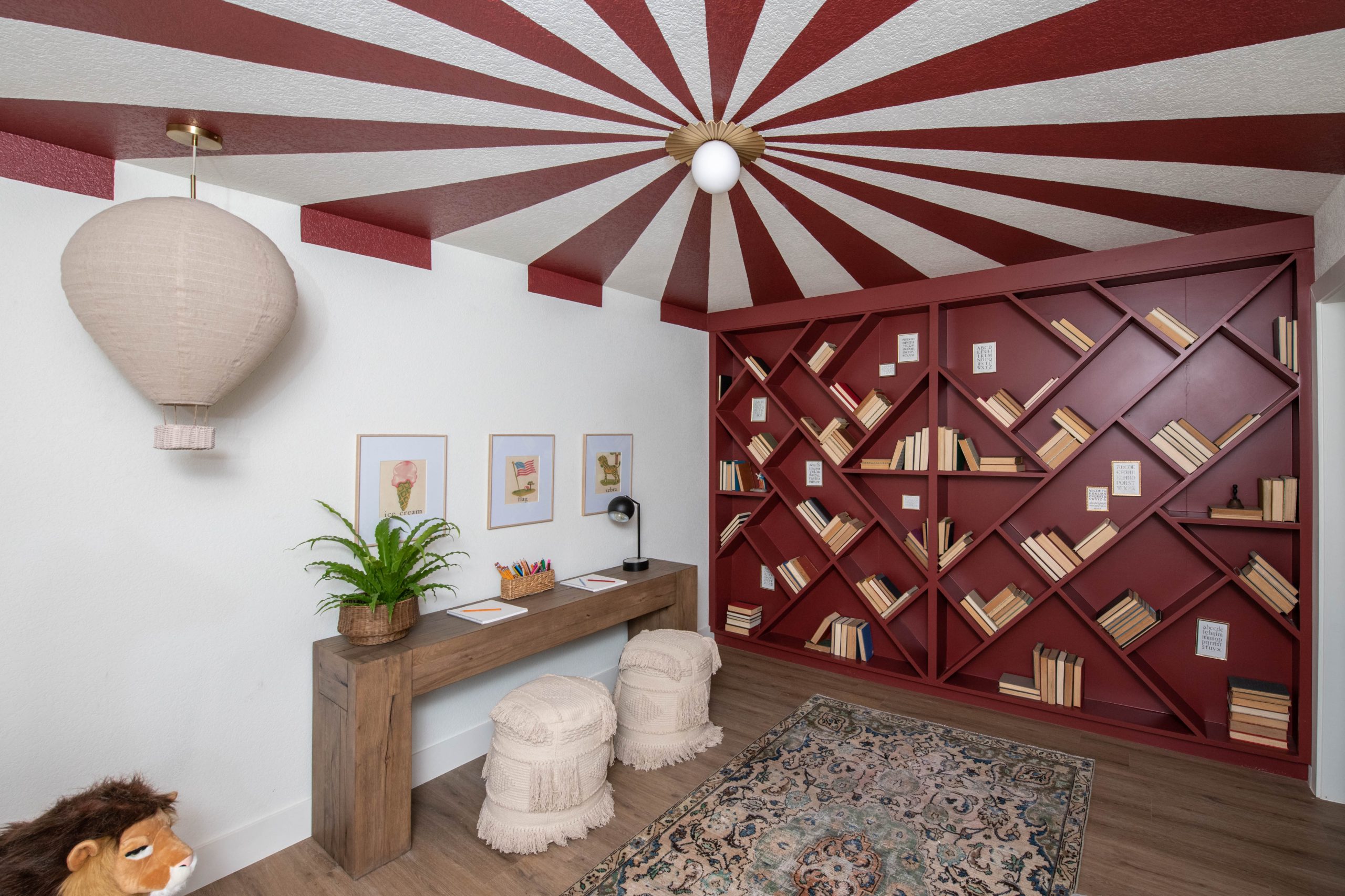 Like many families with small children, the formal dining room was not a space the Layugens pictured themselves using much. Instead, since it’s right off the kitchen, it would serve a better purpose as a play area right off the kitchen and living room where a family spends most of its time. This is where Dave and I felt we could make the greatest impact for this sweet family. We wanted the kids to be excited about their new house and happy about their move to Arkansas. For this room, we ran with the circus tent theme by painting the ceiling with red and white stripes like a big top. Then, we incorporated the red into funky, whimsical bookcases made by Dave, and added a fun custom stage in front of the bay window – complete with a special star design in the center. I can picture the kids putting on shows or using it as a reading nook.