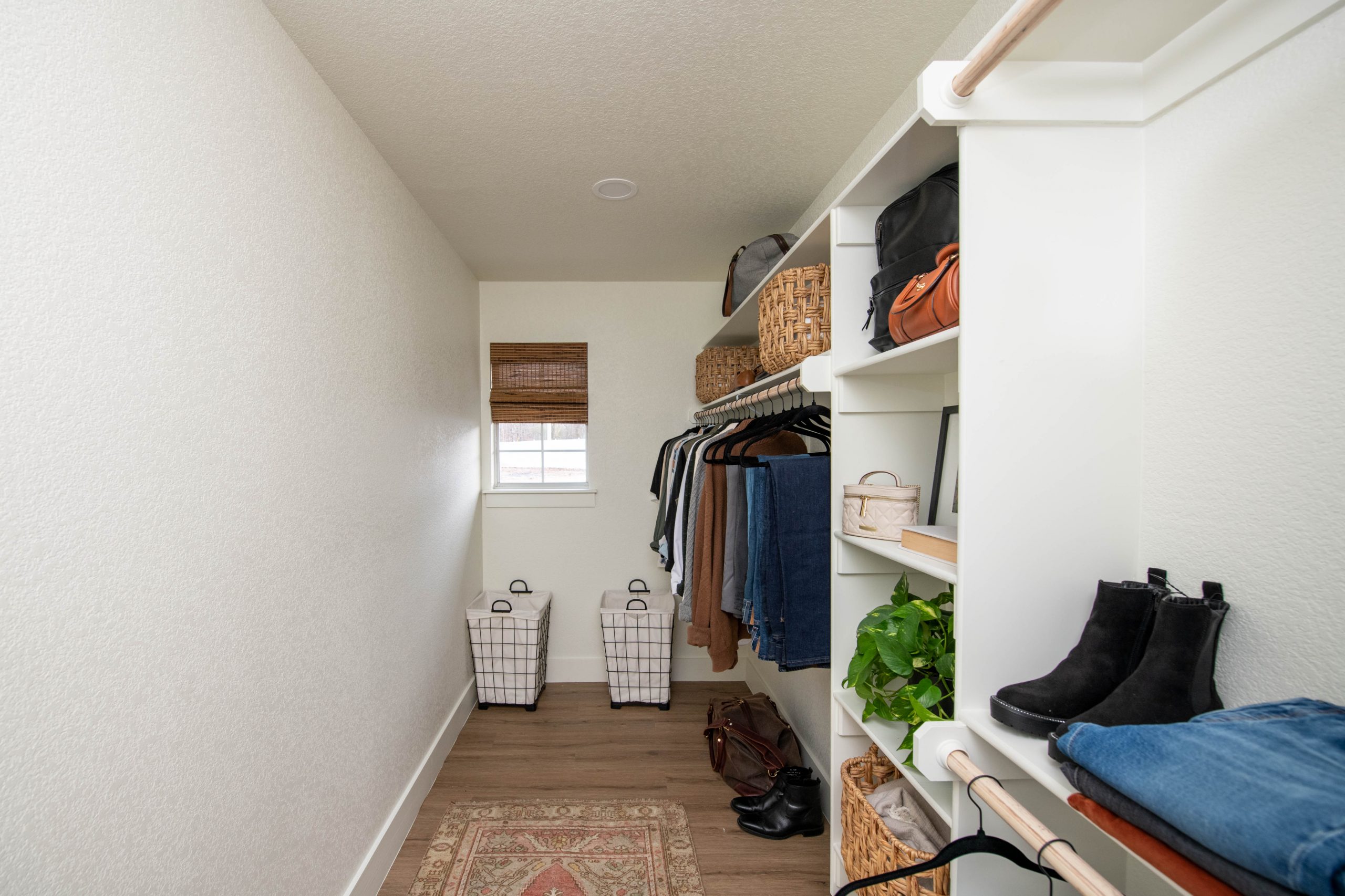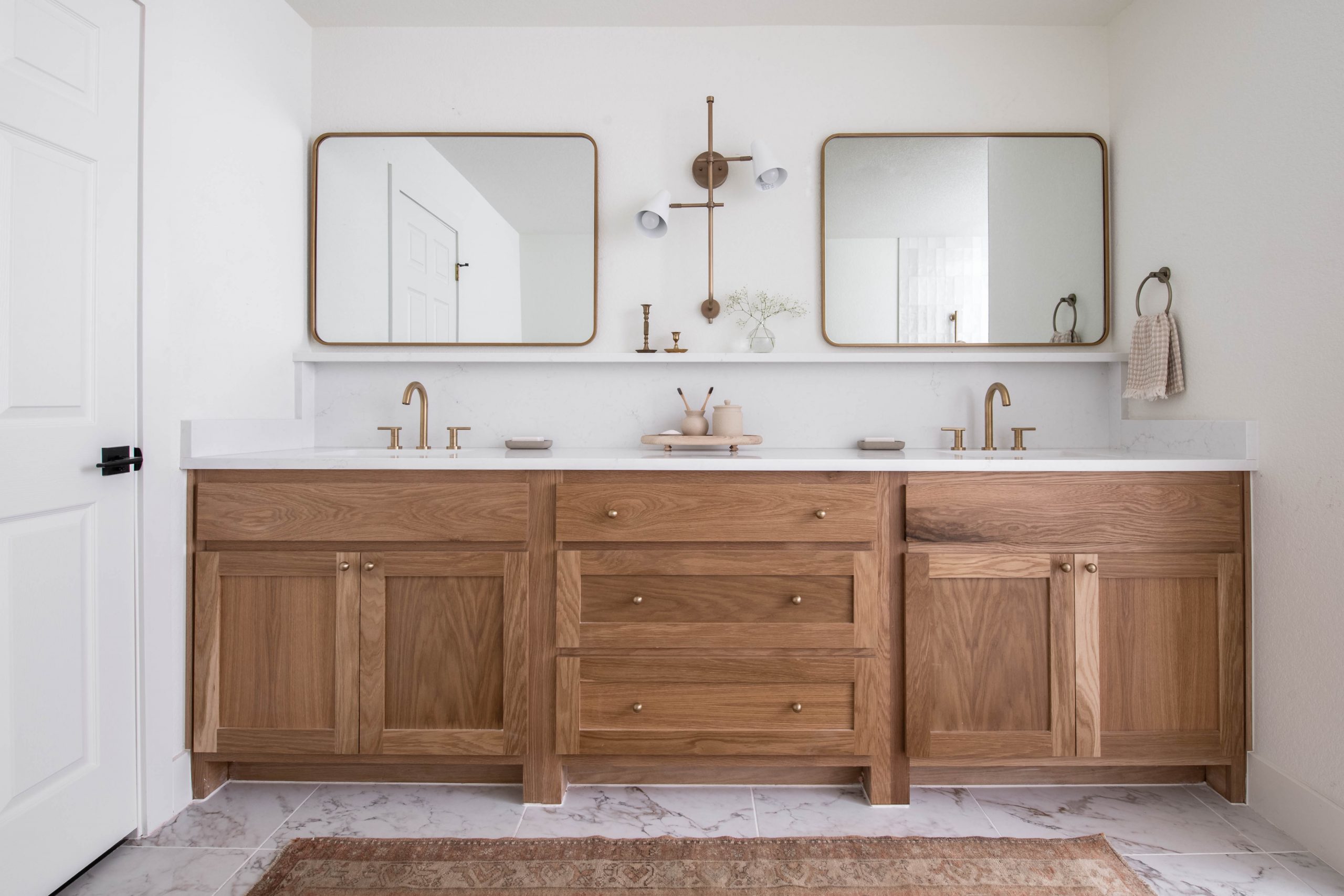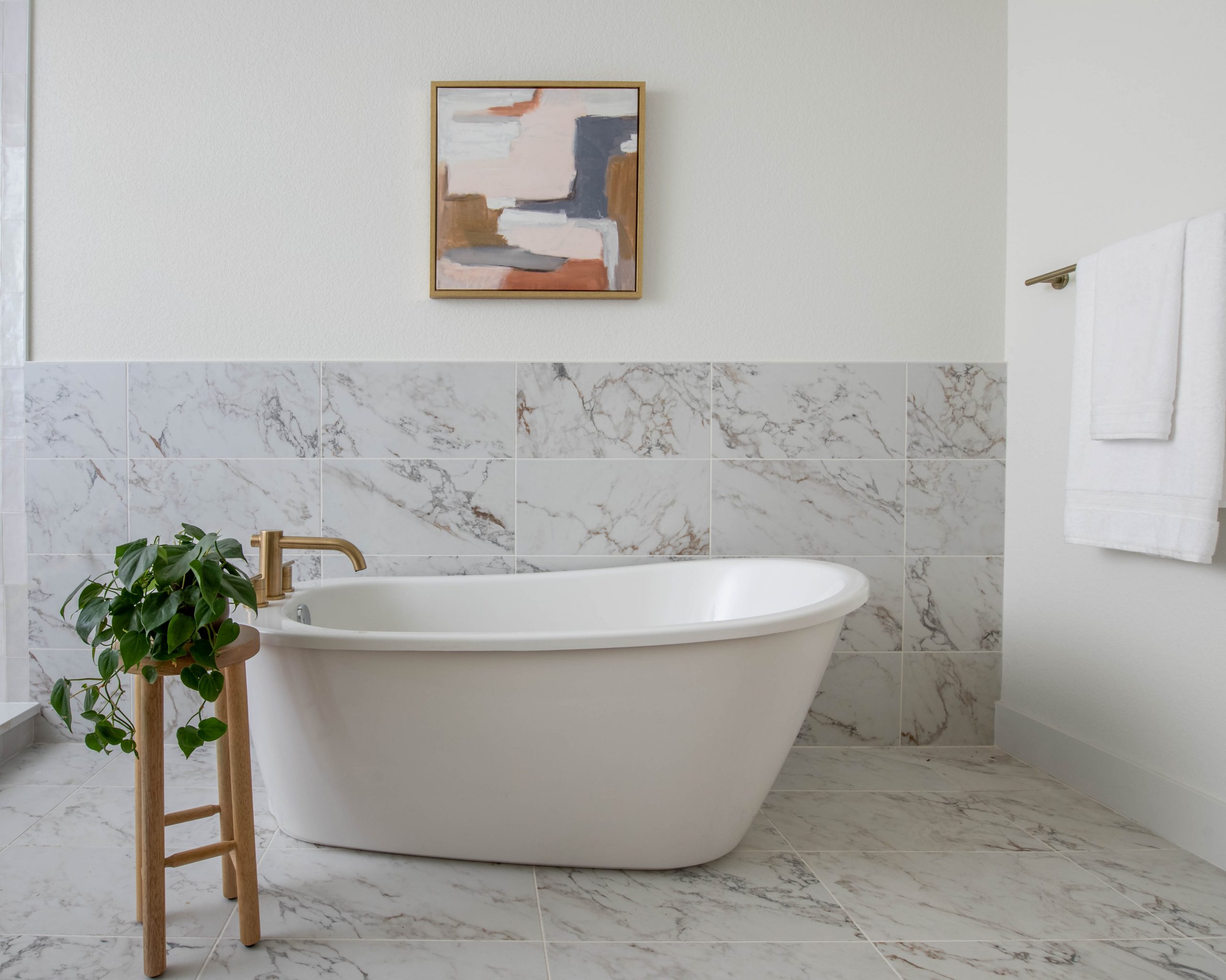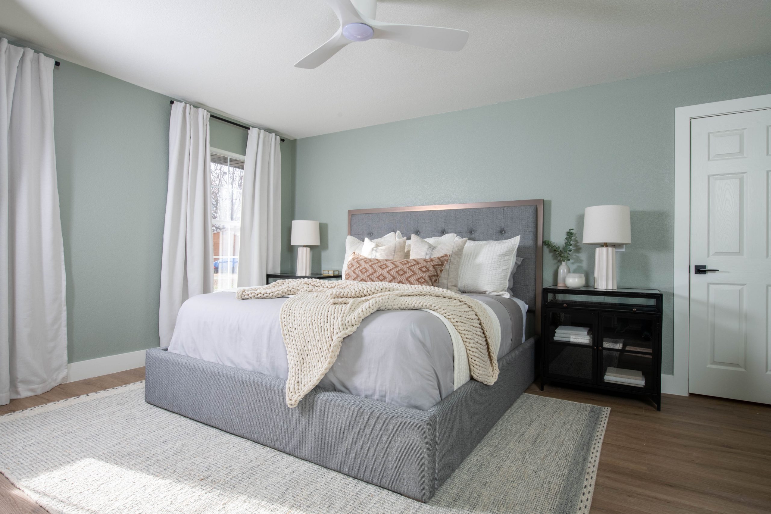 The main bedroom needed a simple refresh. A new coat of paint gave the room peaceful, calming effect. We also added new flooring and a huge closet for Hannah and Dustin. The biggest change was the bathroom. This bathroom was so typical of the 1990s and early 2000s when we used to leave a huge open space in the middle of the bathroom to make it seem so luxurious! It was easiest to just gut it all and start over with a clean slate. The large space allowed us to install a free-standing bathtub, a double vanity and a walk-in shower. I love how the large porcelain tile gives off a Calcutta marble feel.