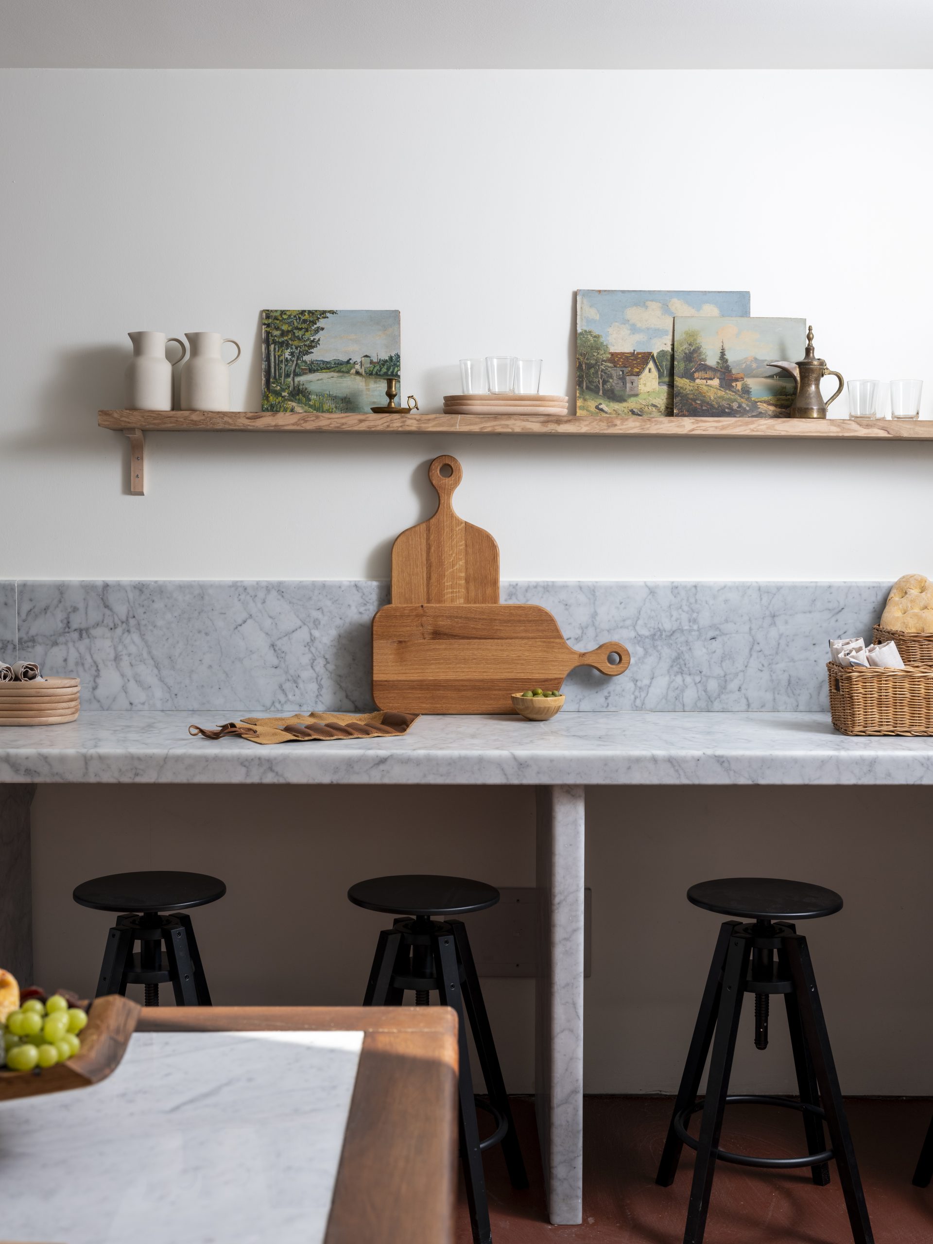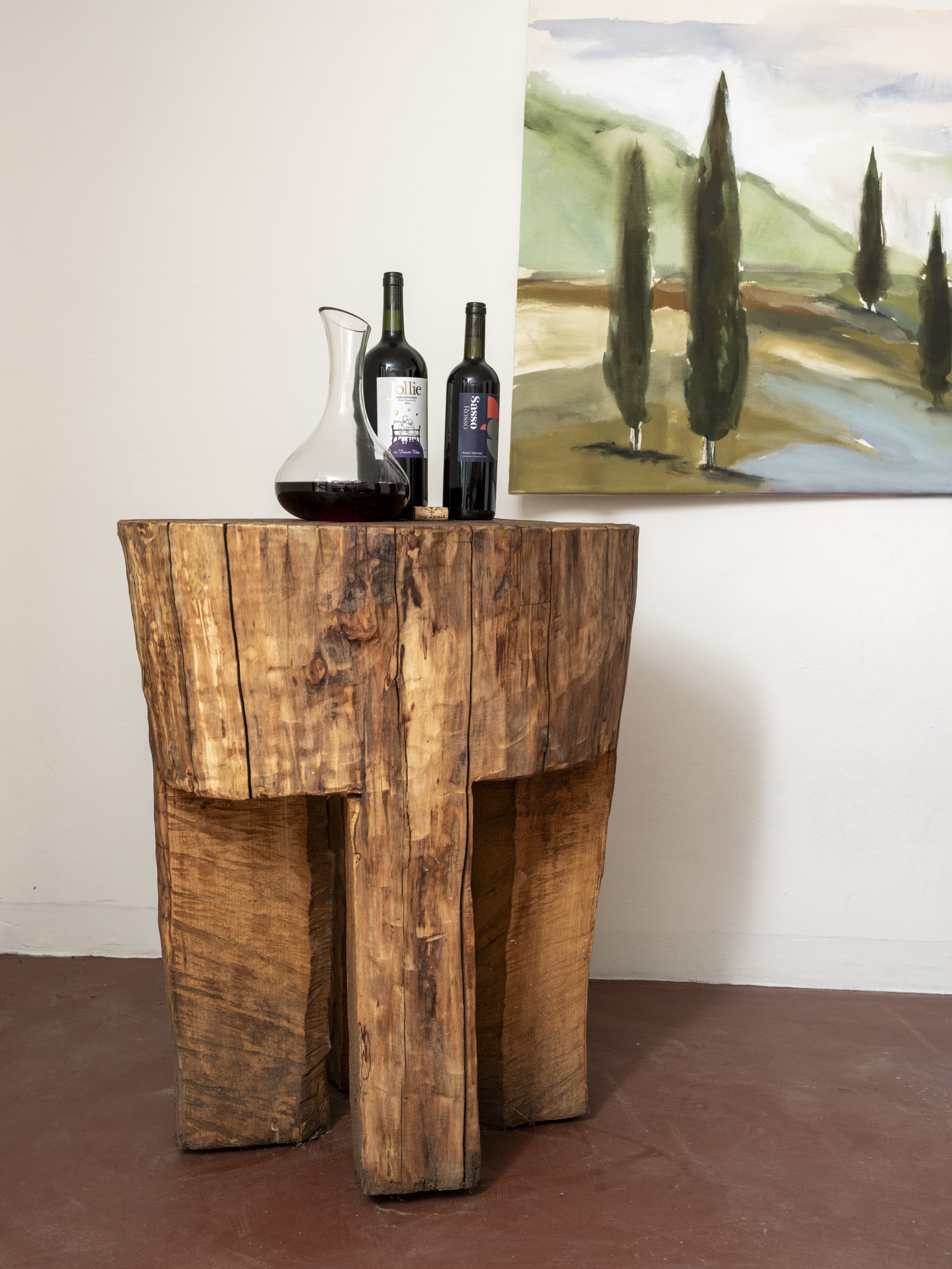 We worked with a local ironsmith to build out the iron and glass doors leading to the aging cellars and installed adjustable shelving, along with a highly technical humidity and temperature monitoring system. The front room will now serve as a tasting space, complete with a gorgeous marble sink and work station, a tasting table and a character-laden wooden table Dave hand-carved out of an old tree stump.