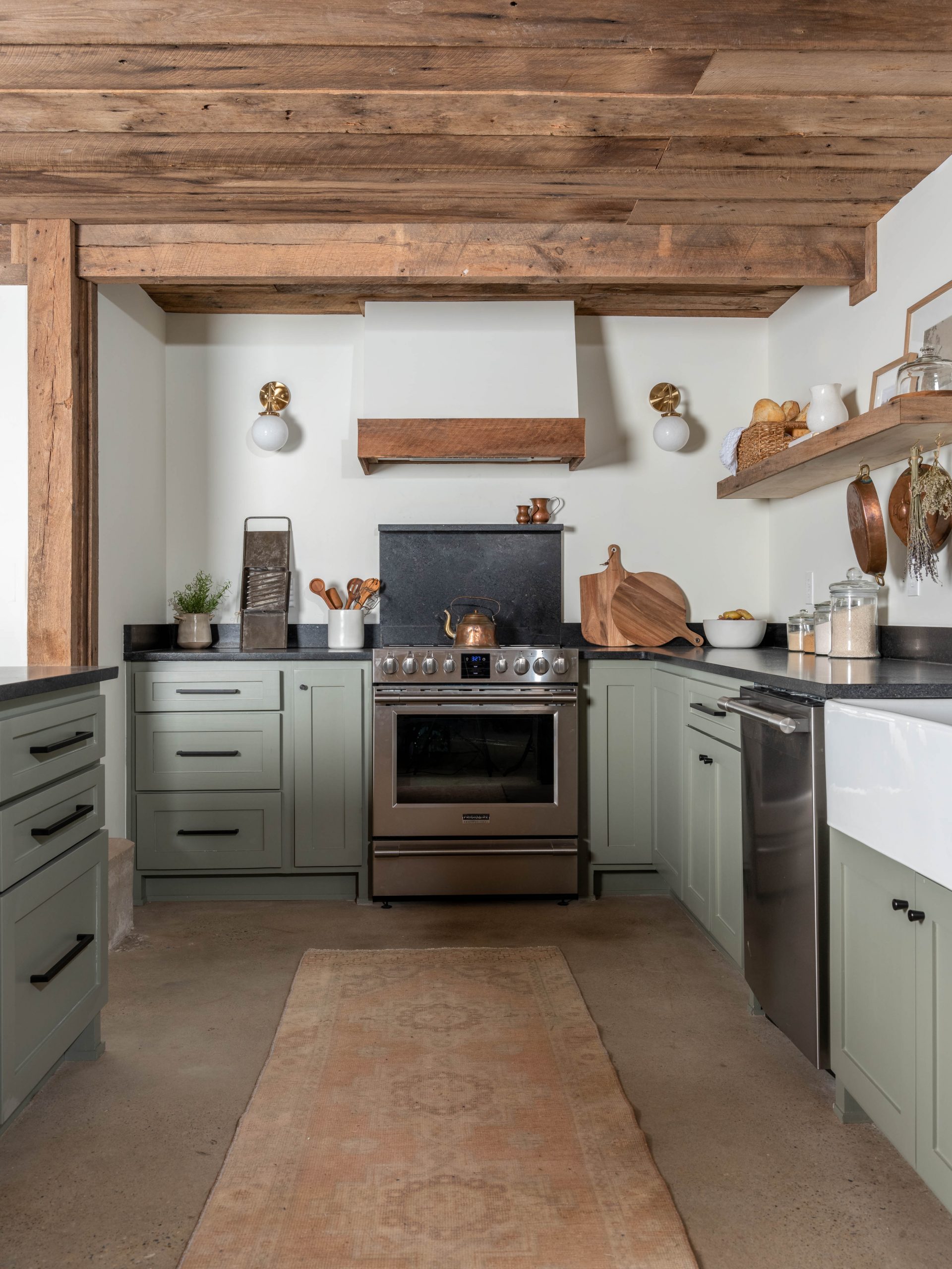 As Mike noted, you don’t see too many barns with a dishwasher. Very true! This open concept kitchen turned out beautifully warm and welcoming! We installed stainless steel appliances but balanced the modern look of them with the super warm and cozy feel of the barn’s repurposed wood on the ceiling. For the cabinets, we chose a pretty, green paint color that makes the kitchen feel fun and inviting, and the barn wood wrapped around the hood ties it all together. There’s plenty of space for cooking and gathering.