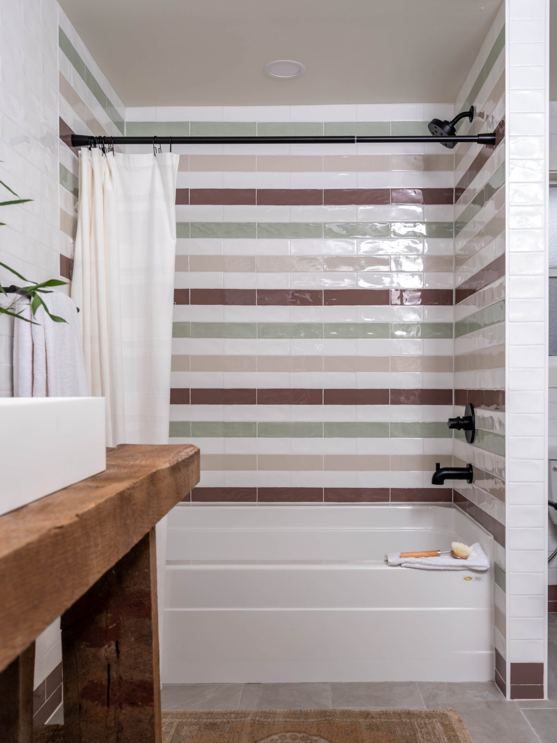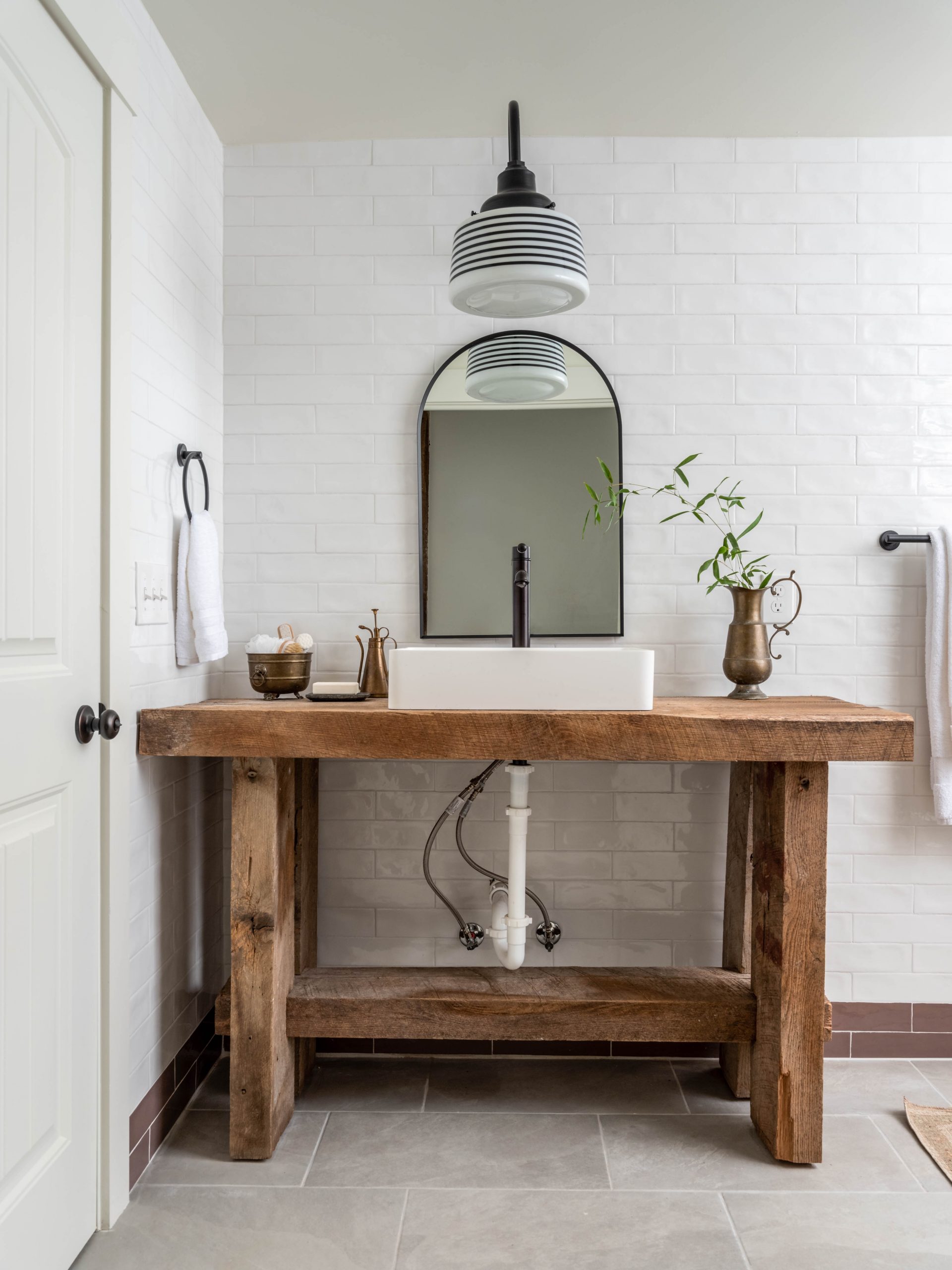 This was another spot in the house where I felt we could be quirky and fun. Dave built a gorgeous custom vanity with a sink. On that wall, we kept to classic all white subway tile. To balance out the rustic look of the wooden vanity, we installed a stripe pattern with different muted colors of subway tile on the shower wall. Not too crazy, but still unique. I ordered a light fixture with some character, and I think it all tied together perfectly.