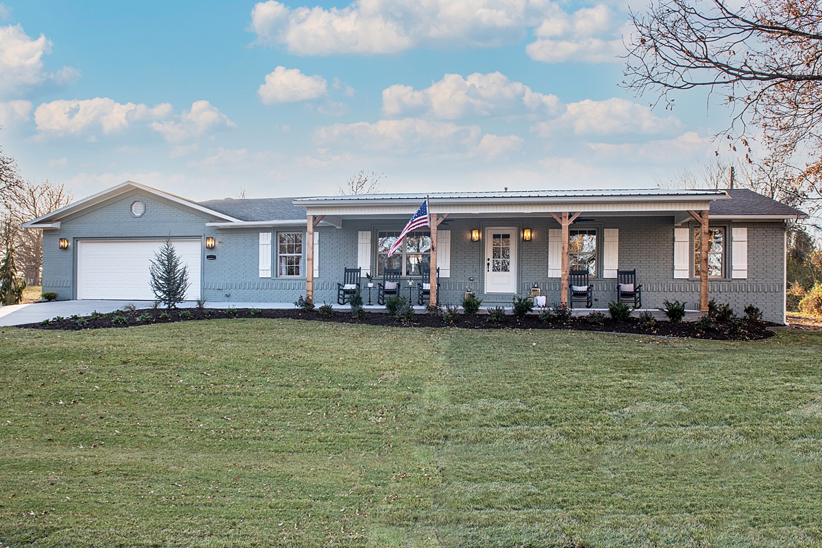 To get underway, we worked toward a consistent appearance and removed the stone framing the garage, replacing it with brick. By painting all the brick a soft, warm blue with undertones of gray, we gave the exterior a refined farmhouse look.