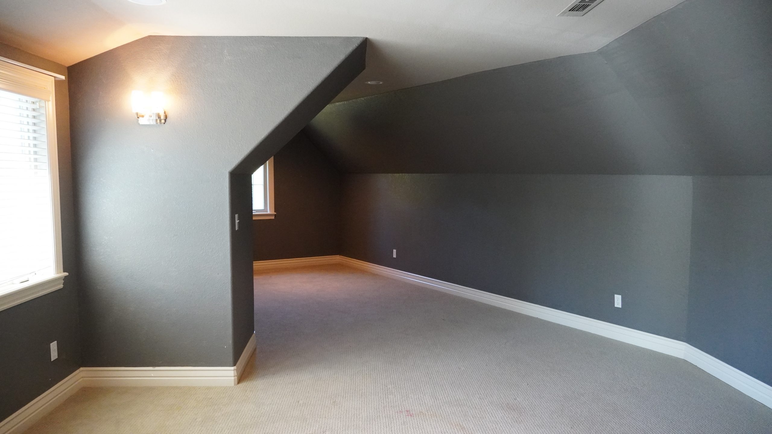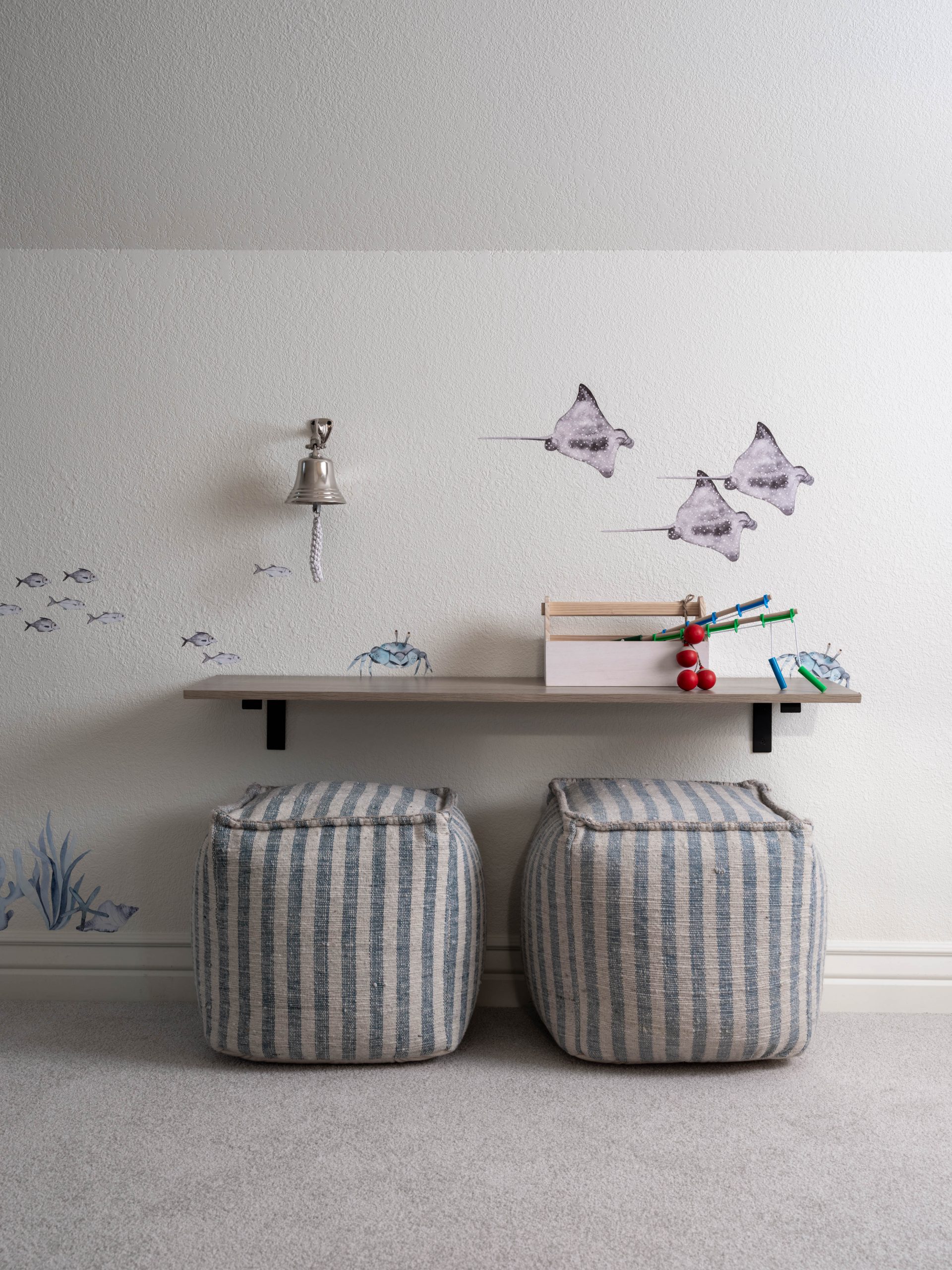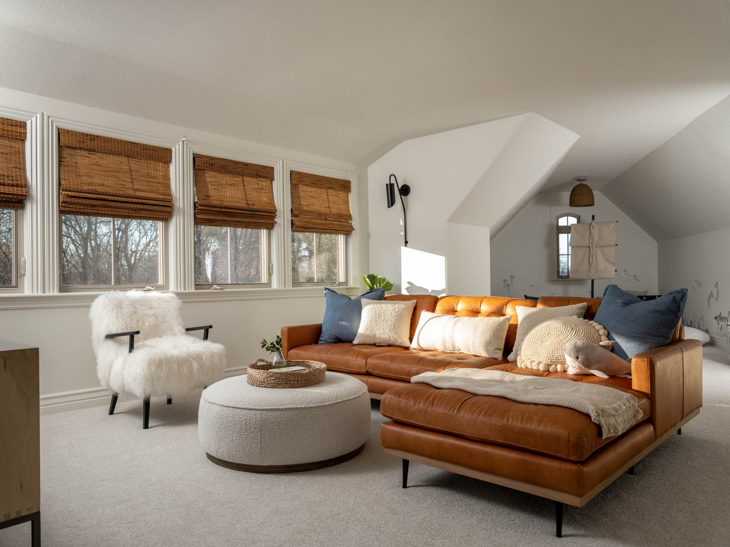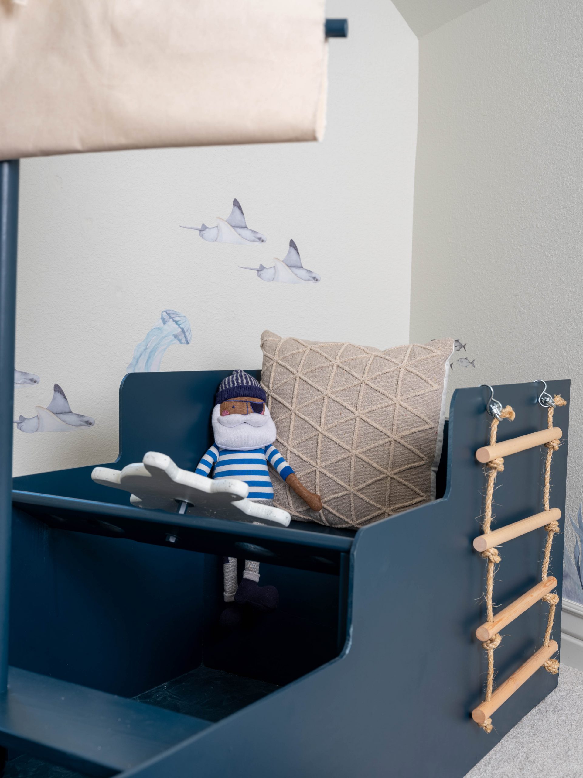 What a fun space to fix up! I love working with unexpected rooms that have unusual angles. The room had been originally painted a dark blue all around which had given it a cavernous feel. It was easy to freshen it up with new carpet, lighter paint and some fun sea animal decals. Dave built an amazing pirate ship play area for Finley that Luke tested out and approved. We also added a little built-in table for Finley to color or maybe build Legos when he’s a little bigger. For the larger, front part of the room, we maximized the space by turning it into a comfy TV viewing area.