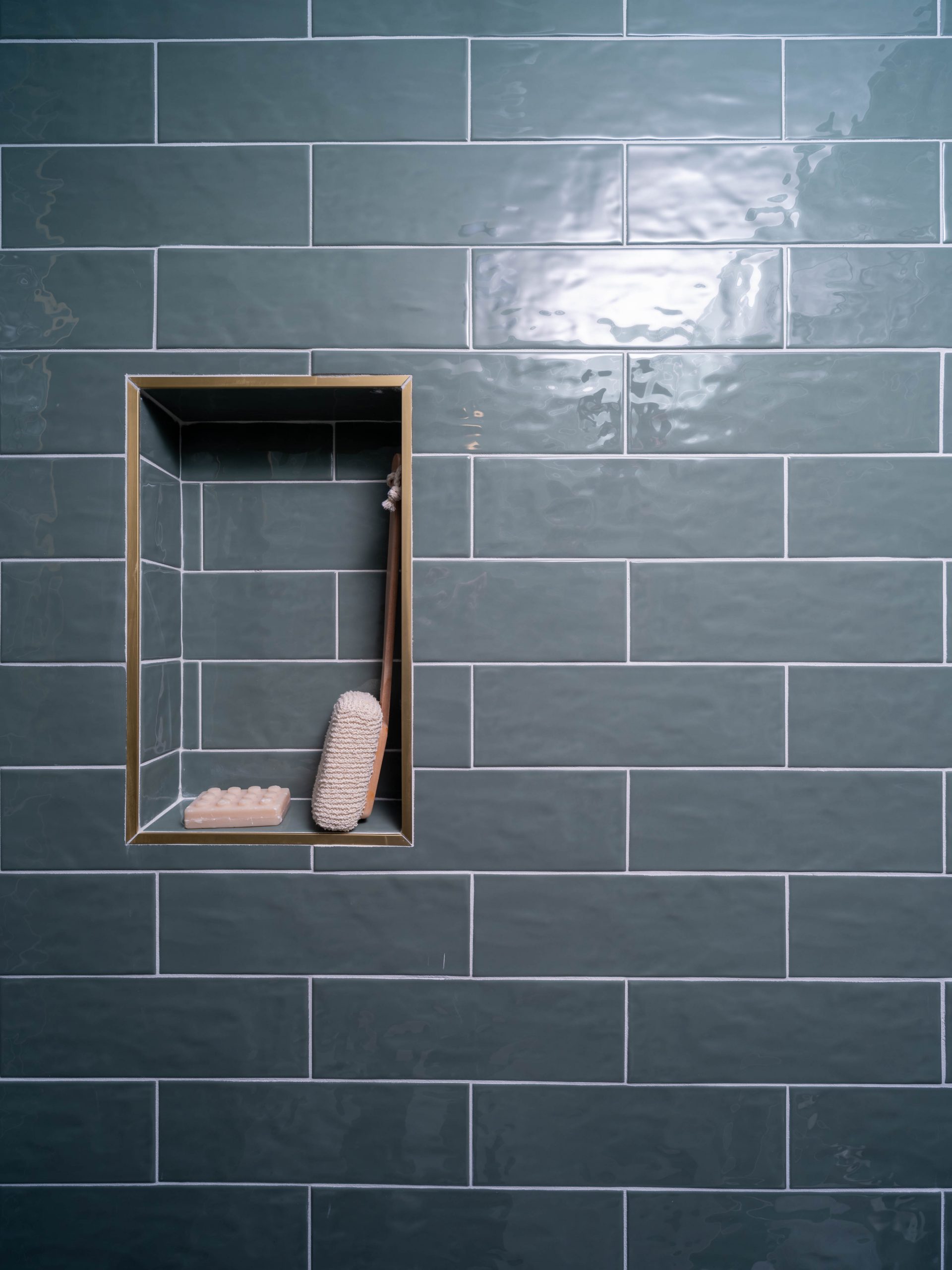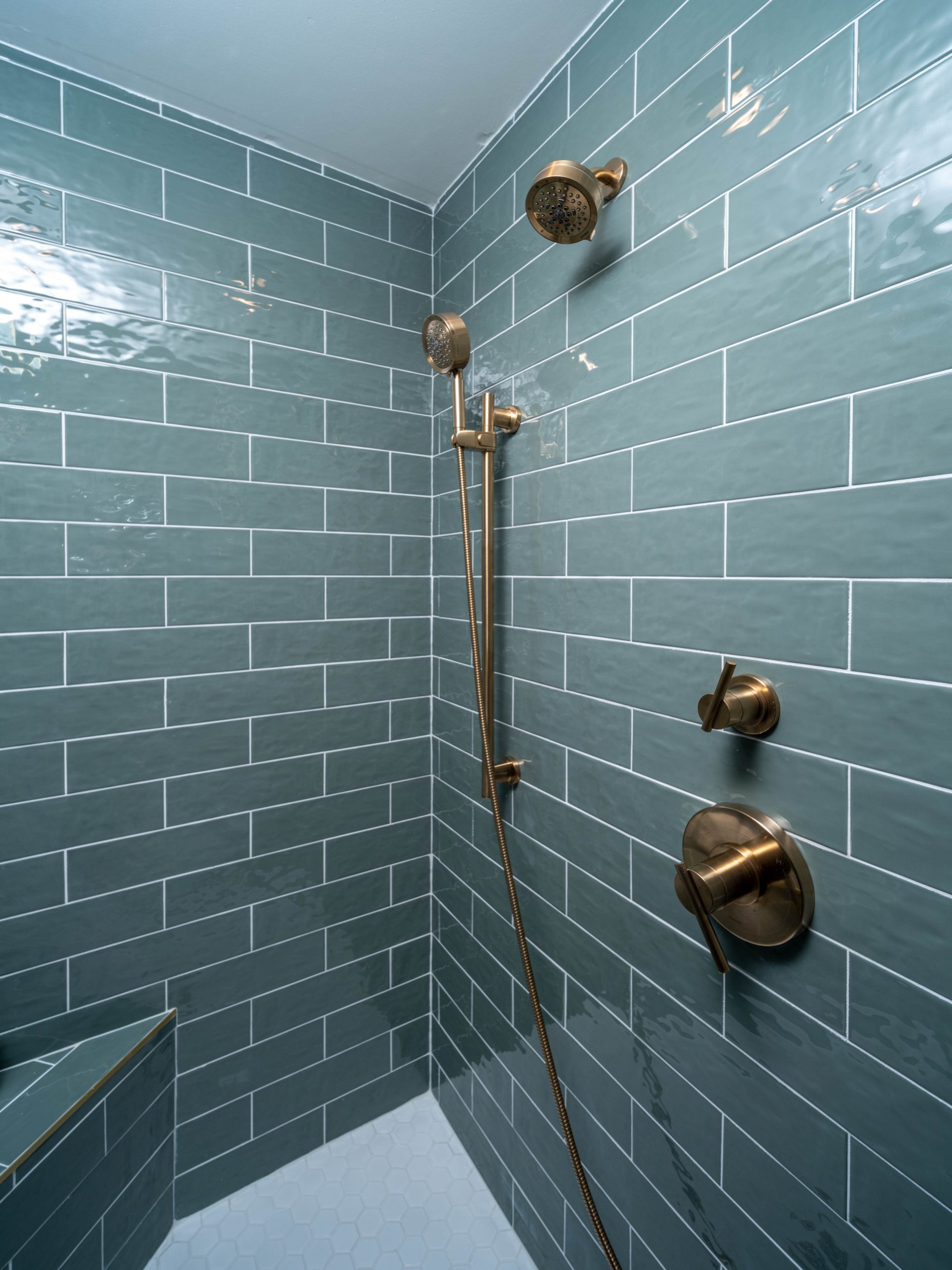 The bathroom was a little bit more work. There was a lot of tile to remove, including some very well-installed crown molding tile. We installed new flooring and light colored vanities with quartz countertops for a sleek look. The green tiles make the shower feel so serene, and the special-ordered handmade bathtub adds a luxurious modern touch to a traditional bathroom. I chose silver fixtures for the bathtub and brass for the shower and sinks. It’s OK to mix metals; different shades can still look cohesive and modern if you do it right.