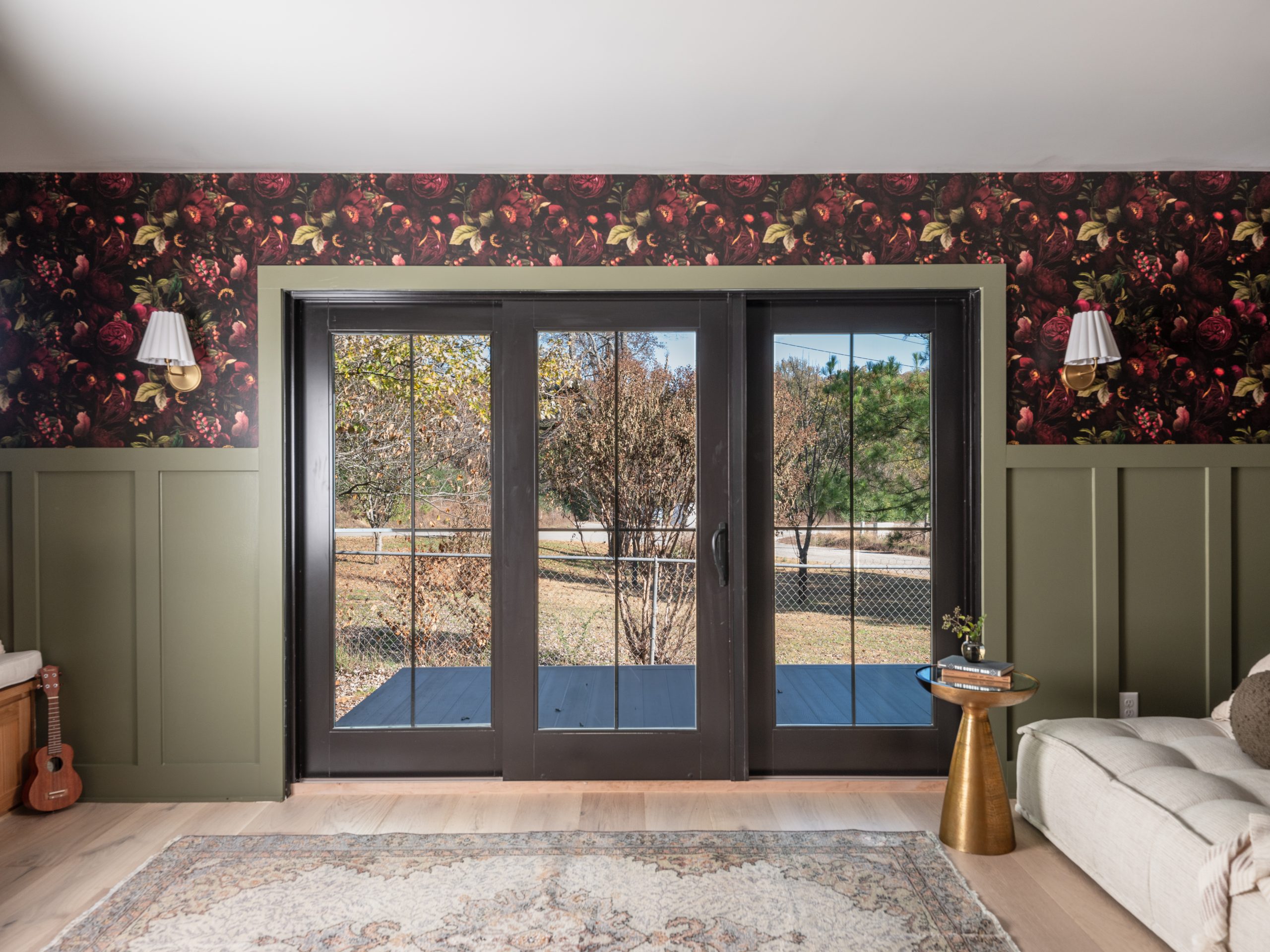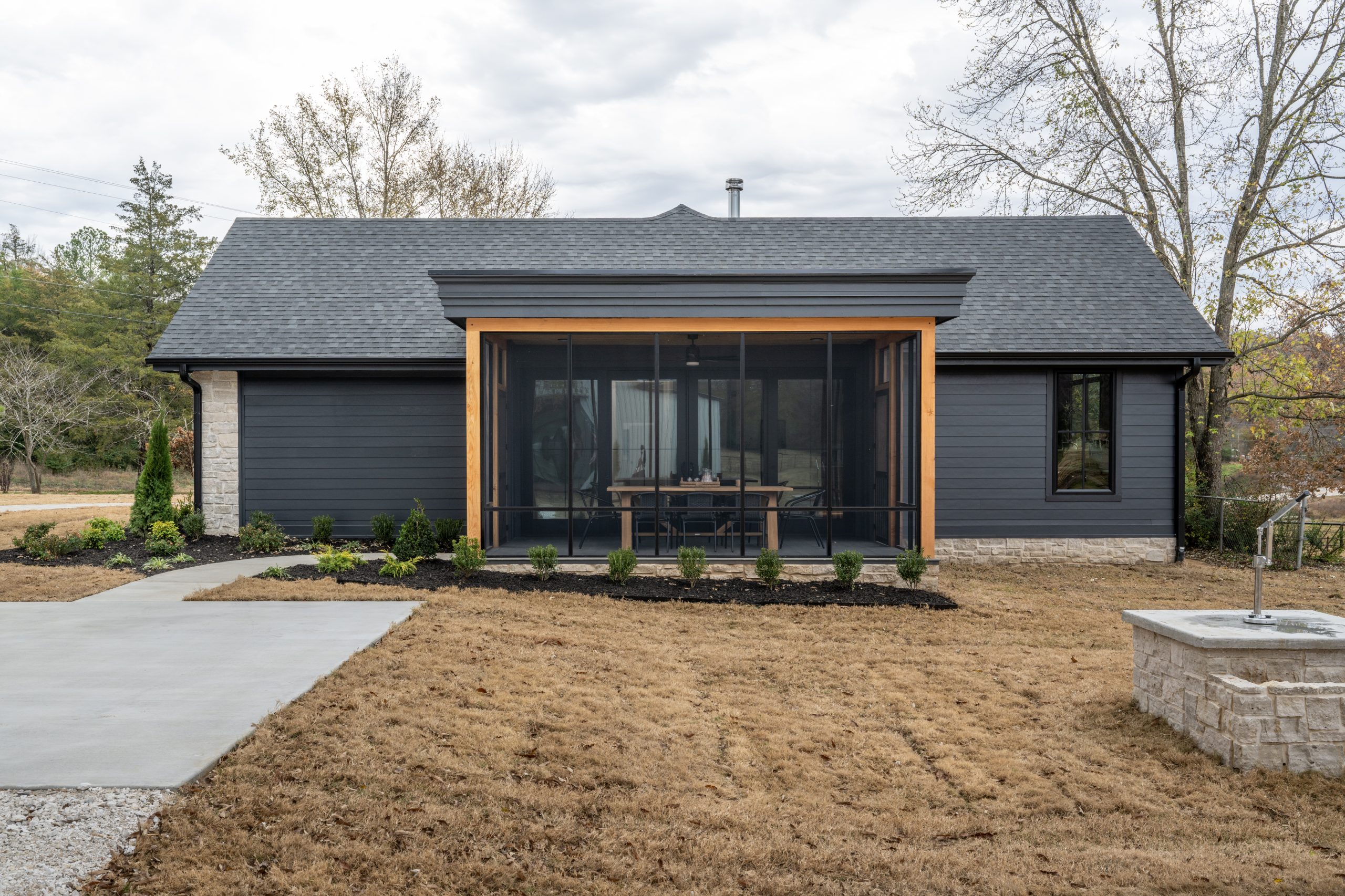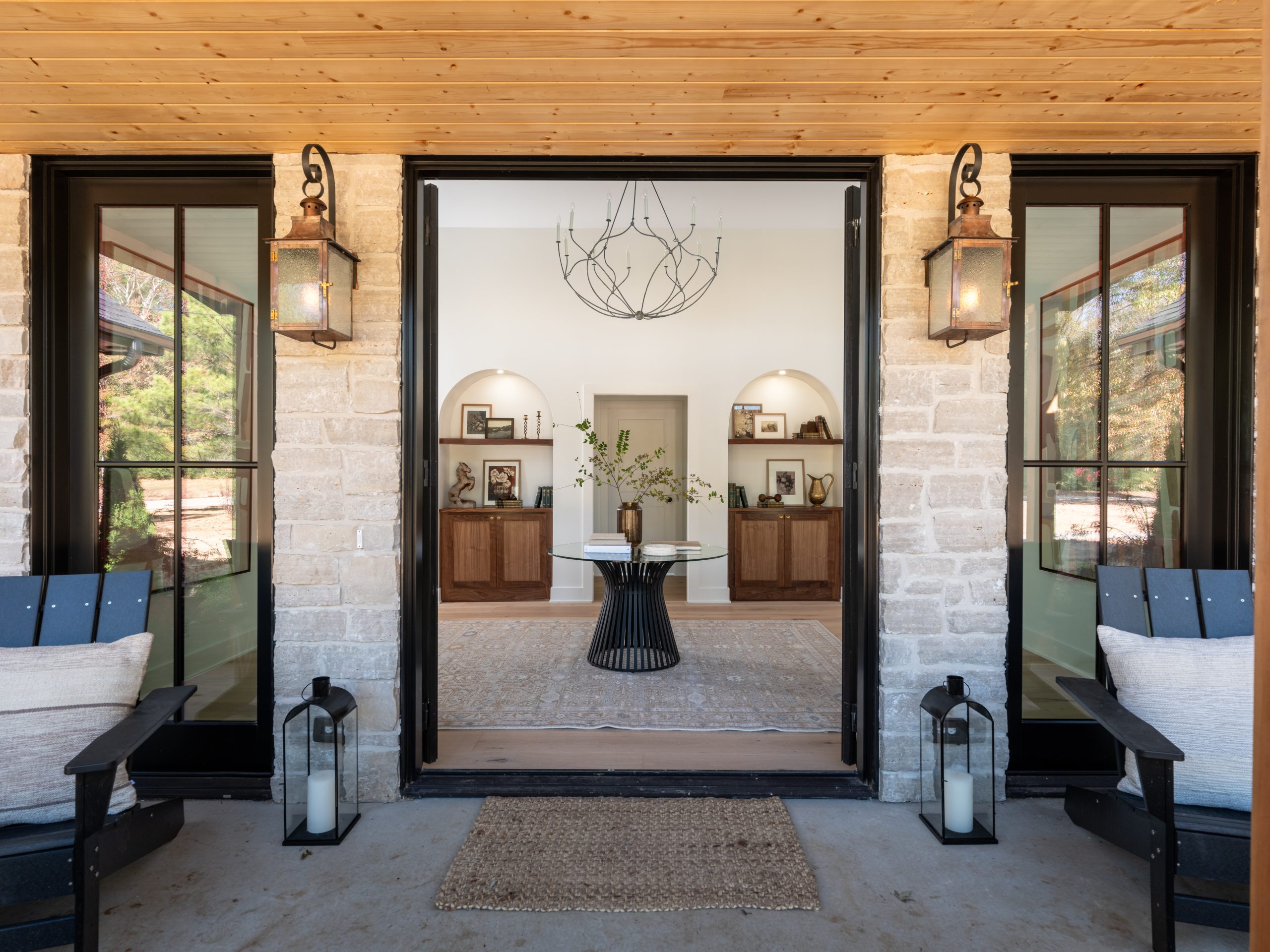 To the right of the living room, we added a covered deck for outdoor seating and dining. It gets buggy here in Arkansas, so it’s always nice to have a screened-in patio. We elevated the look of the patio to match the house by adding wood paneling and recessed lighting to the ceiling, as well as black trim to the walls.