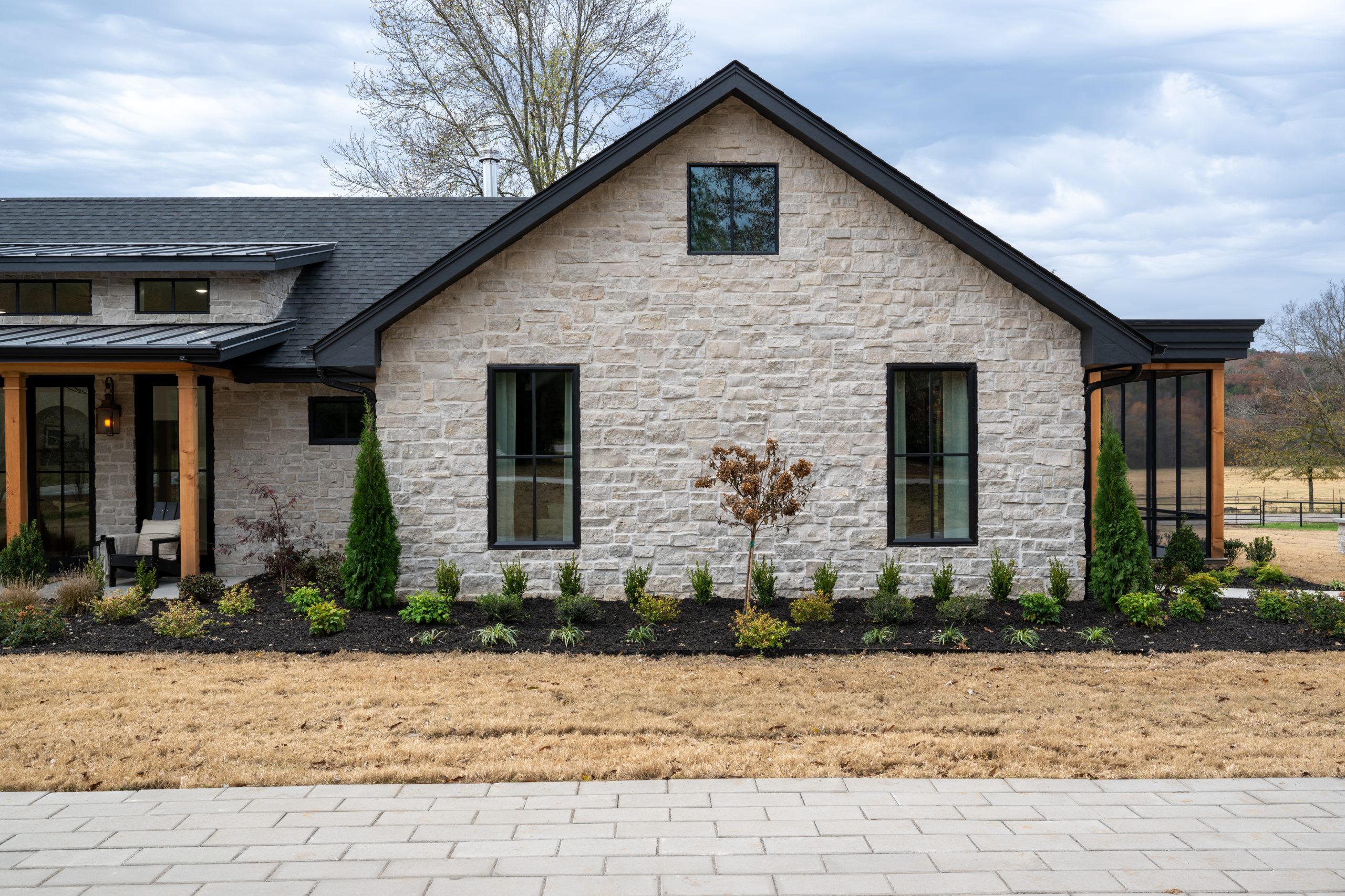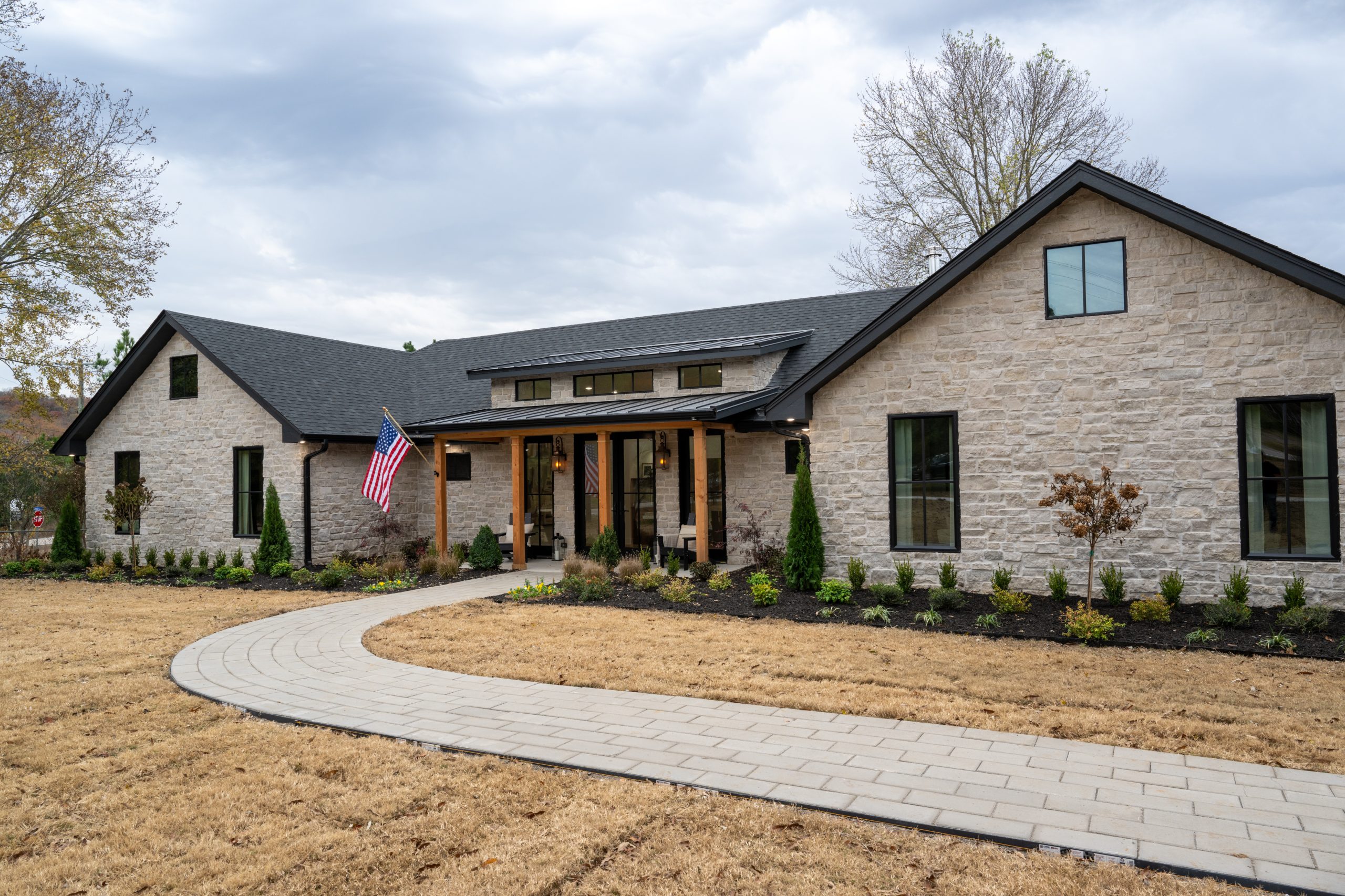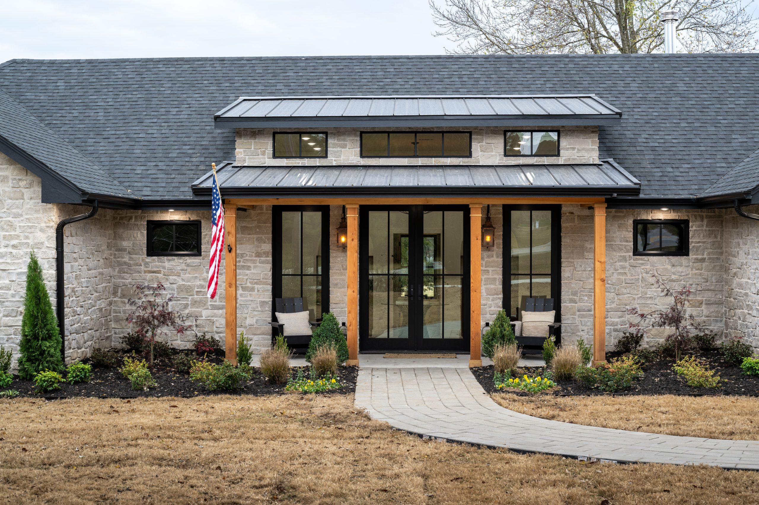 Before the renovation, this home didn’t feel like a reflection of Gabby’s happy personality and her glam style. So, we completely revamped the exterior (and the interior) to make it more modern, while still keeping the home’s southern farmhouse charm. To do that, we added stone to the front exterior and gave the house large, black-framed windows, a black roof and a black metal dormer. Then, we grounded the look in southern charm with a cozy front porch and large wooden posts. New lighting, a new front door, new landscaping and a nice brick walkway to the front entrance complete this inviting look.