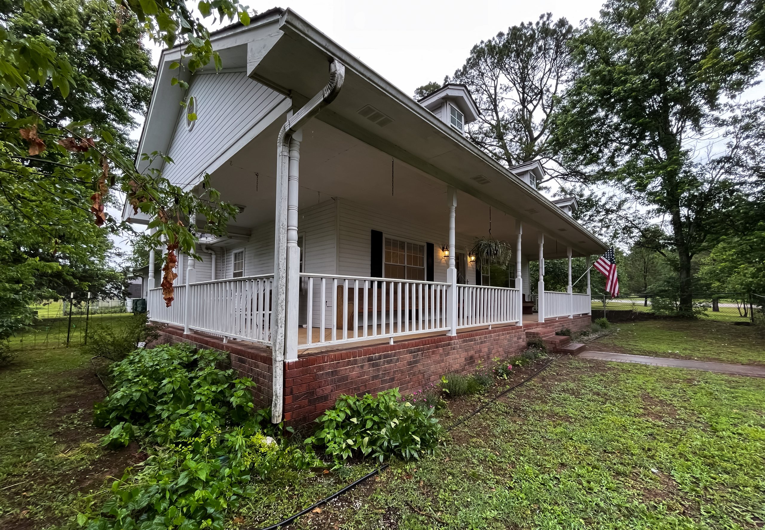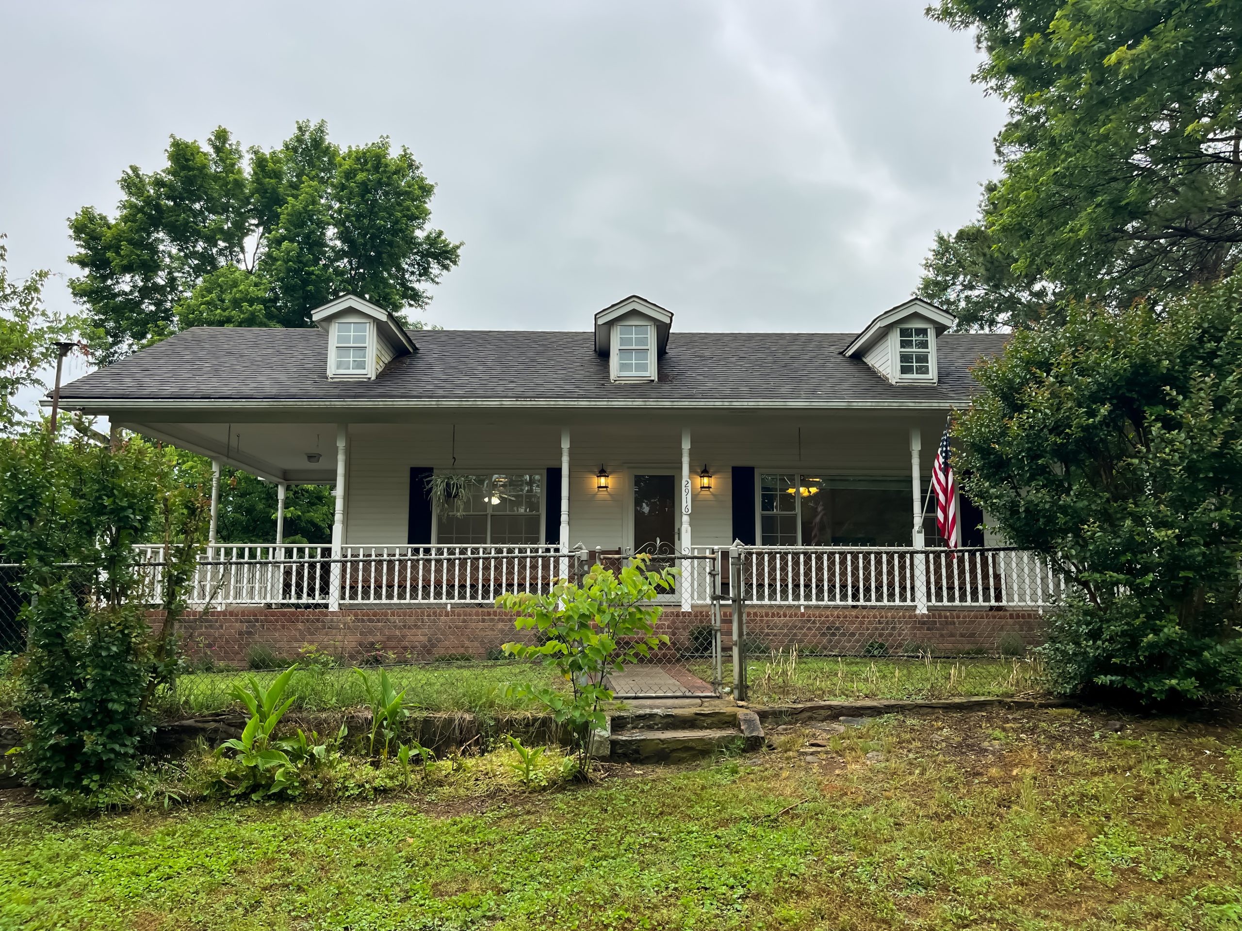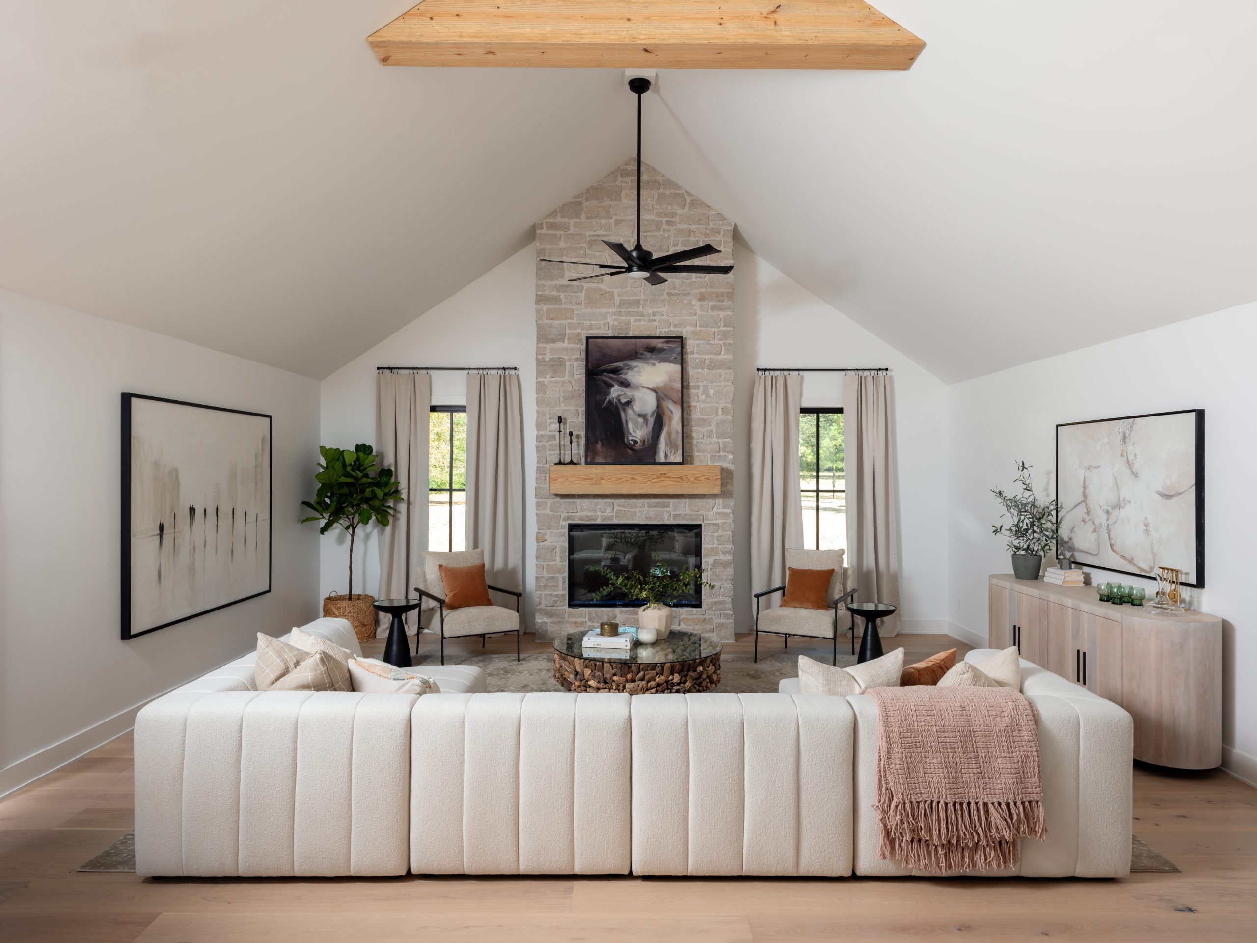 Before the renovation, this home didn’t feel like a reflection of Gabby’s happy personality and her glam style. So, we completely revamped the exterior (and the interior) to make it more modern, while still keeping the home’s southern farmhouse charm. To do that, we added stone to the front exterior and gave the house large, black-framed windows, a black roof and a black metal dormer. Then, we grounded the look in southern charm with a cozy front porch and large wooden posts. New lighting, a new front door, new landscaping and a nice brick walkway to the front entrance complete this inviting look.