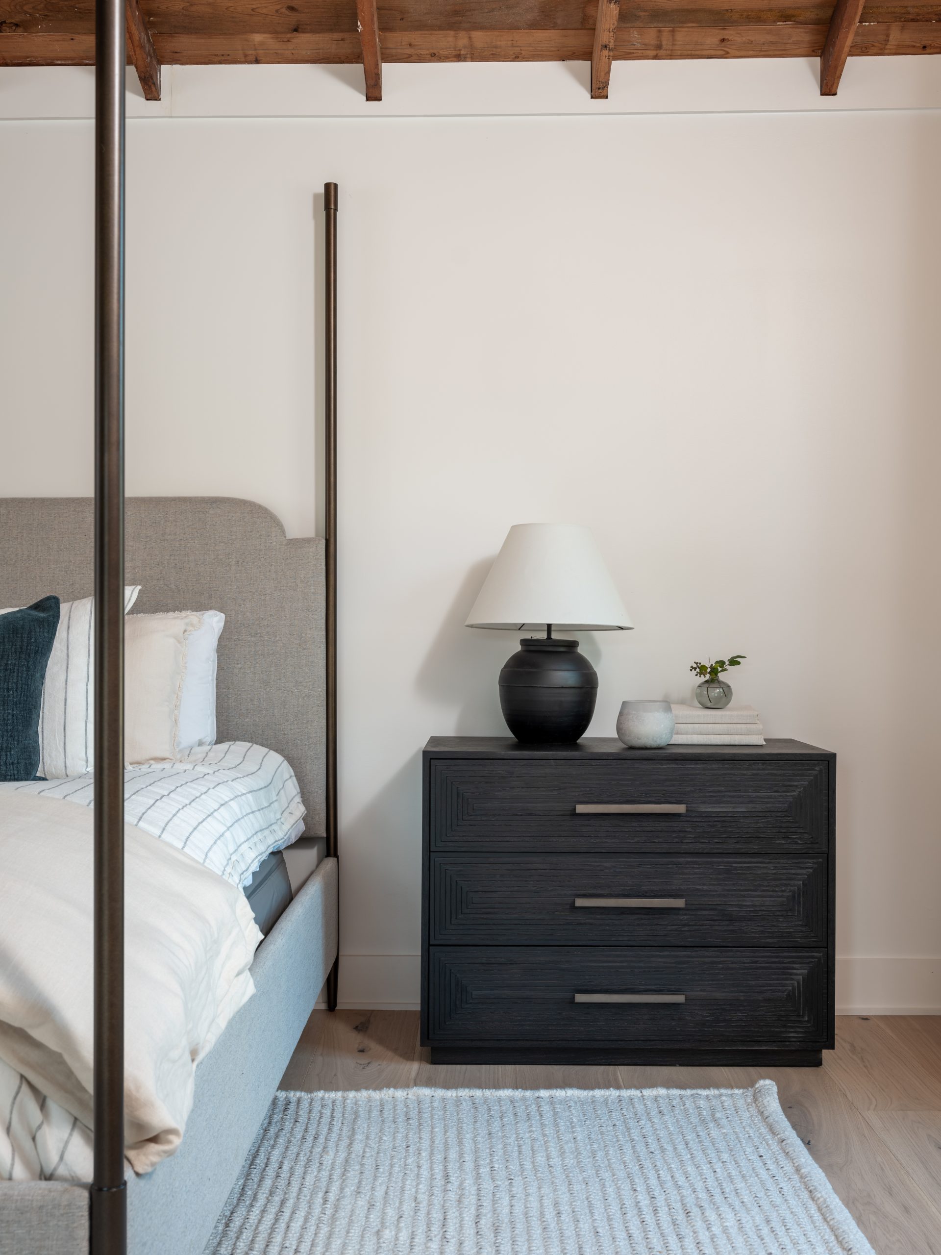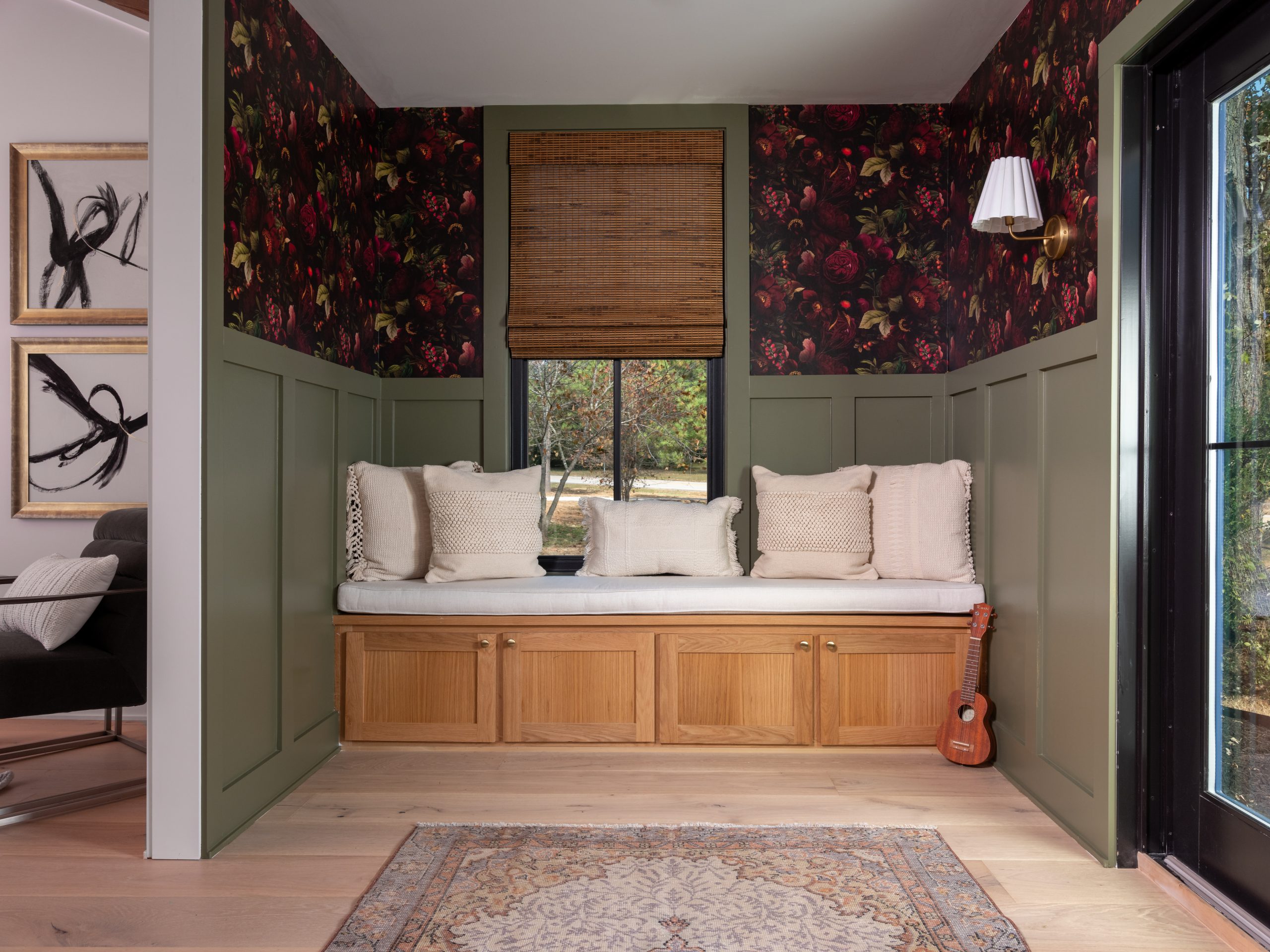 I’m so glad we were able to add insulation to the old porch and turn it into an indoor sitting room. This gave me a chance to add drama to the space with dark trim and bold wallpaper. It gives glamour to the bedroom. Plus, the built-in window seat makes for a cozy reading spot.