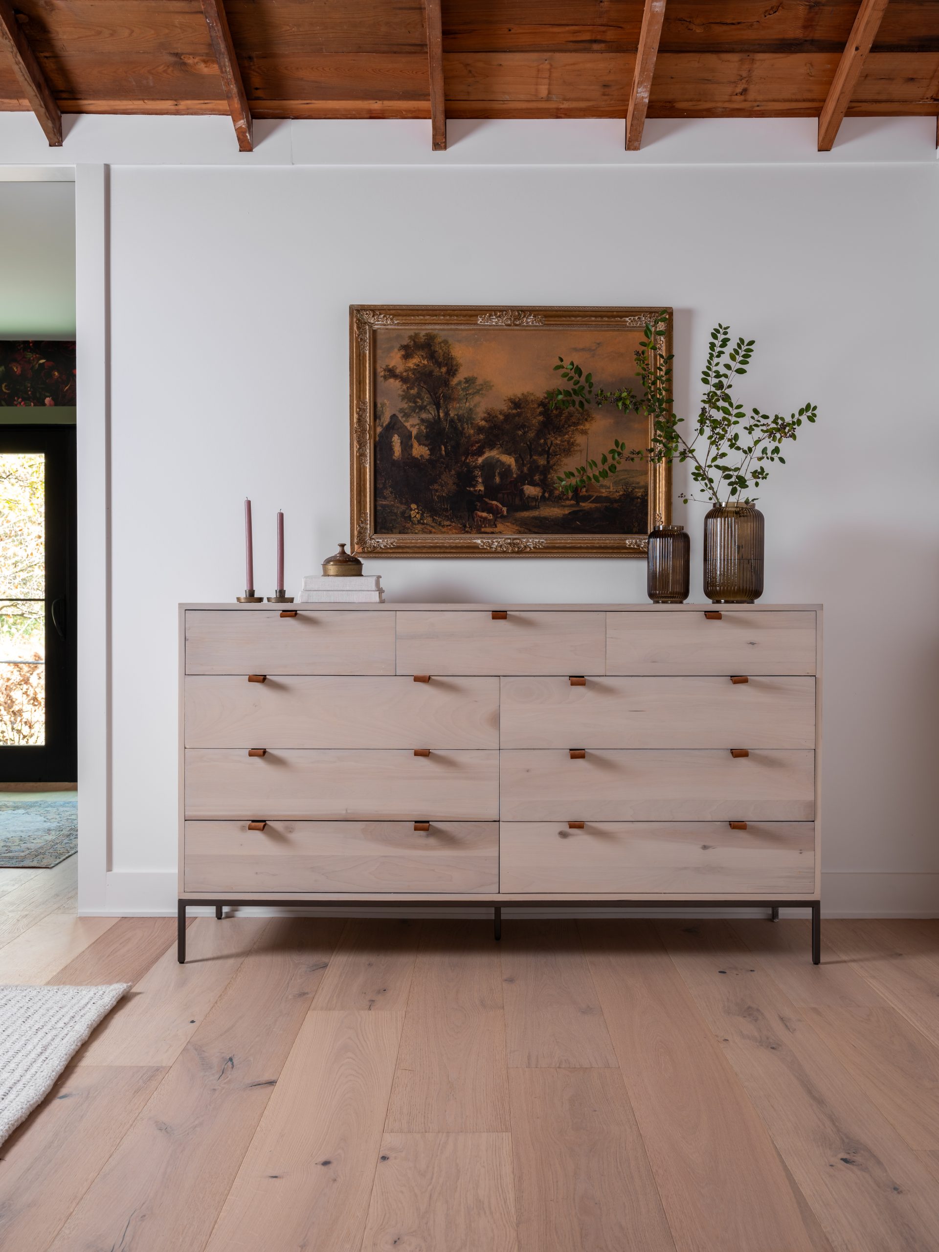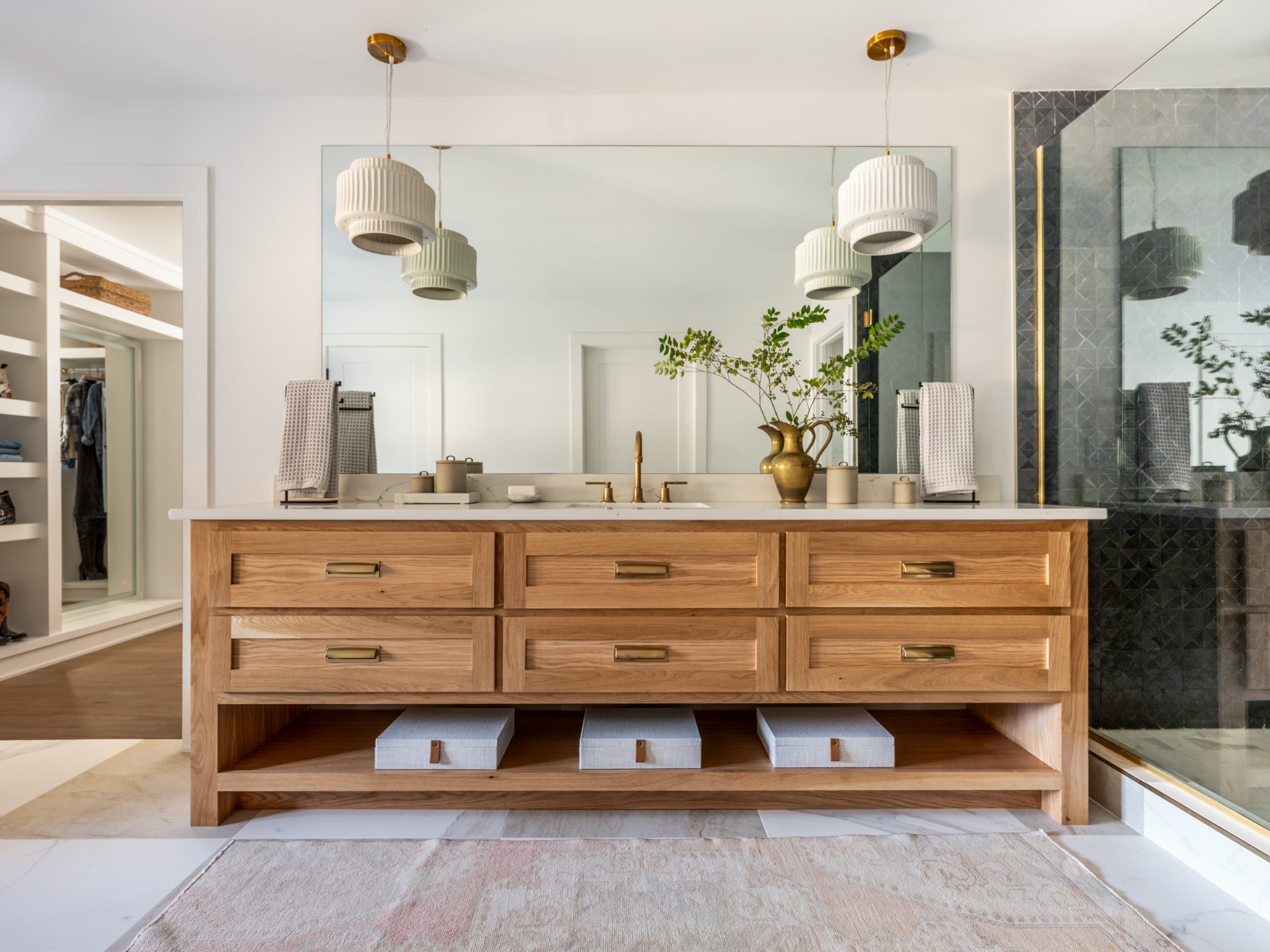 To add character in here, Dave built two beautiful cabinets within arched alcoves, using walnut from the family’s property. We added one of my absolute favorite chandeliers in here. It’s airy and modern and perfect in this beautiful space.