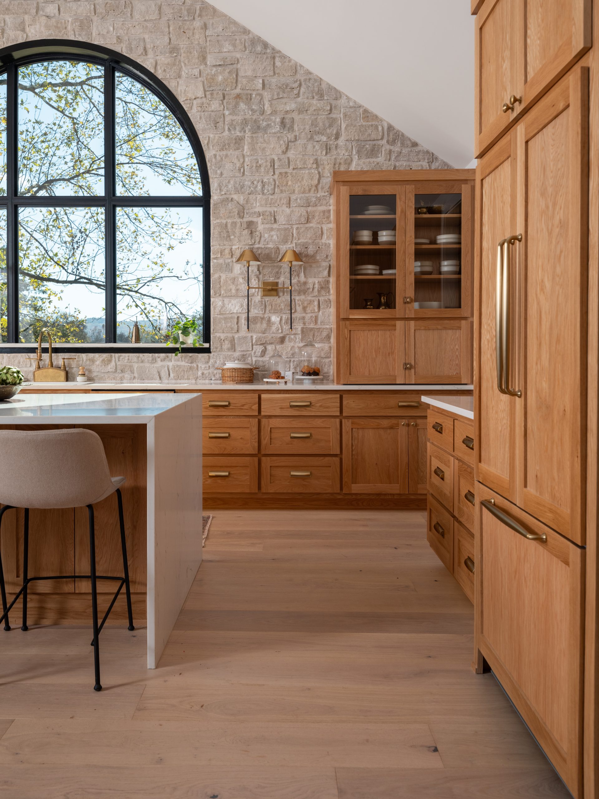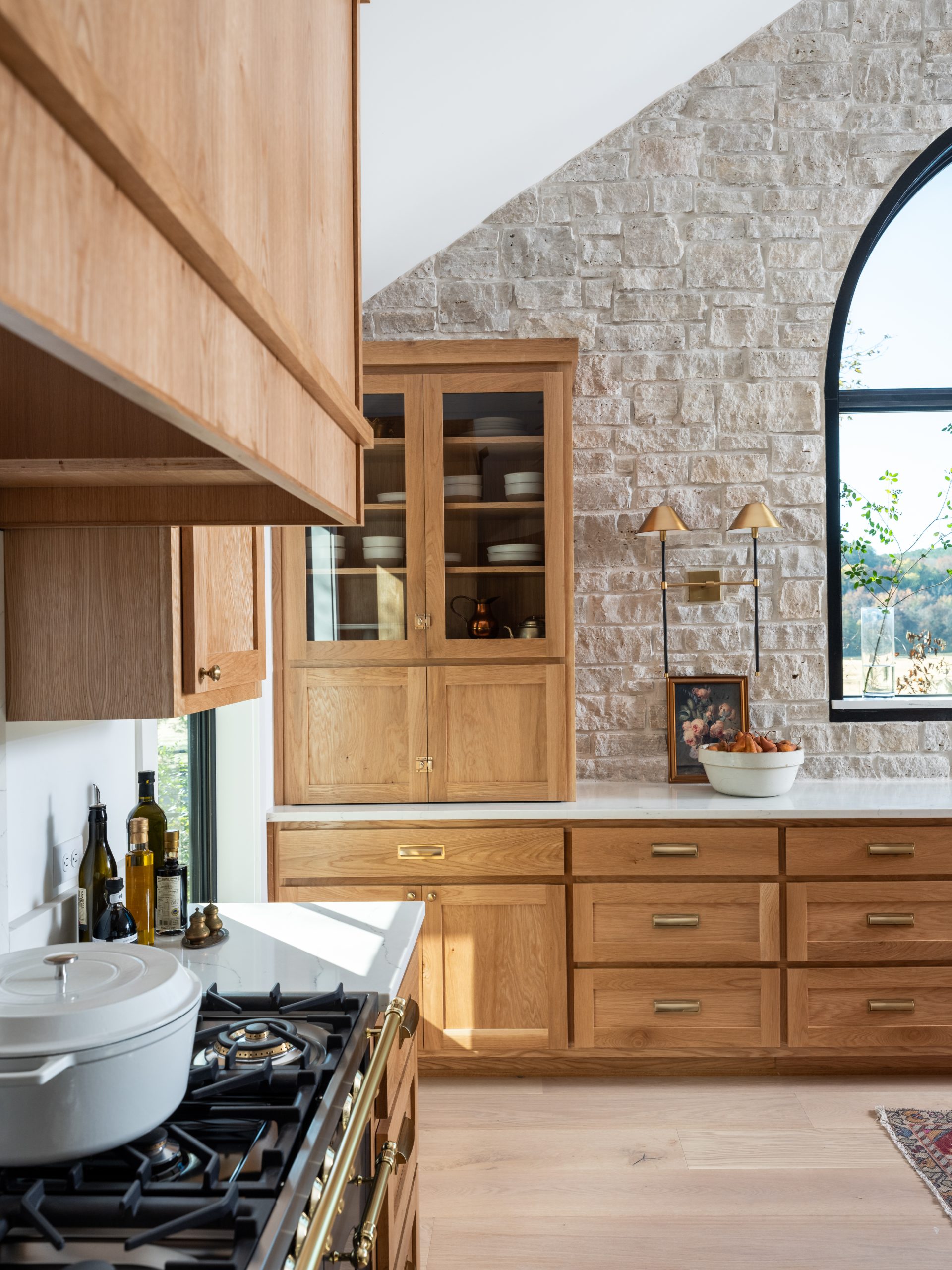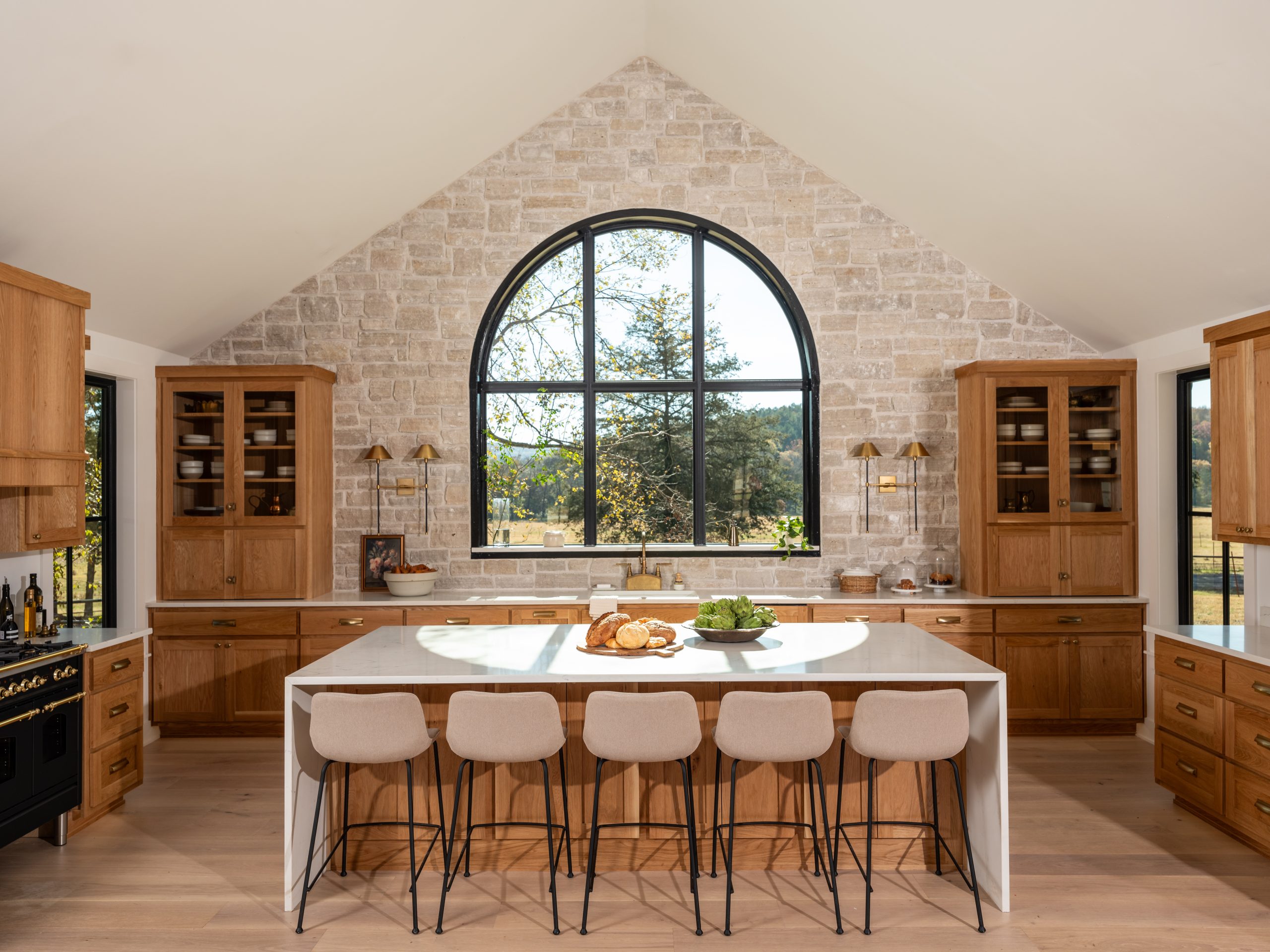 This kitchen. Where do I even begin??? The incredible arched window above the sink creates an incredible focal point with a gorgeous view and allows beautiful natural light to stream into the kitchen. Gabby loves stone (who doesn’t?!) so the stone backsplash wall was a perfect addition here. It also serves to bring the natural outdoors inside and creates a nice contrast with the white oak cabinetry and wide panel flooring. The cabinets, the dishwasher and the panel ready refrigerator are all covered in stunning white oak to allow the range to have its own moment. Together with the waterfall island, the gold hardware, gold sconces and my favorite handmade faucet, the kitchen has an elegant feel to it. Just off to the side in the kitchen, we added an old-fashioned wood-burning stone which Gabby really wanted. It helps to define the dining room and create a cozy feel in the space.