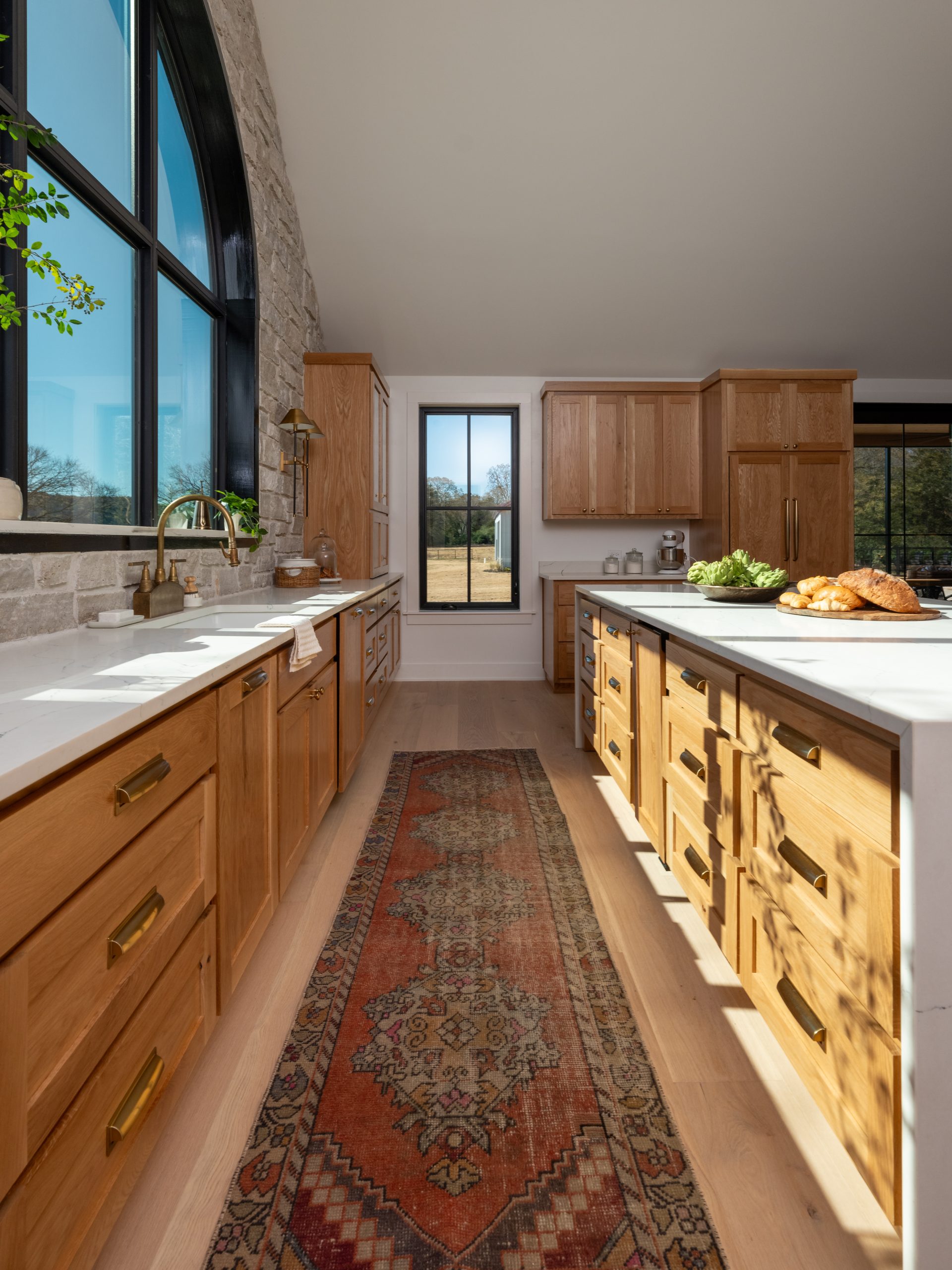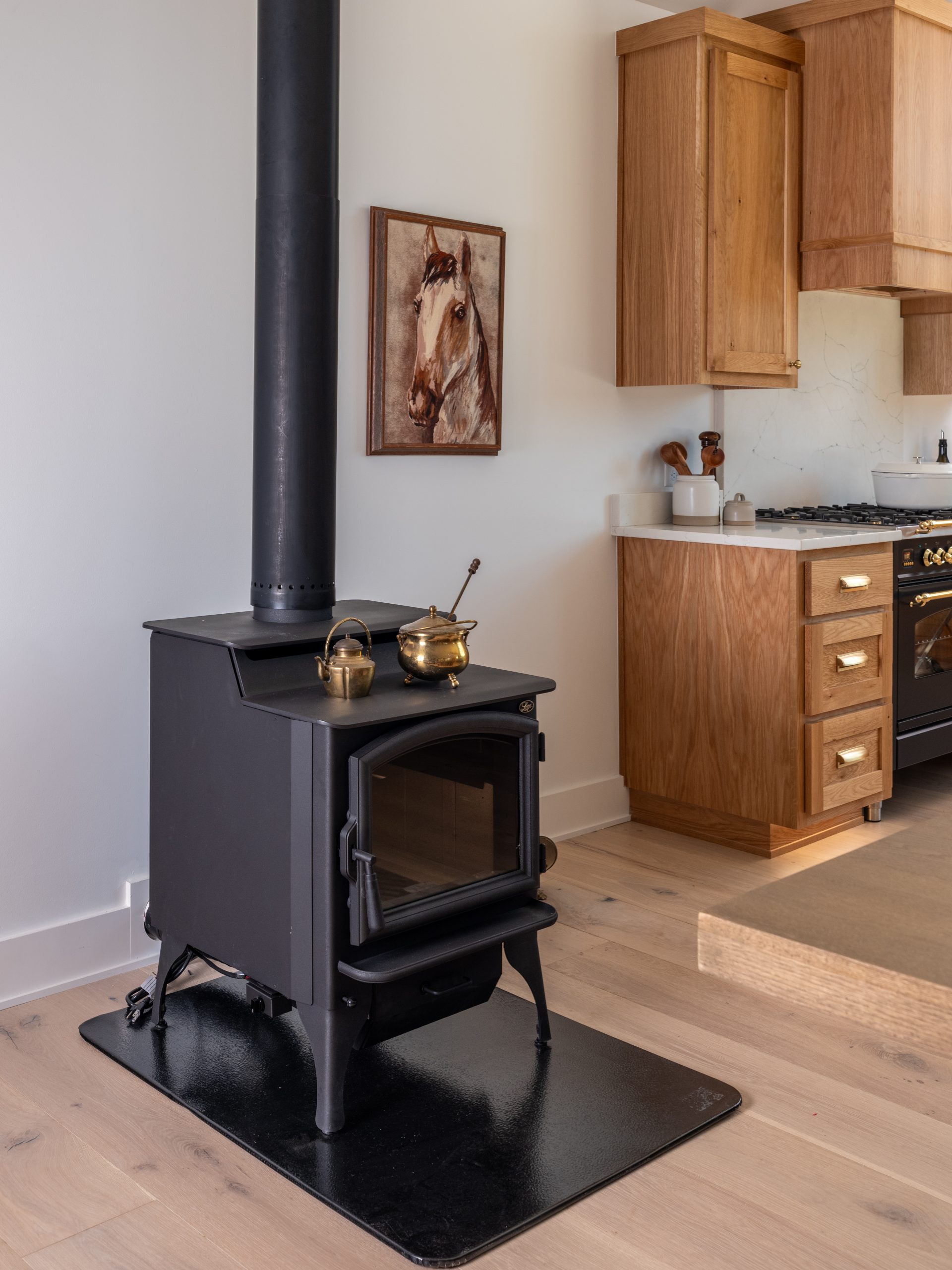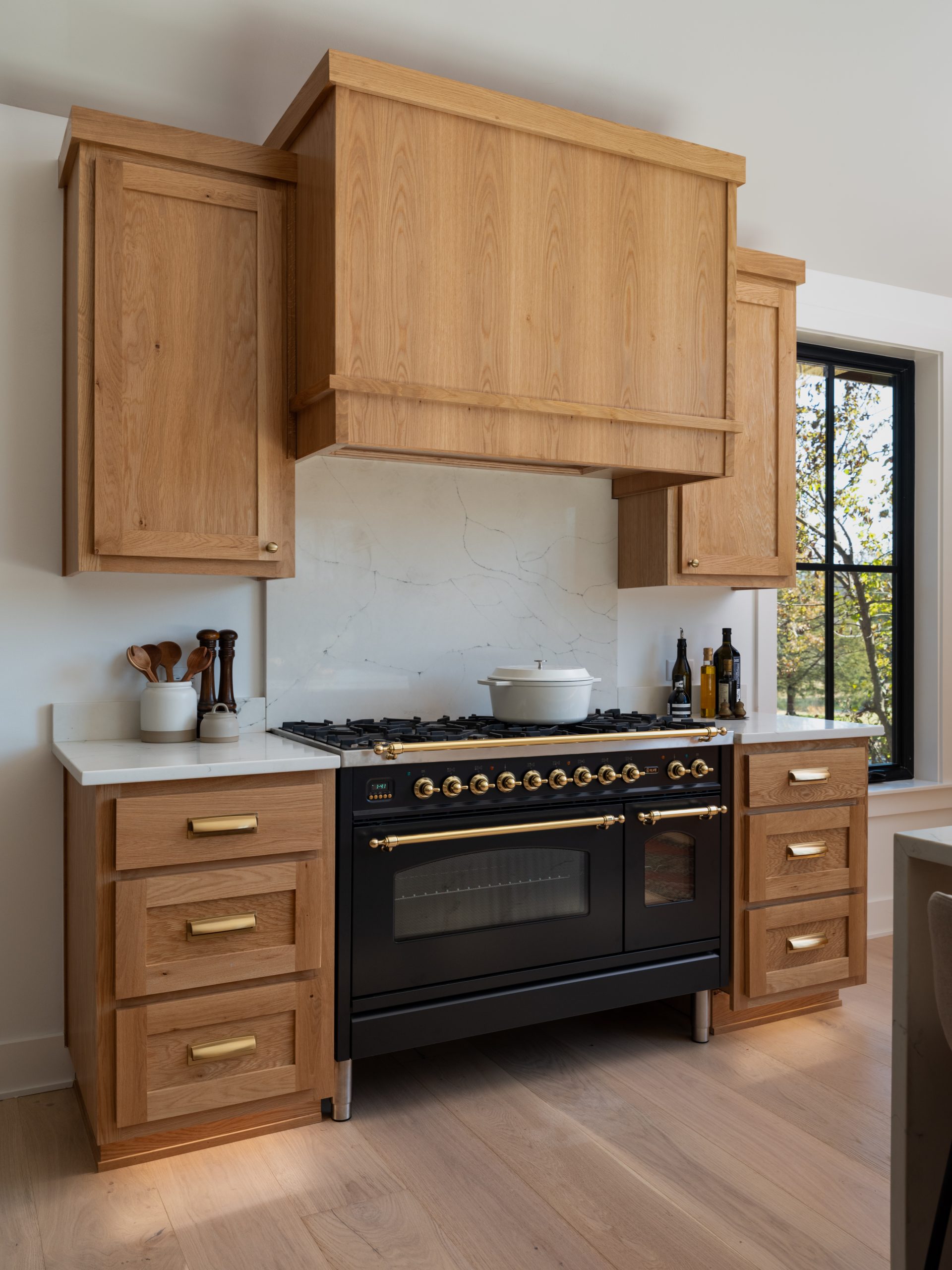 This kitchen. Where do I even begin??? The incredible arched window above the sink creates an incredible focal point with a gorgeous view and allows beautiful natural light to stream into the kitchen. Gabby loves stone (who doesn’t?!) so the stone backsplash wall was a perfect addition here. It also serves to bring the natural outdoors inside and creates a nice contrast with the white oak cabinetry and wide panel flooring. The cabinets, the dishwasher and the panel ready refrigerator are all covered in stunning white oak to allow the range to have its own moment. Together with the waterfall island, the gold hardware, gold sconces and my favorite handmade faucet, the kitchen has an elegant feel to it. Just off to the side in the kitchen, we added an old-fashioned wood-burning stone which Gabby really wanted. It helps to define the dining room and create a cozy feel in the space.