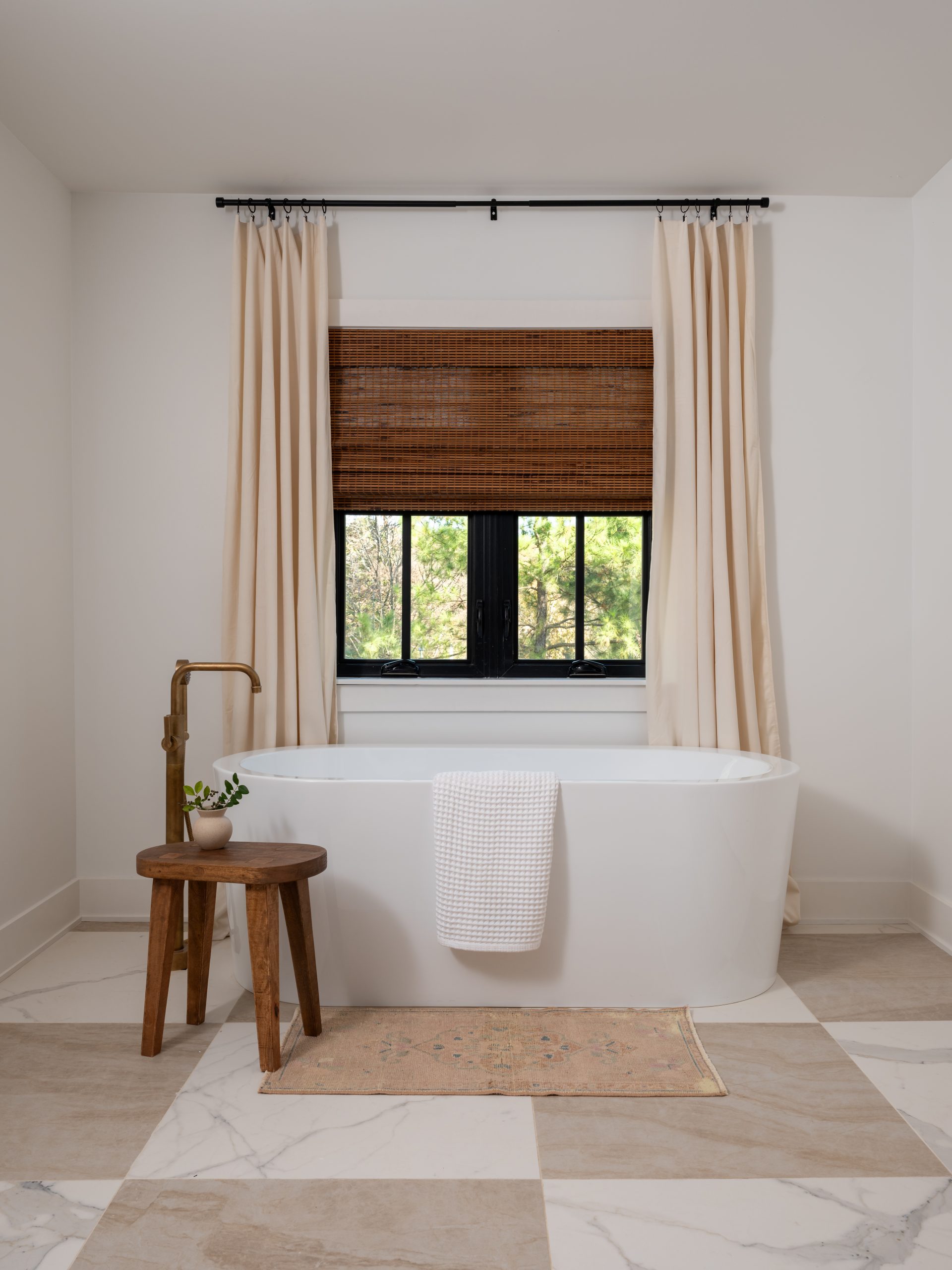 For the bathroom, we continued the glam theme with a larger checkerboard pattern for the floor and glossy handmade Zellige tile in the shower. The large individual floor tile magnifies the size of the bathroom, while the geometric shower tile elevates the style. We chose gold handmade Atmosphyre fixtures for the entire bathroom (shower, bath and sinks) – as we did in the kitchen. Above the bathtub, we hung a bubble chandelier as a fun play on bubble baths. The whole bathroom has a Hollywood Regency vibe to it.