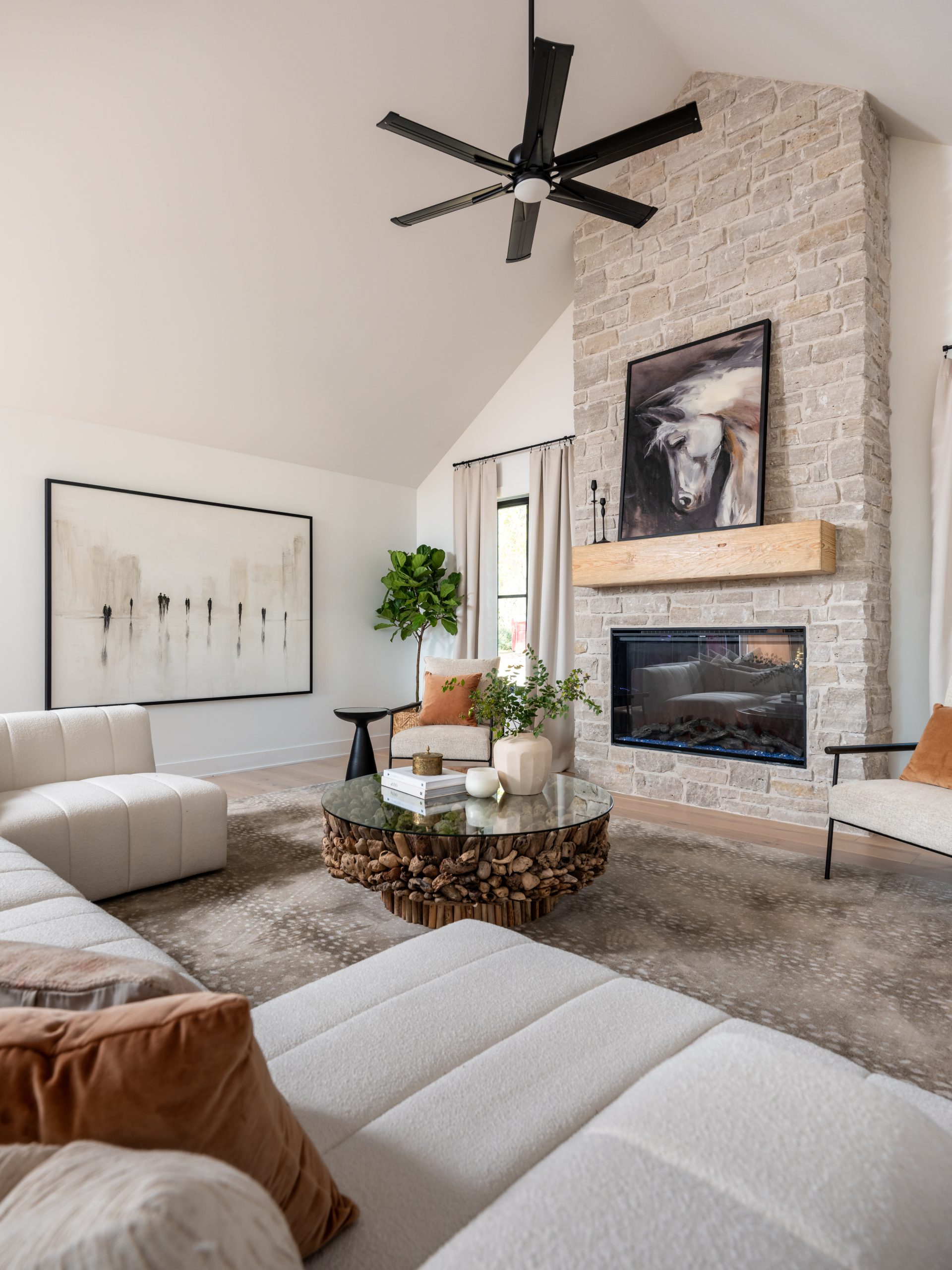 Before this was the family room, it was the garage. We absorbed that space, vaulted the ceiling, installed large wooden beams and added a floor-to-ceiling fireplace. At first Gabby only wanted the small wood-burning stove in the kitchen instead of a fireplace, but in the end, this large stone fireplace is what we needed to balance the look of the house and tie in the rock on the opposite side. It anchors the family room and truly adds to the overall cozy feel of the home. On both sides of the fireplace, we added large picture windows to really capture the beauty of the surroundings.