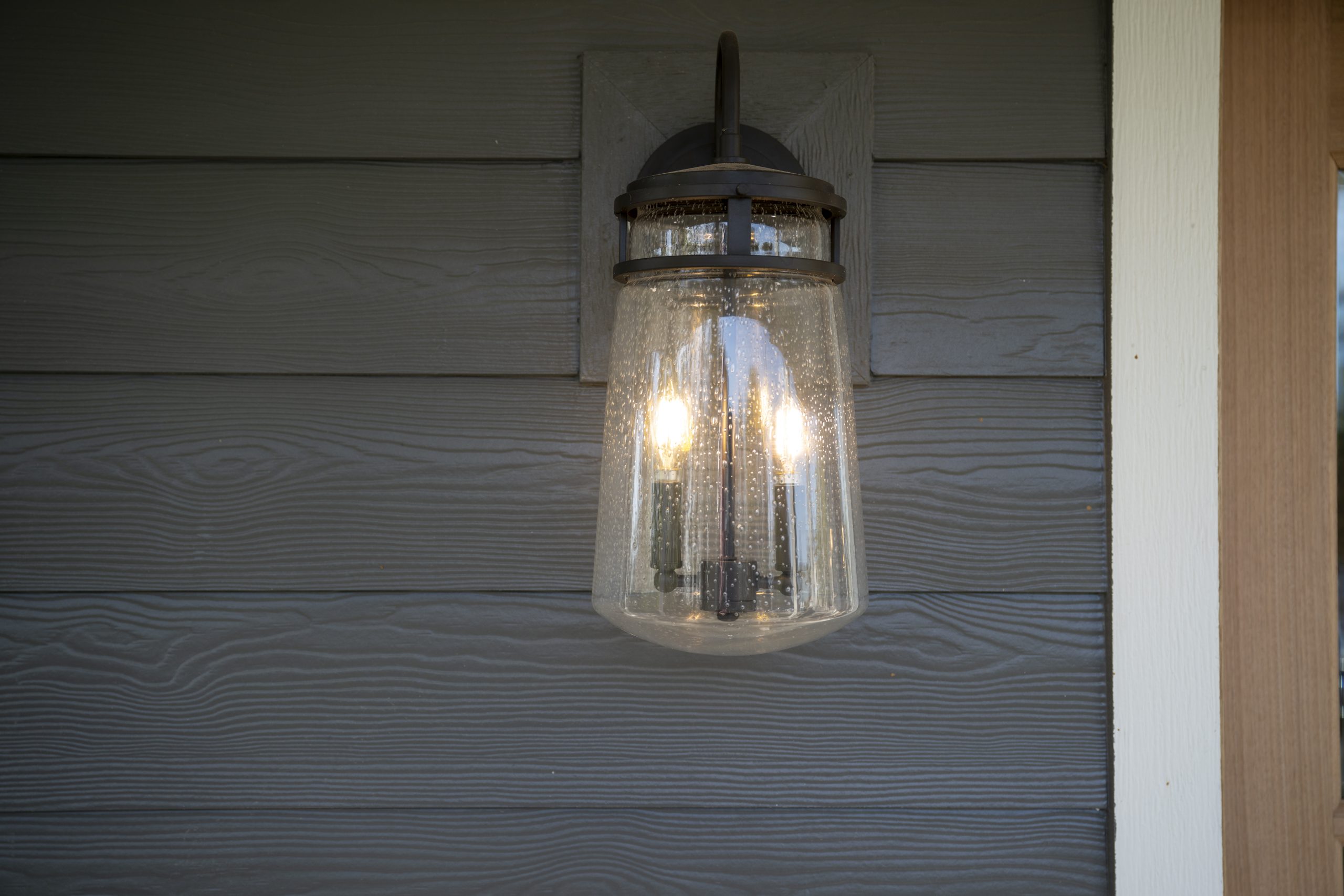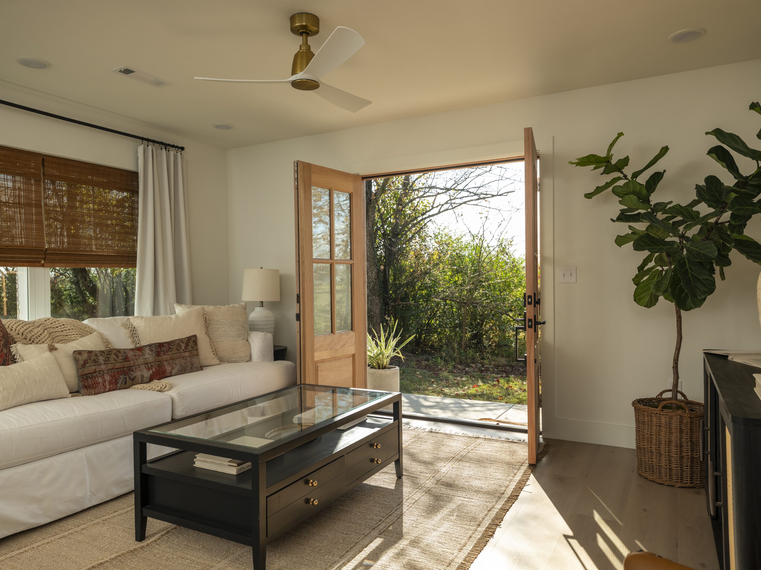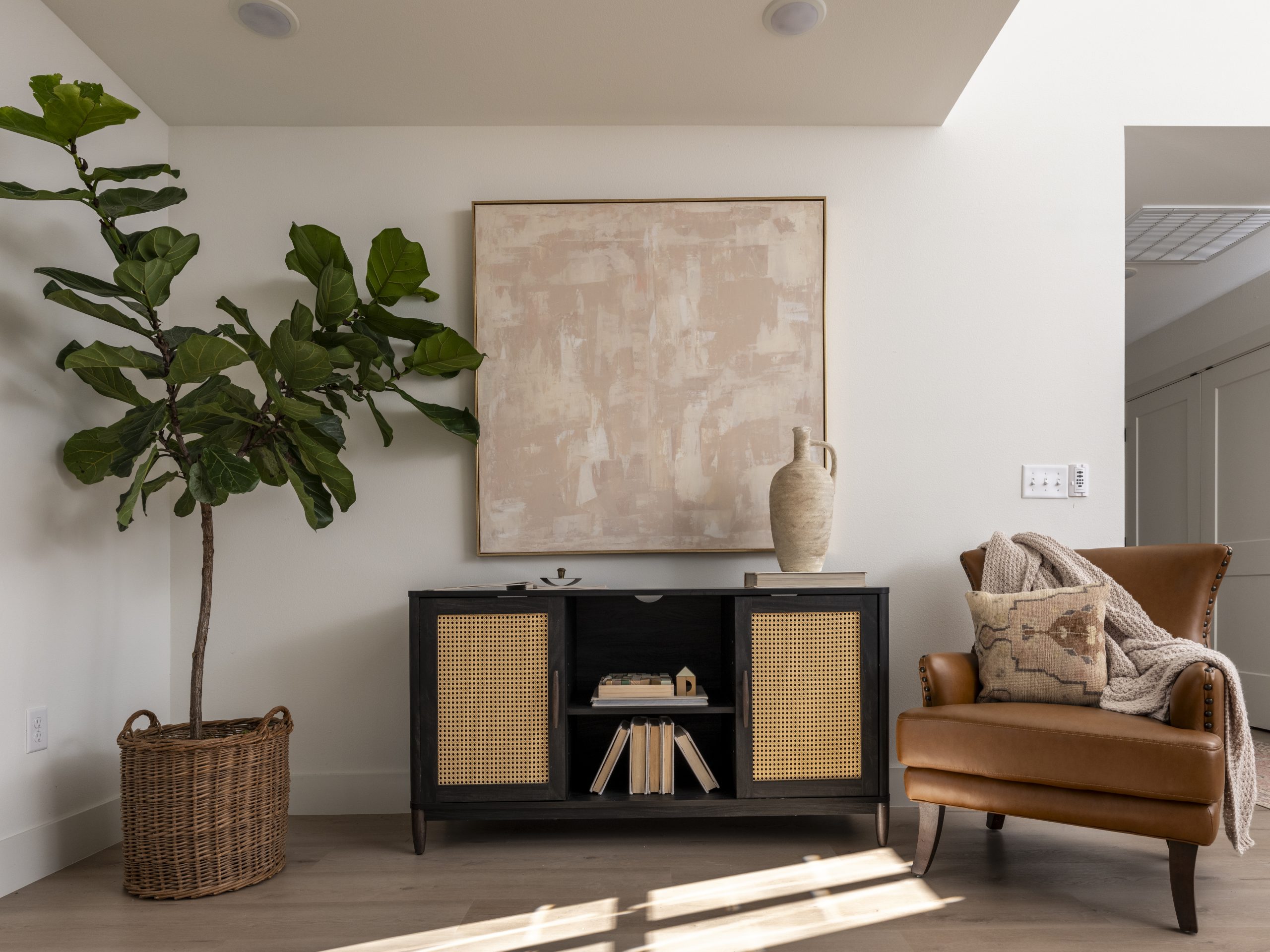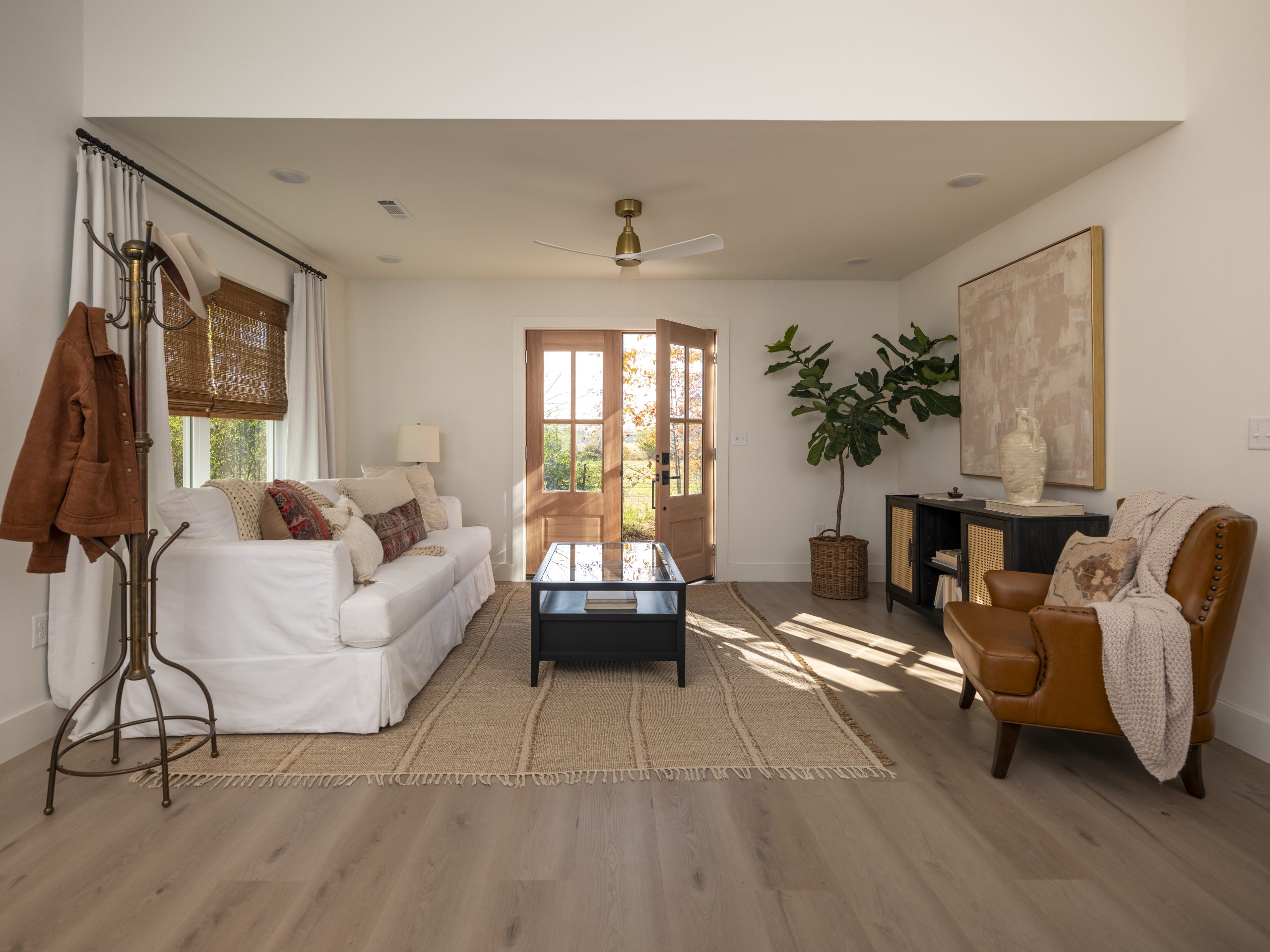 The living room was designed as a cozy hangout spot for everyday life. We used durable, kid-friendly LVP flooring so the space could stand up to real use. Dave built a large chalkboard, similar to the one we have at home, where Amber can write birthday messages and mark the first and last days of school for the kids. A beautiful statement chandelier anchors the room, while double doors lead out to the yard, making it easy for the kids to run in and out while Amber is nearby in the kitchen or living room. Warm, natural tones are mixed with modern metals, leather, and white finishes. Since this is a new build, we added photos of Amber and the kids to bring more of their personality into the space and help it feel more established.