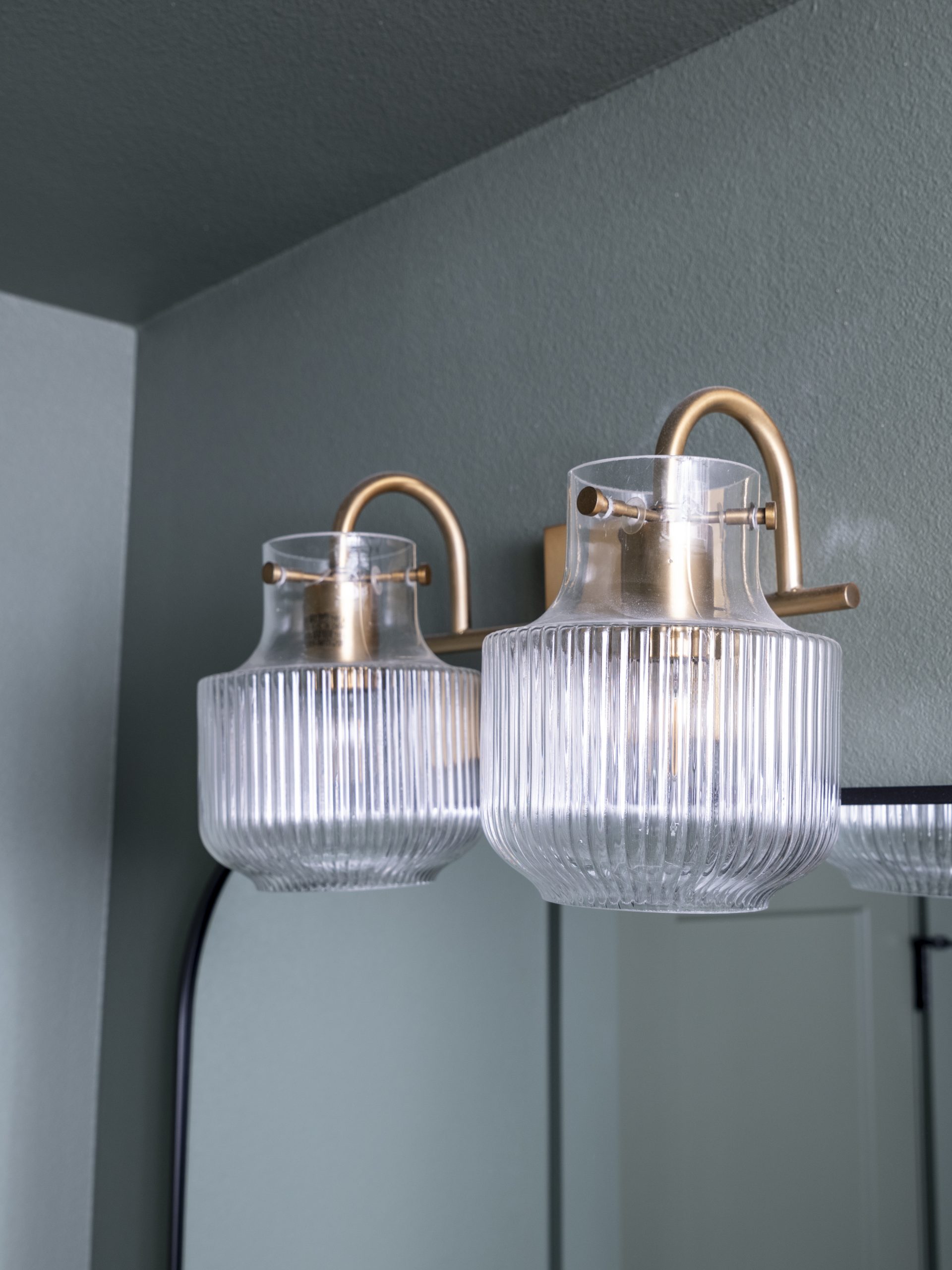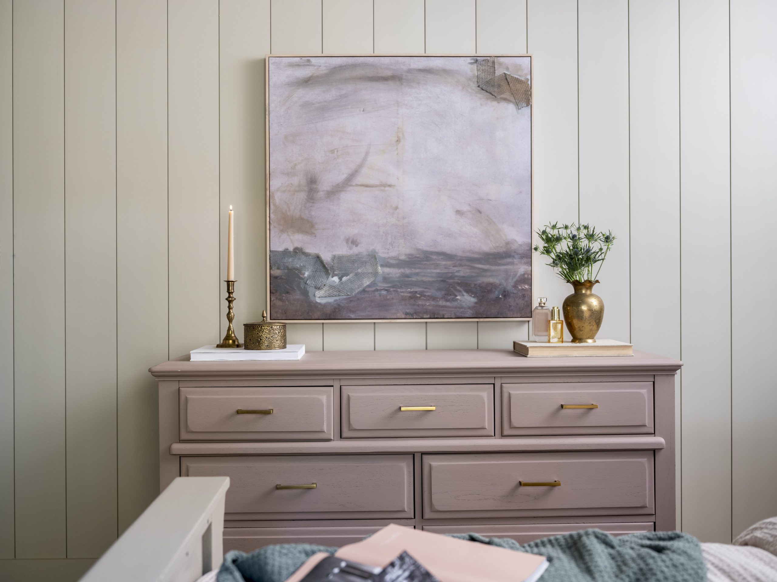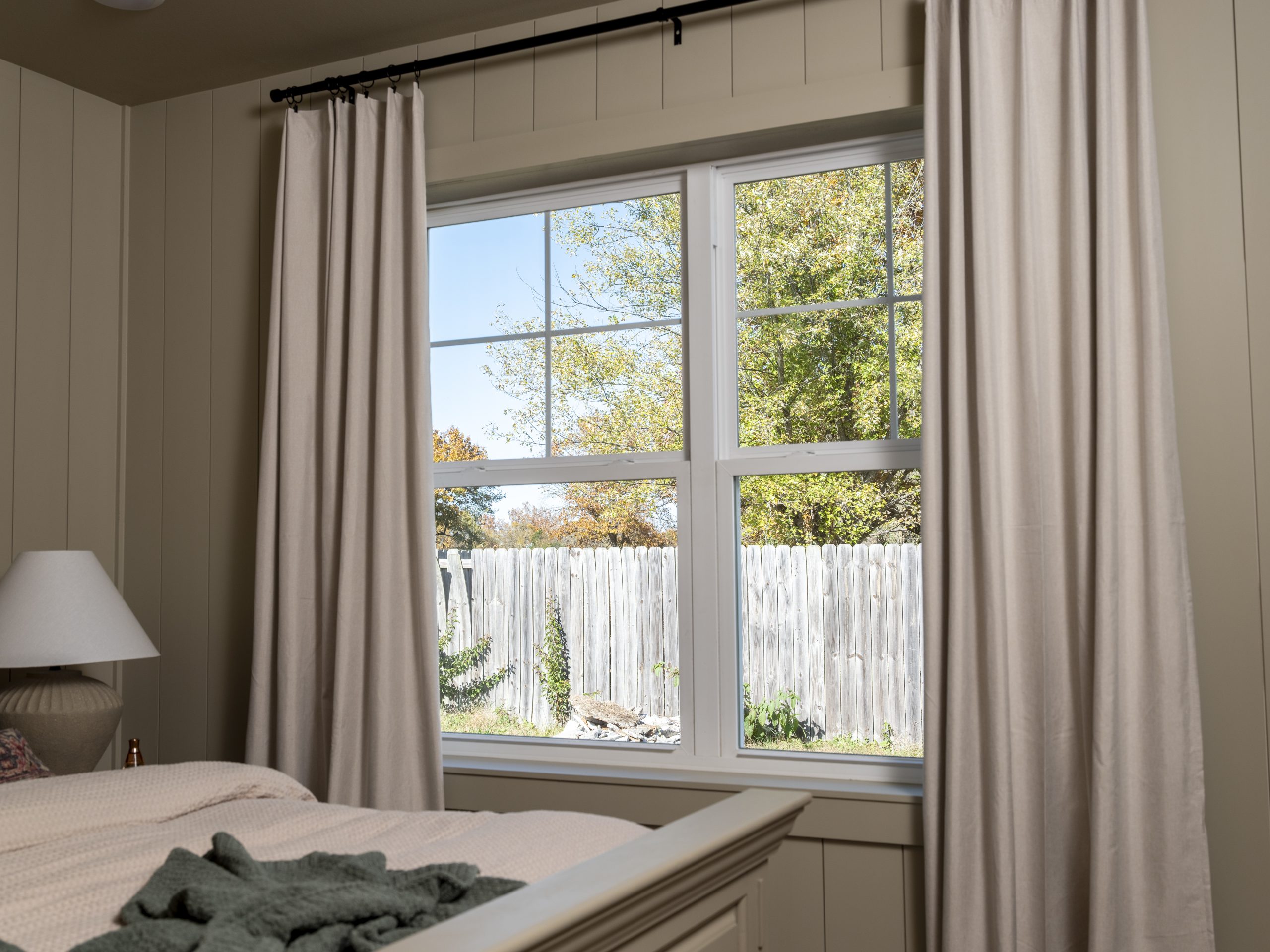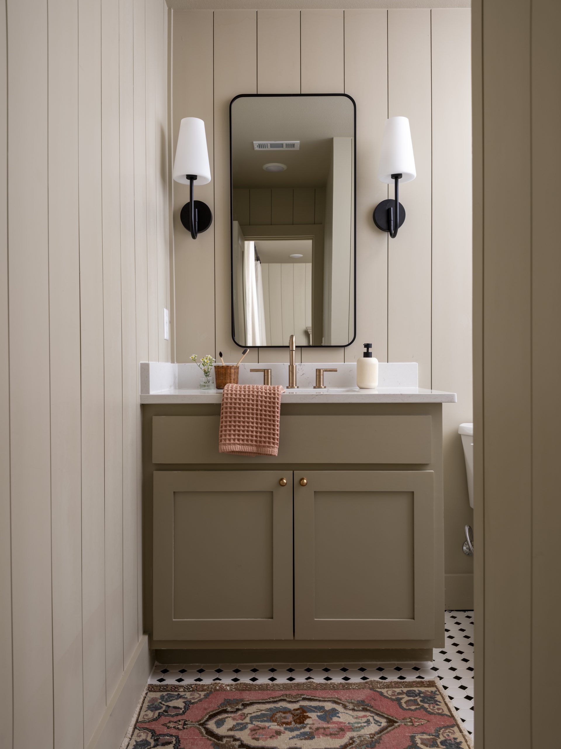 Amber is so selfless. When we asked what she wanted for her bedroom and bathroom, she told us she was happy with anything and just wanted everything to feel special for her kids. Knowing how hard she worked to make this house a home, we wanted to do something special just for her. We added paneling to all the walls to give the room more intention and character, then softened the space with shades of pink in the rug, pillows, and dresser. Those warmer elements are balanced by the modern ceiling fan and window treatments.