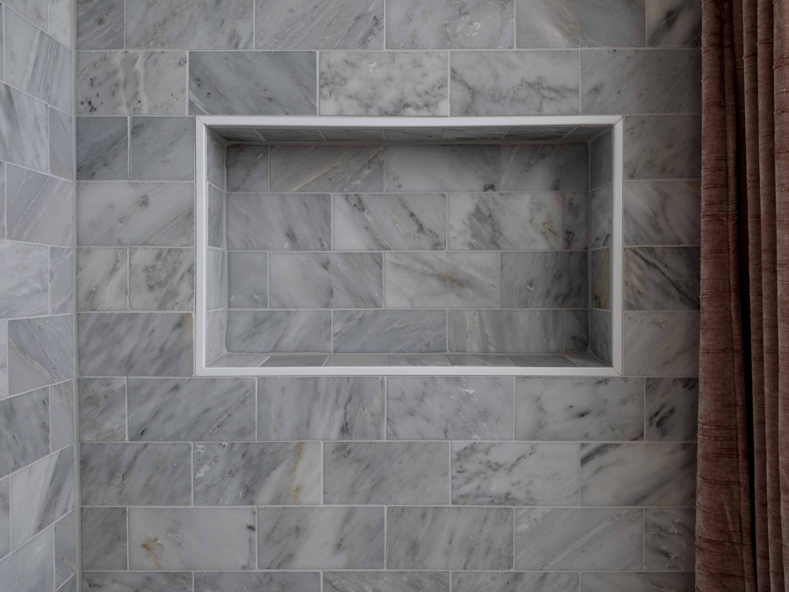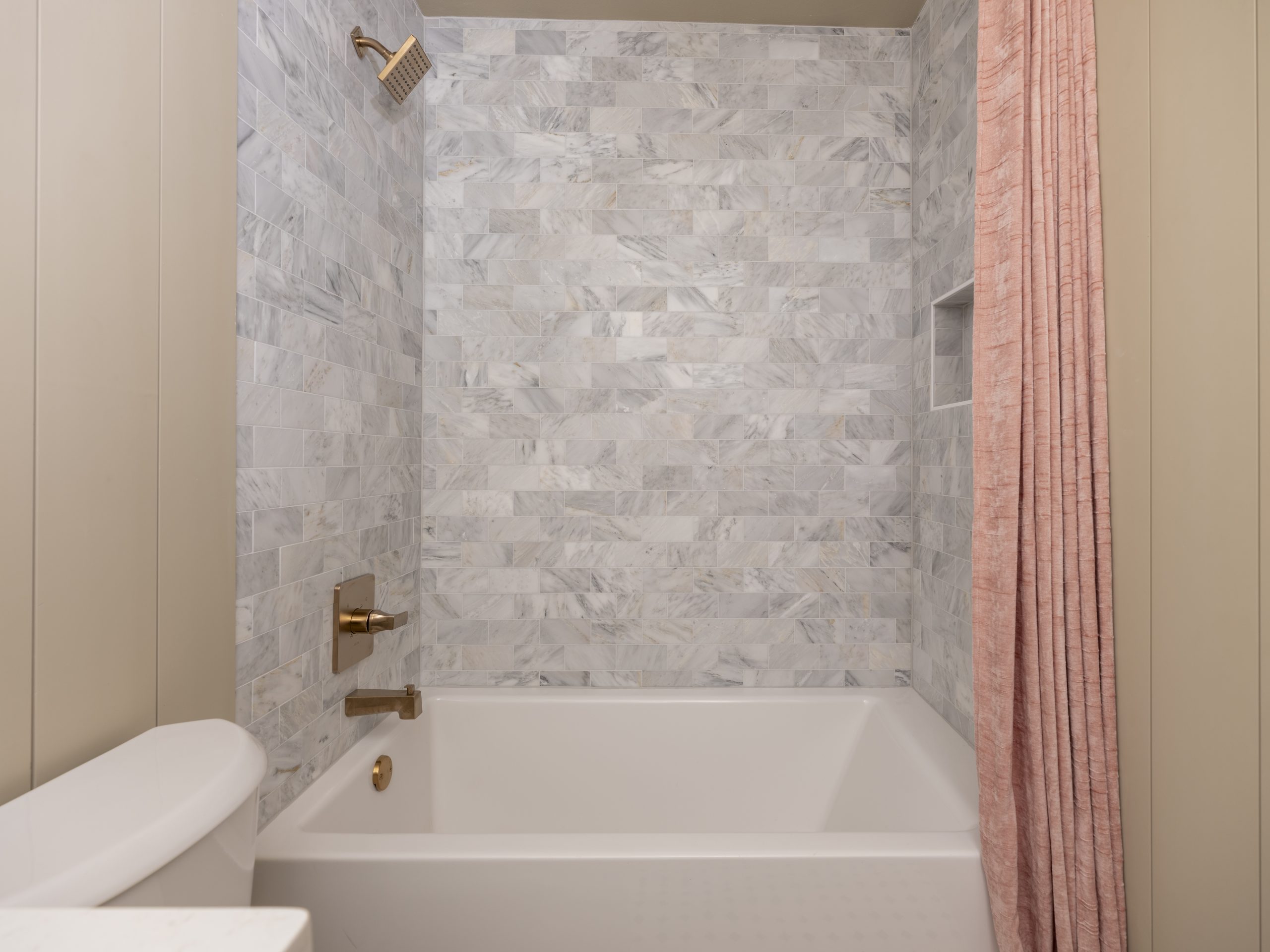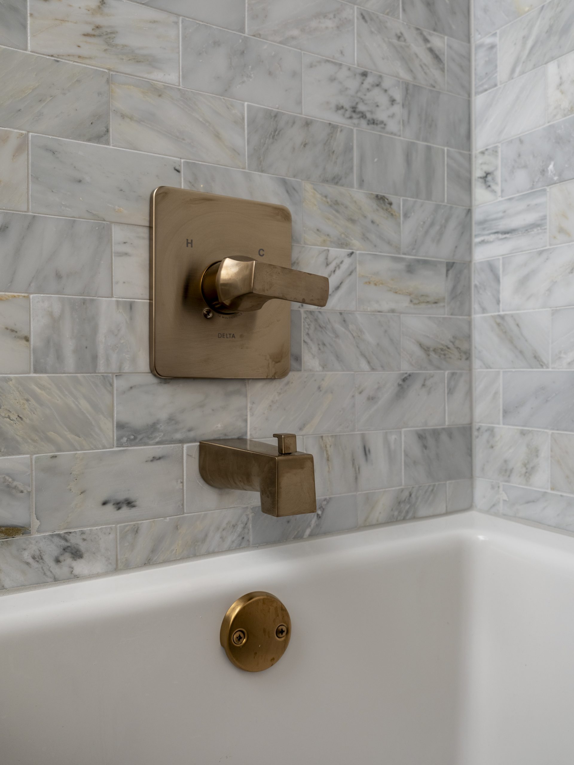We continued the wood paneling in here to keep the flow consistent throughout the home. Mosaic tile was used on the floors, with marble subway tile surrounding the bathtub. A mix of gold fixtures and black accessories brings in contrast, and the brushed gold faucet paired with a clean-lined mirror reinforces the balance between modern and classic.