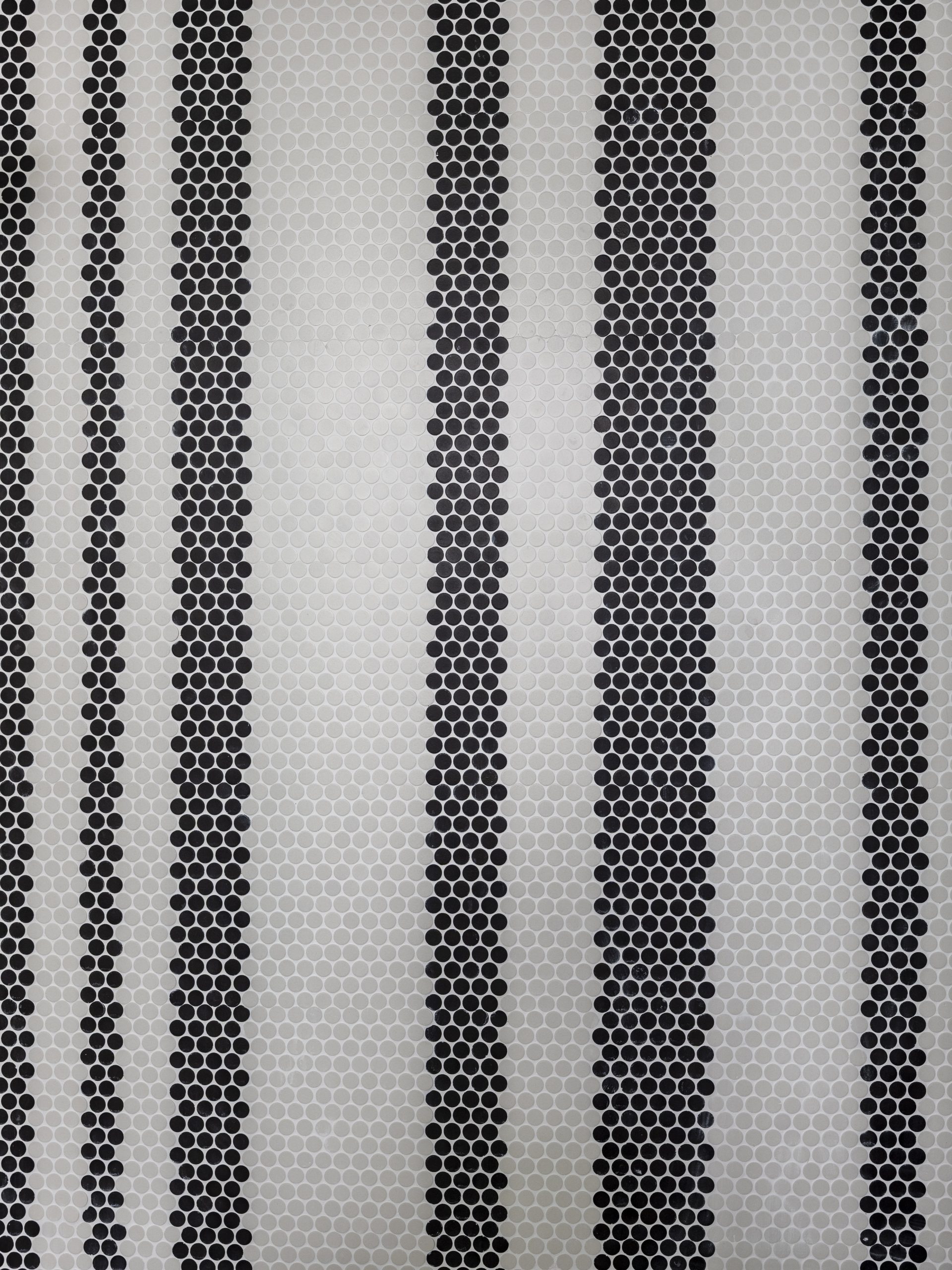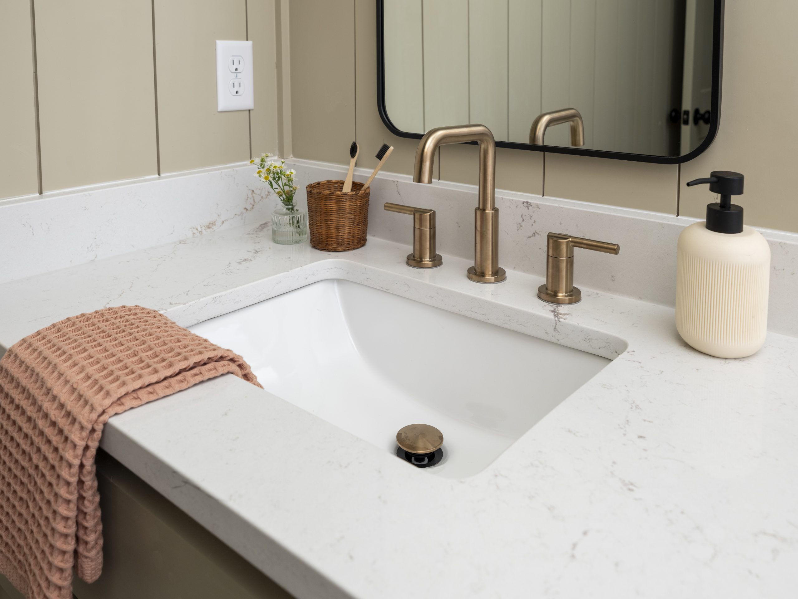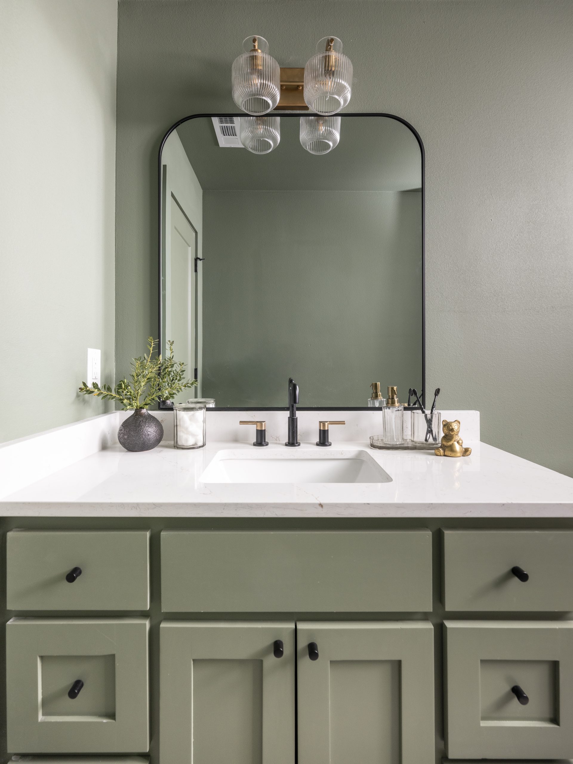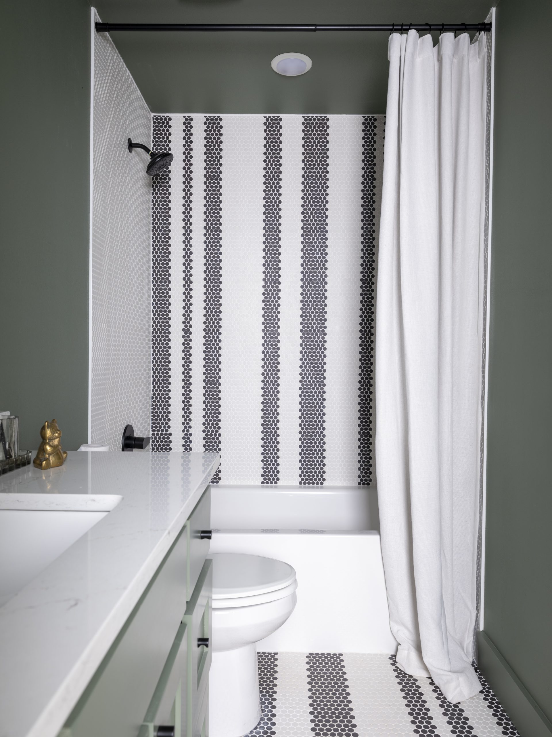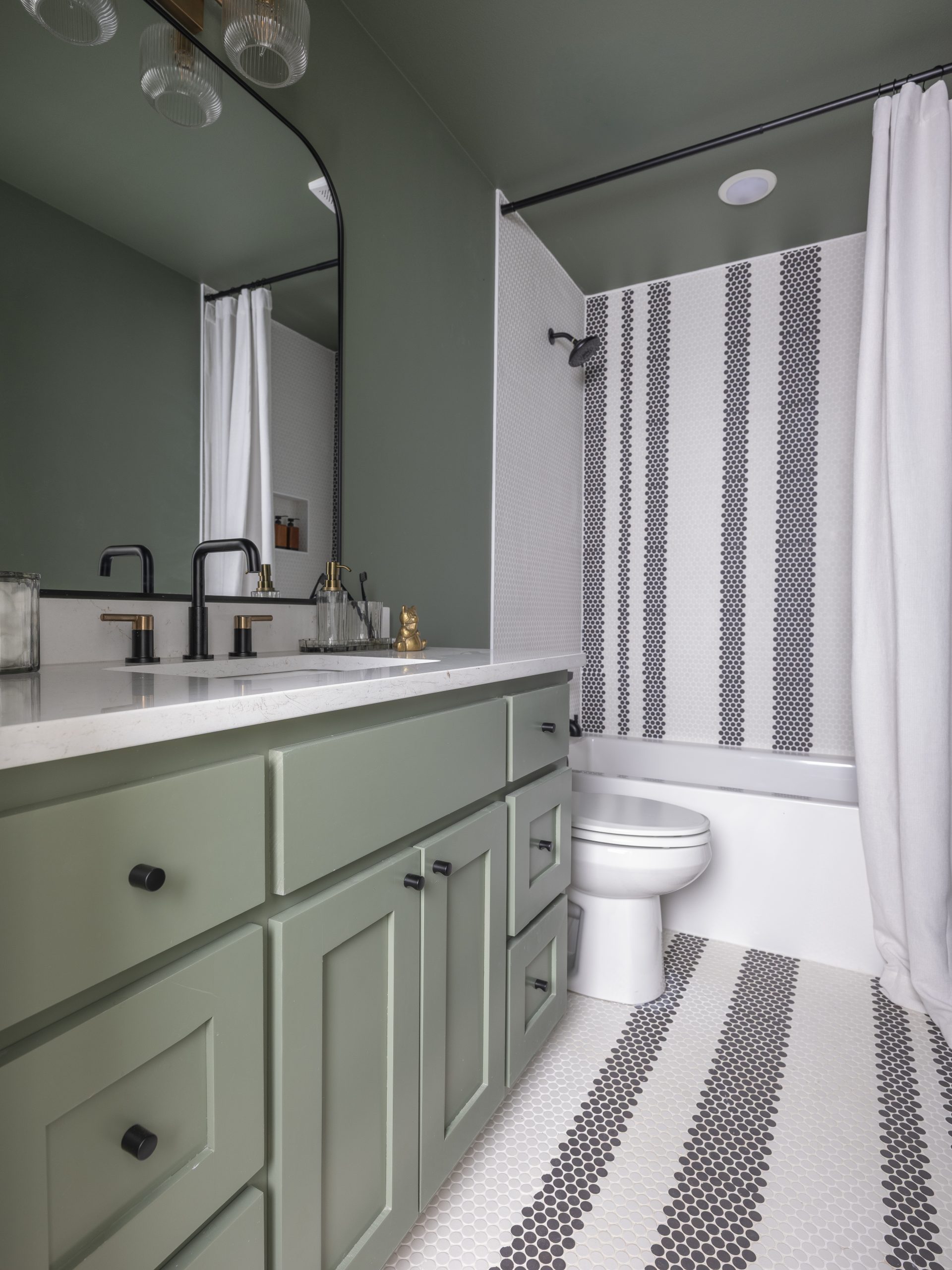 Green walls and white countertops set the tone in the kids’ bathroom, with a mix of black and gold fixtures throughout. For the flooring, we used black-and-white mosaic tile in a striped pattern along the floor and shower walls. It came out so fun.