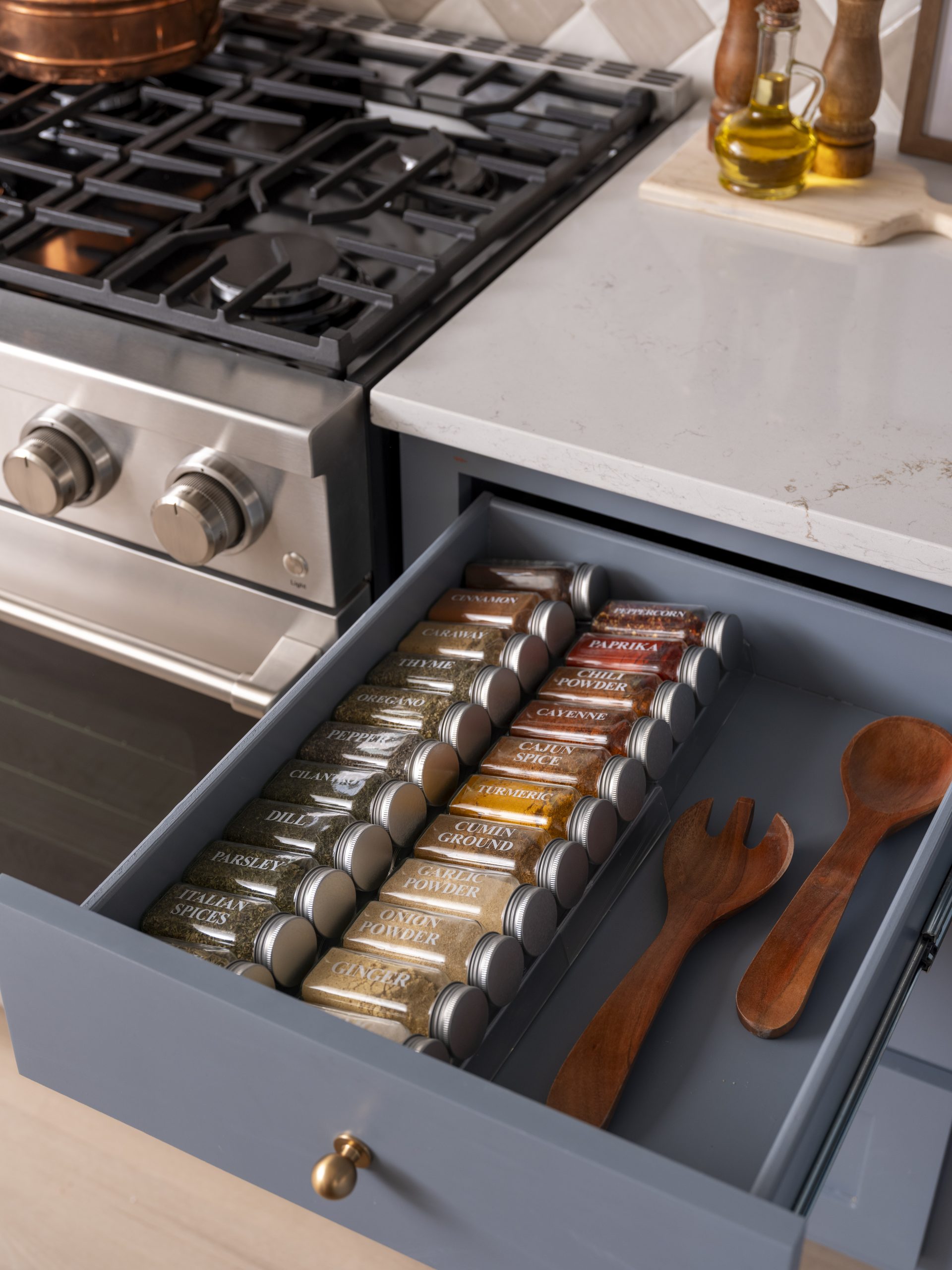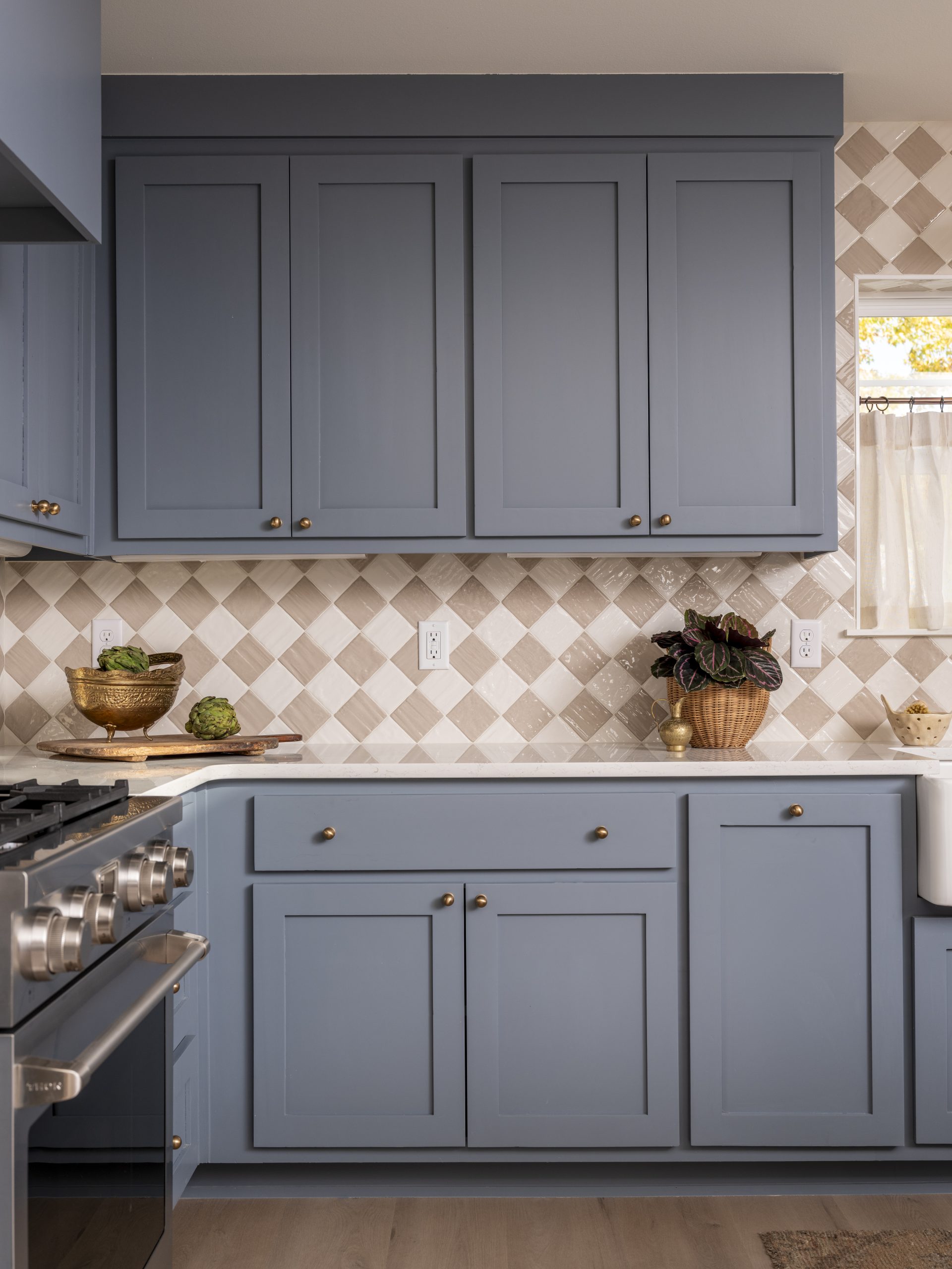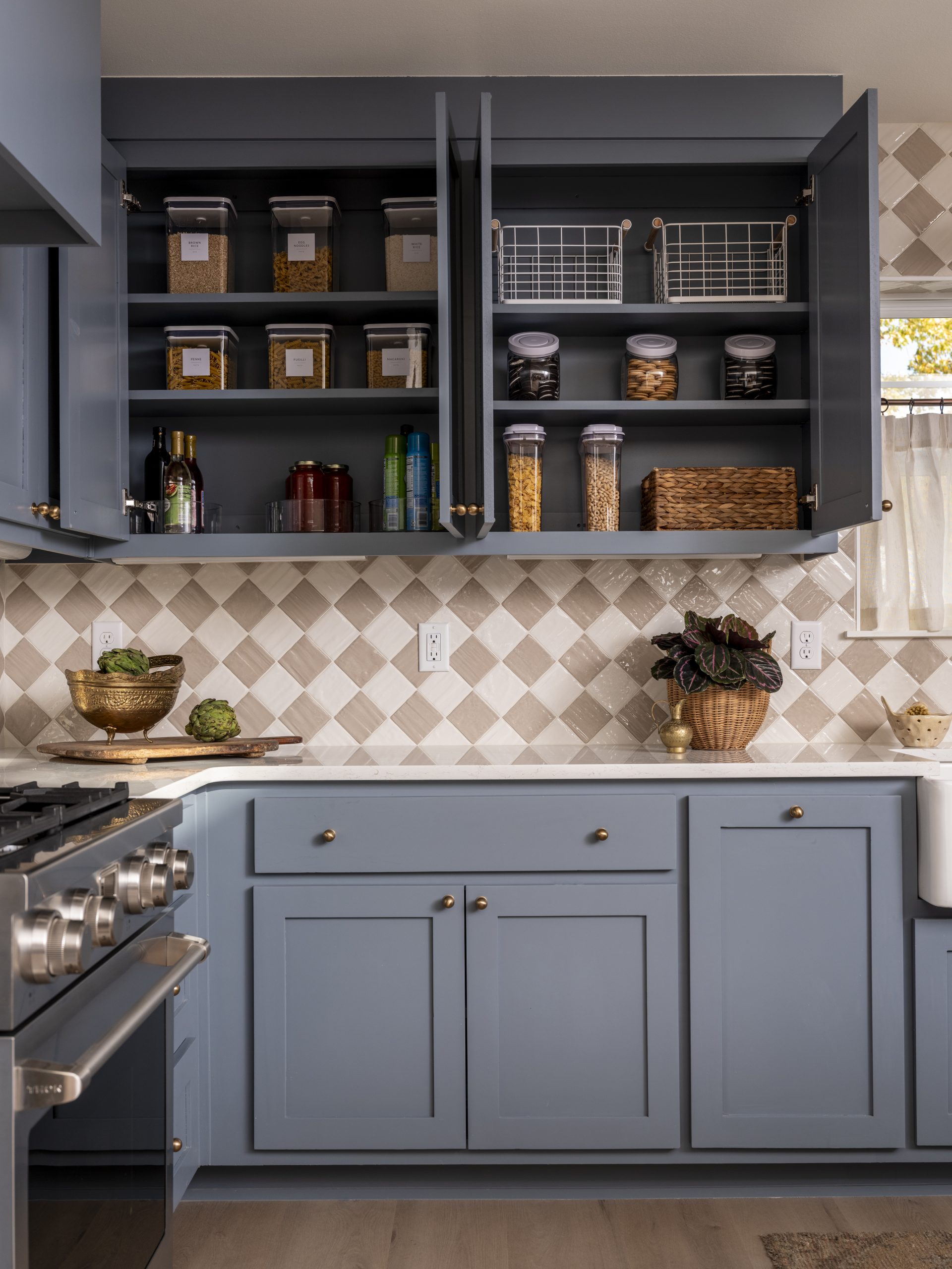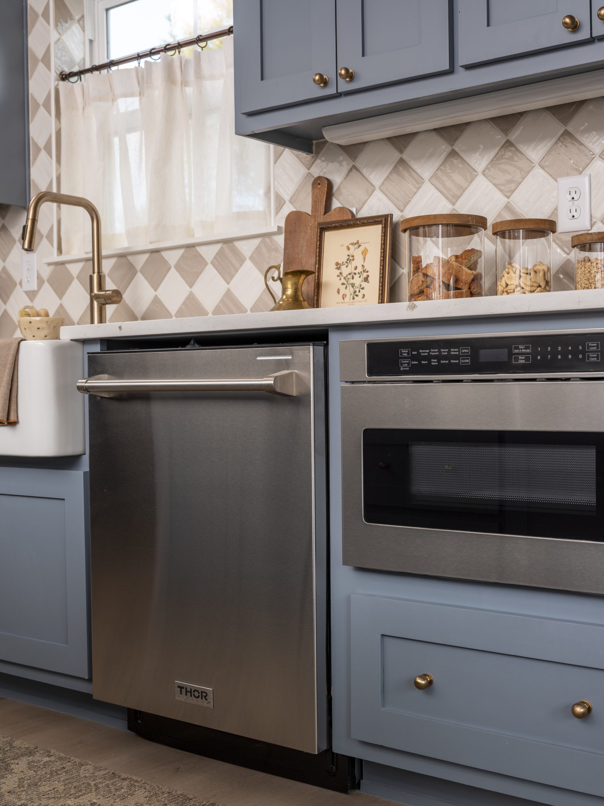 The kitchen has a farmhouse feel, with stainless steel appliances, stone countertops, a large island, and a tiled backsplash. Amber didn’t ask for anything specific, but as we got to know her, we learned she loved the color blue. We chose a soft blue for the cabinets and paired it with a cream-colored, checkered square backsplash for a classic farmhouse look.