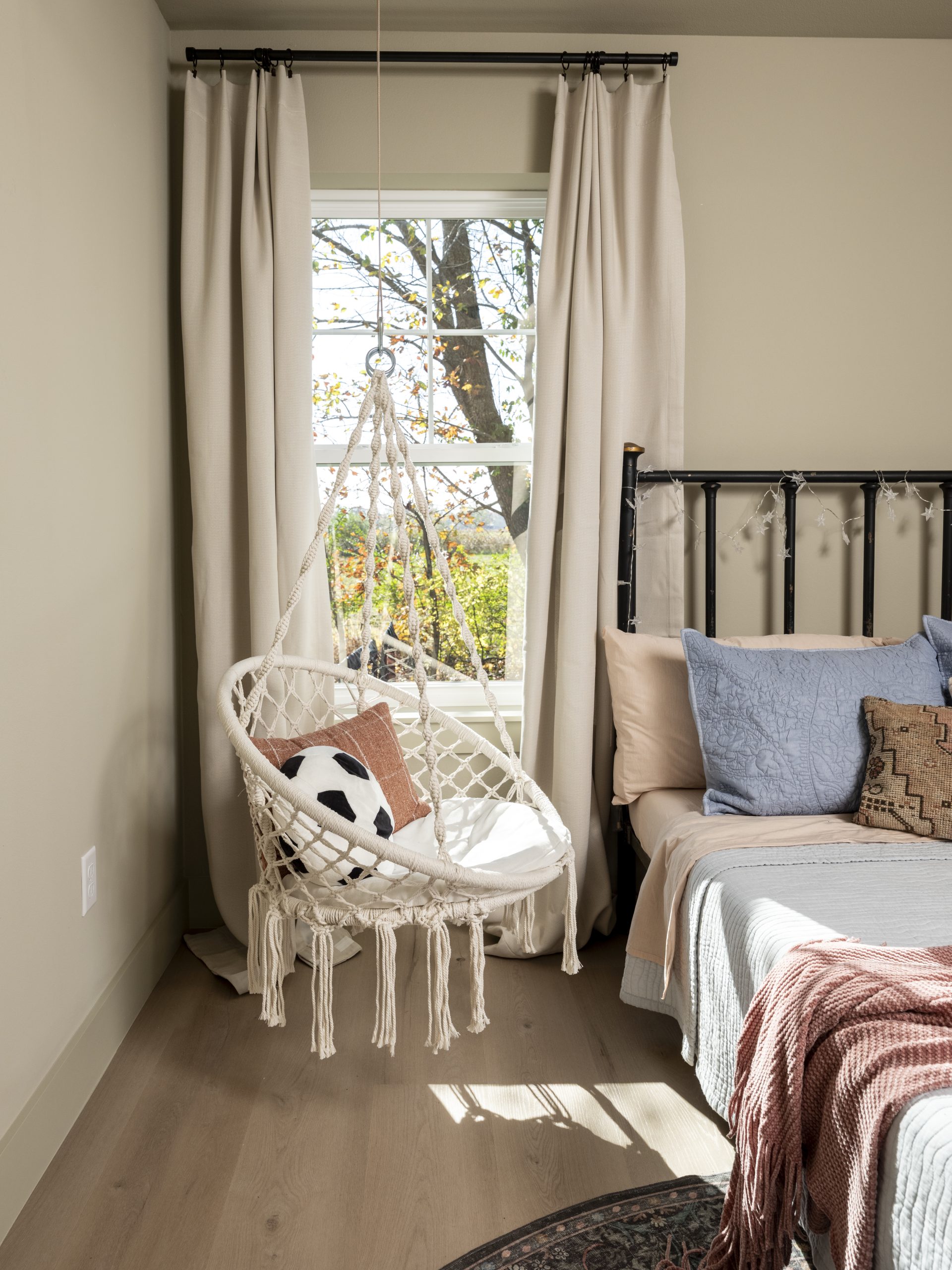 For Addie, we wanted her bedroom to reflect who she is, and knowing she loves soccer gave us the perfect starting point. Gather Goods generously donated the furniture for this room, including the cutest bed and dresser. We mixed traditional and modern elements, then added personality with the fun soccer ball wall light and a crocheted swing. The result is a sweet space that doesn’t feel overly girly, making it just right for a pre-teen.