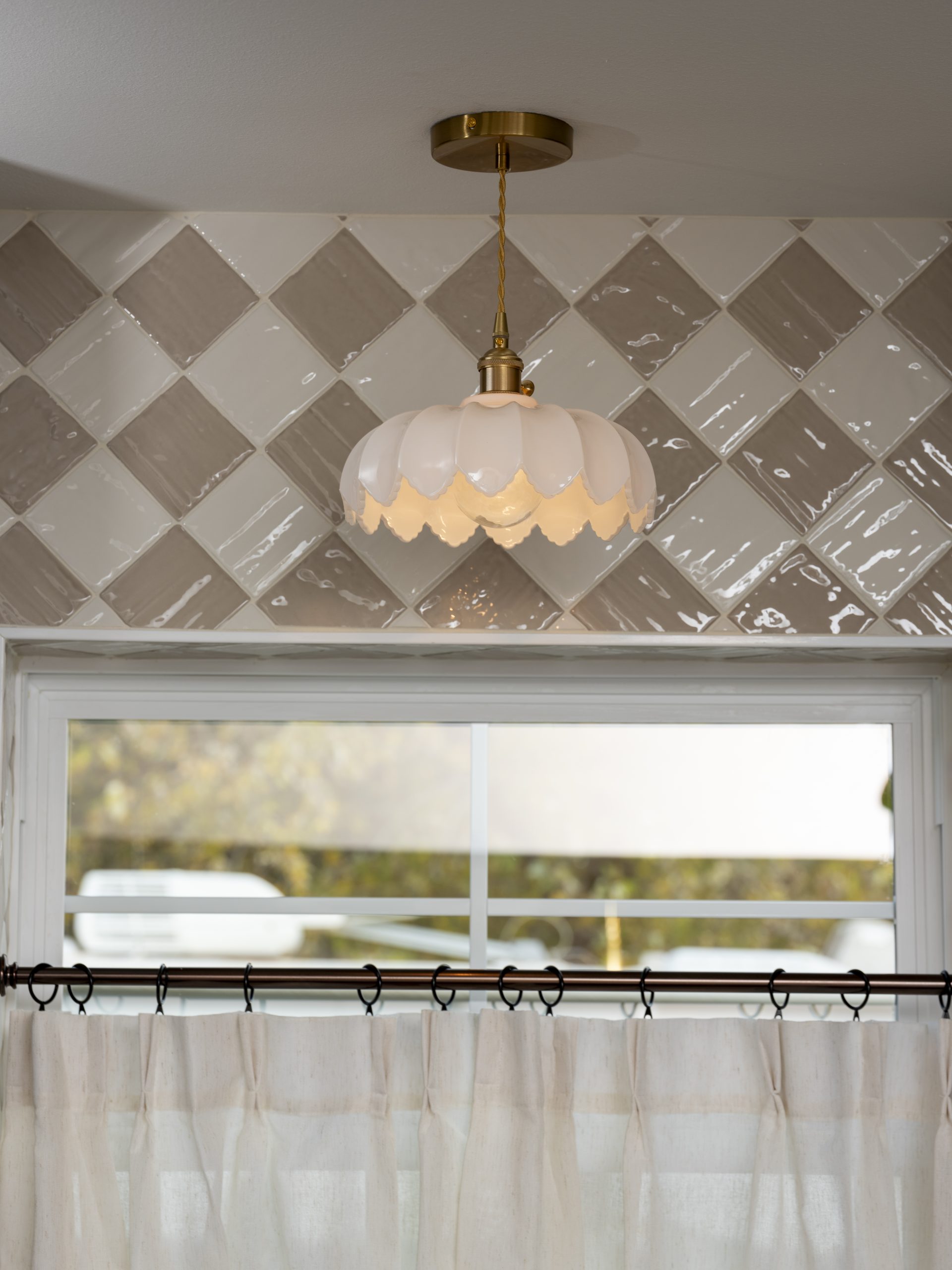 A farmhouse sink, brushed nickel hardware, a mini window curtain, and a sweet scalloped light fixture overhead help the space feel cottagey and cozy. Thank you again to Clutter Away, who donated organizational items and helped set up the kitchen.