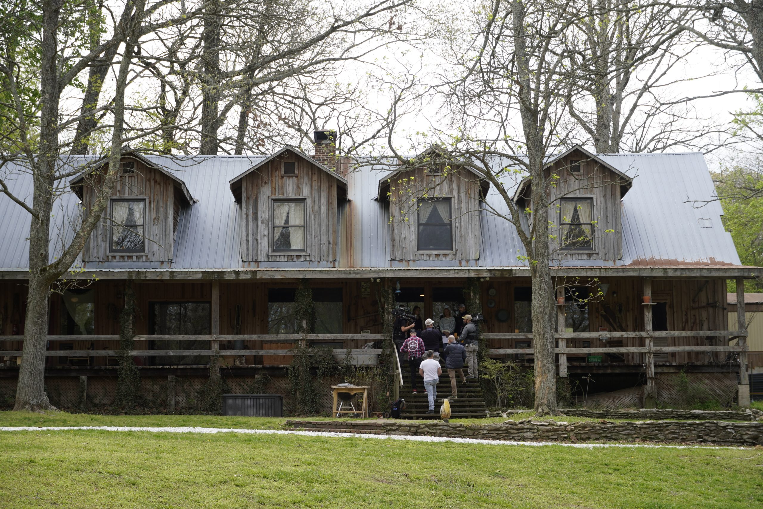 Homeowners James and Emily Wolfe discovered this property while visiting Arkansas in 2021. They loved the idea of a large wooden cabin. They just weren’t fond of the trailer home sitting in the middle and jutting out the side, hitch and all.