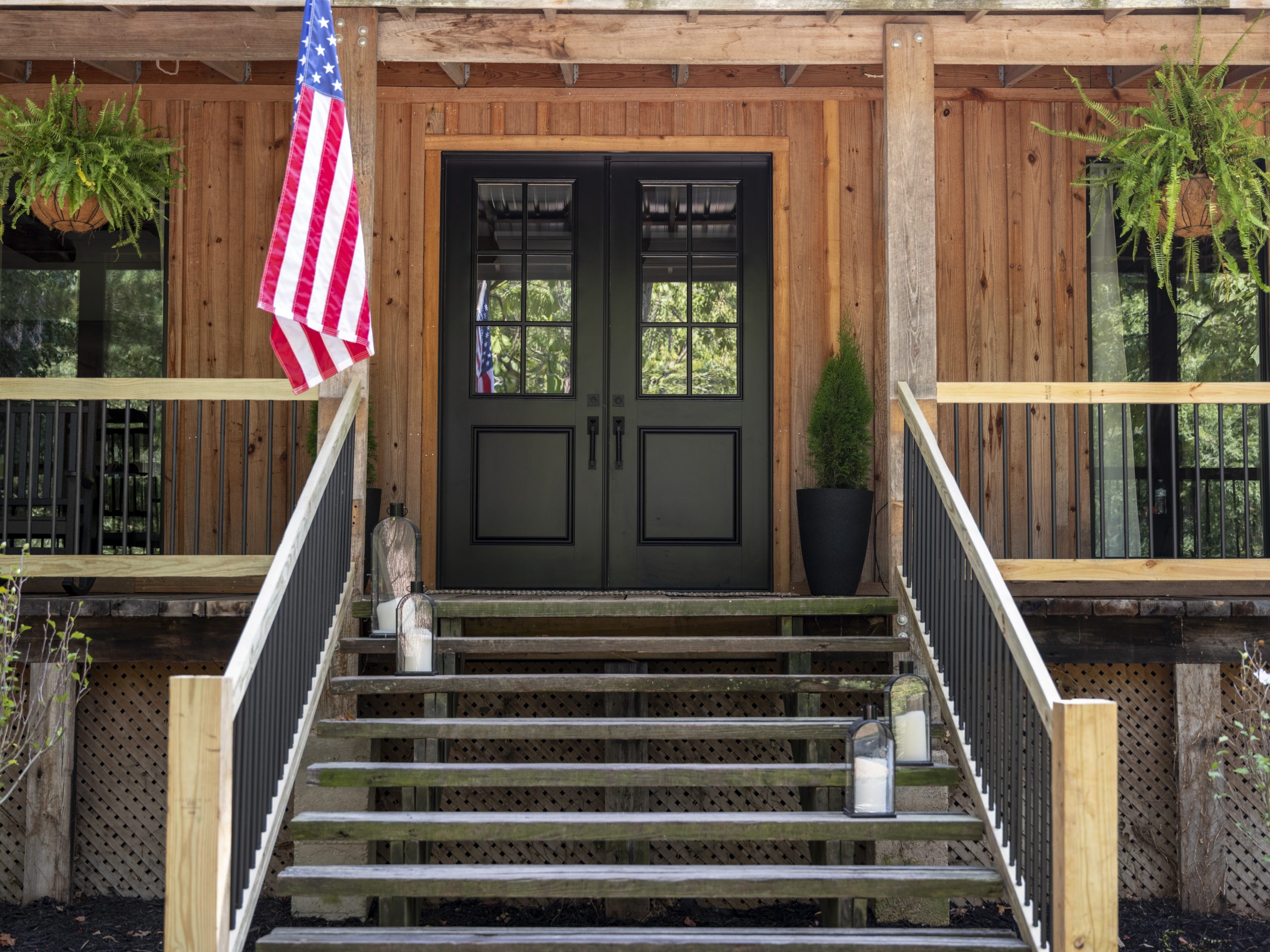 We moved the porch steps so they aligned with the front door, giving the home a grander, more welcoming entrance.  To finish the look, we cleaned up the landscaping, added new outdoor lighting, and brought in a few cozy rocking chairs.