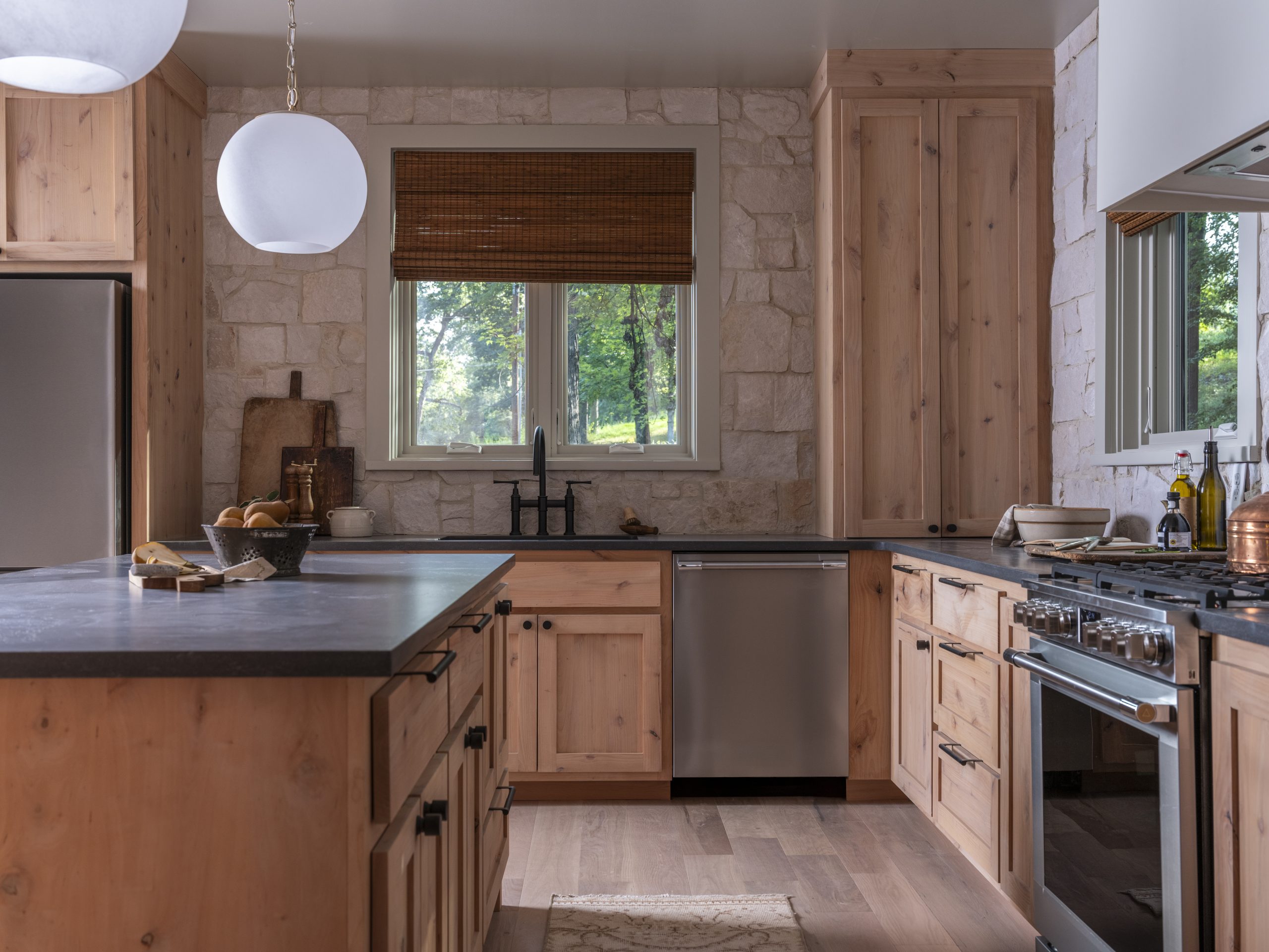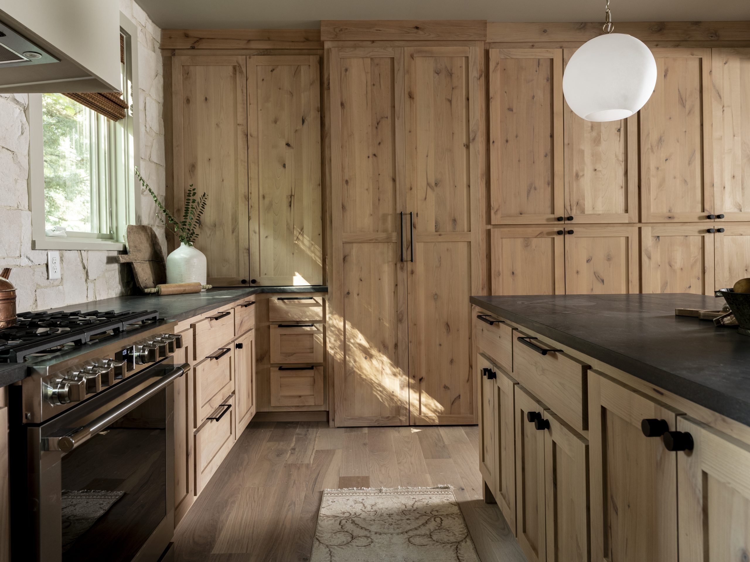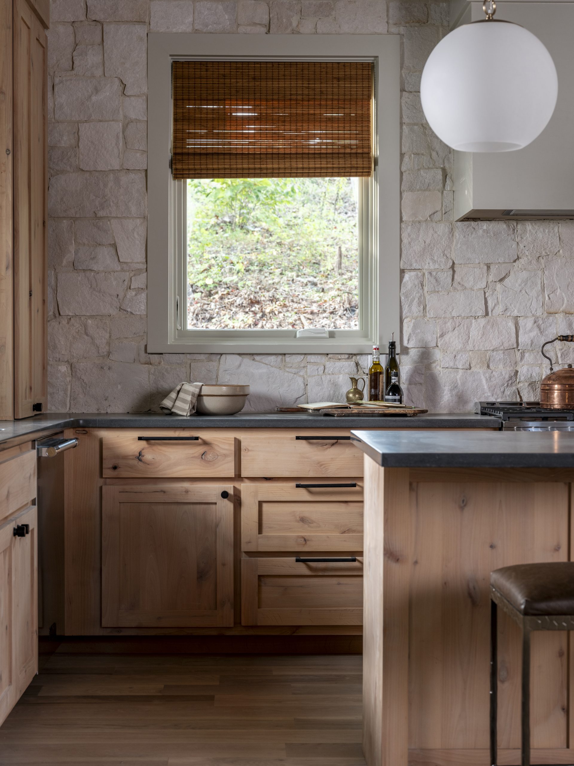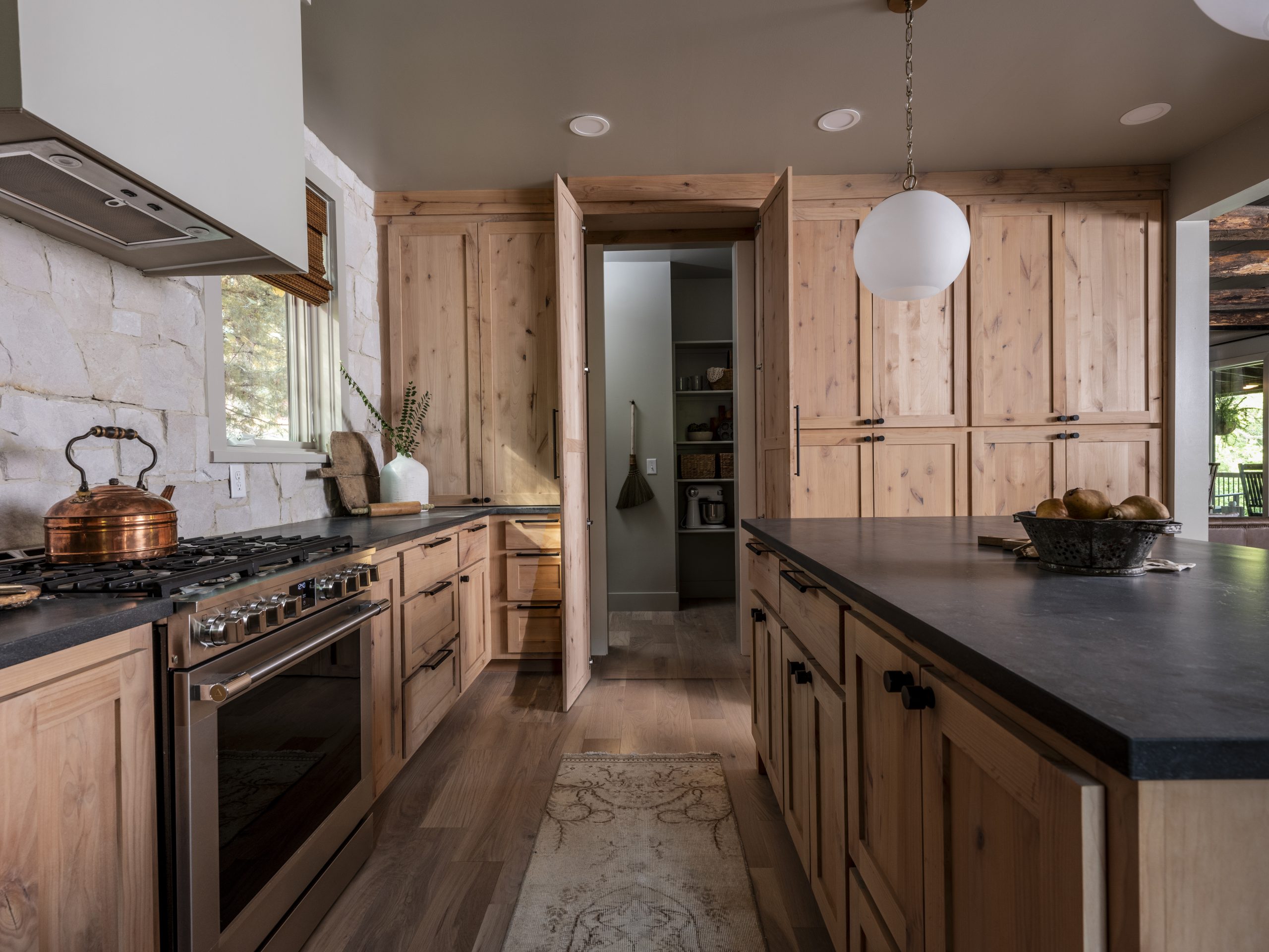 The layout is all about balance with a row of warm cabinets along one wall and a window and light-colored-stone along the opposite wall, blending nicely with the logs and other natural elements of the home.