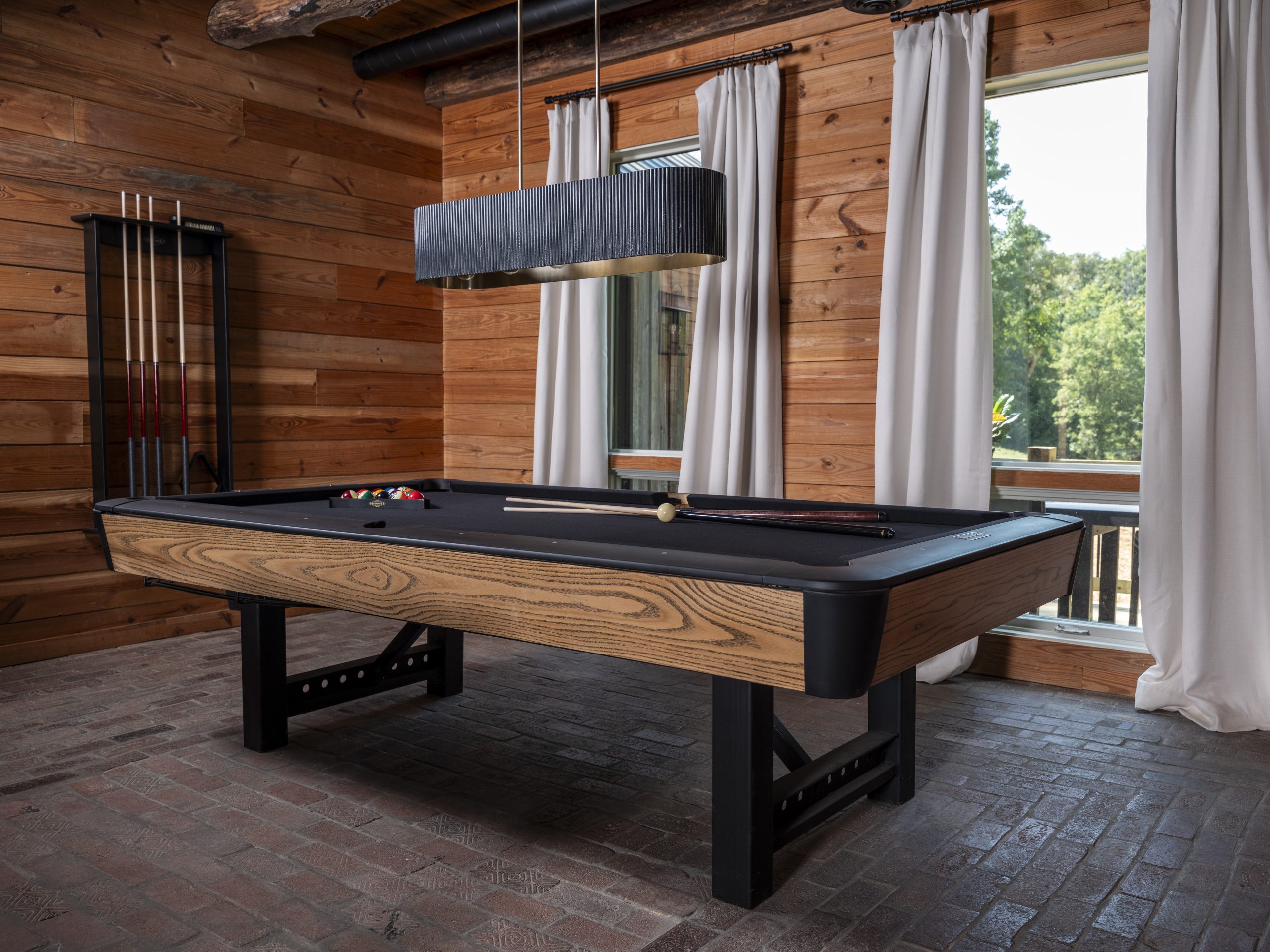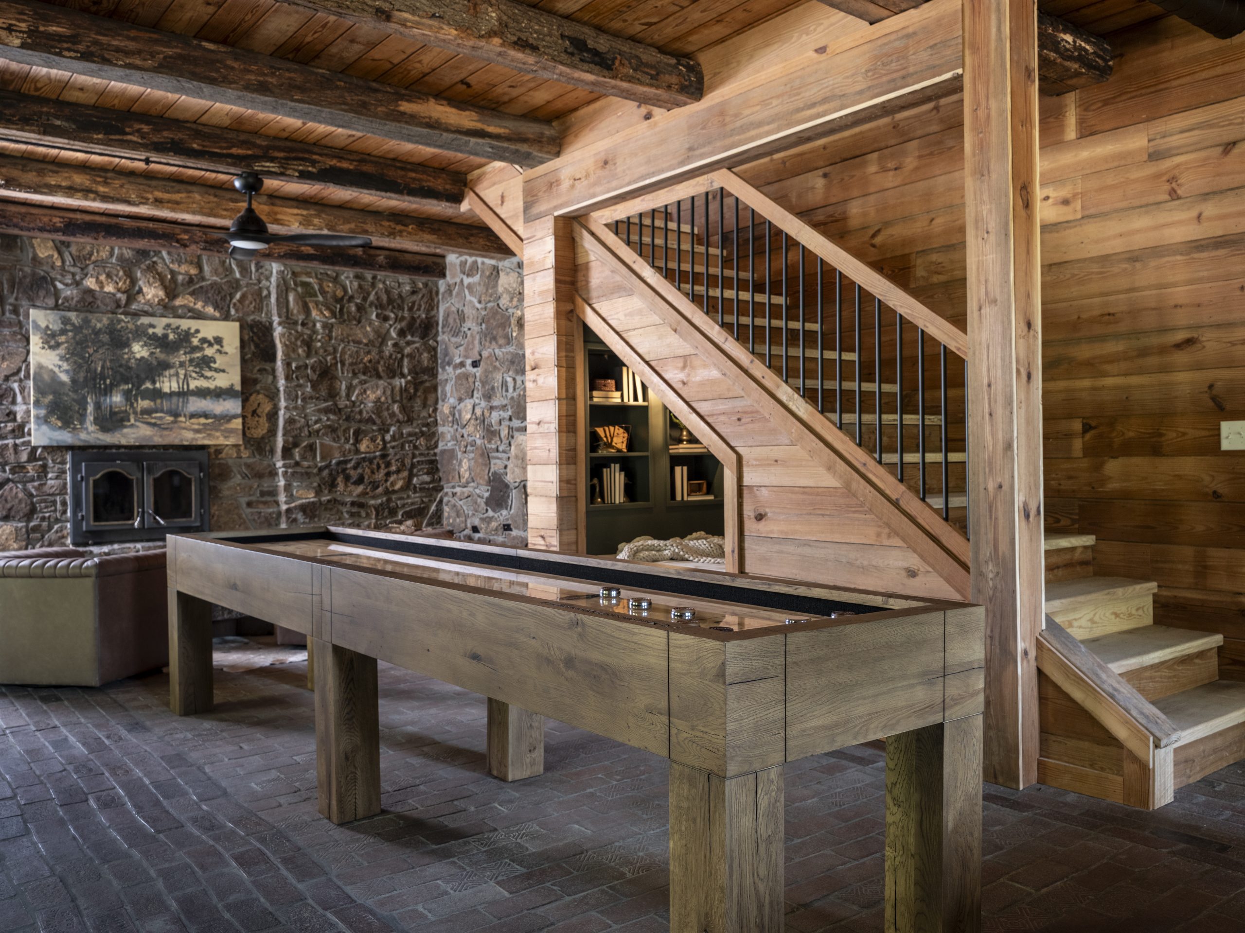 Jeff had mentioned wanting a pool table for his new space, so we visited a game table specialist who had several older, pre-owned tables in his shop. Once we chose one, we brought it back to our barn, where Dave sanded the wood paneling back to its original white oak. He forged beams to resemble railroad tracks for the legs, then had professionals replace the felt with a modern black finish.