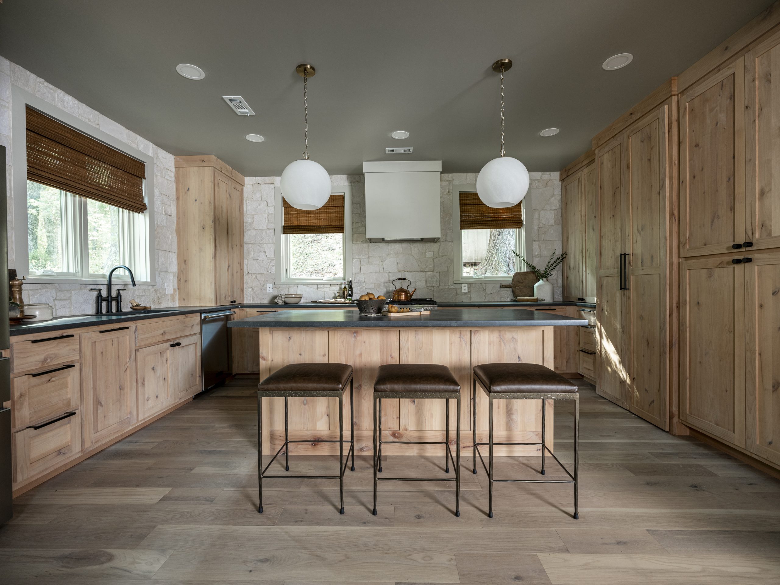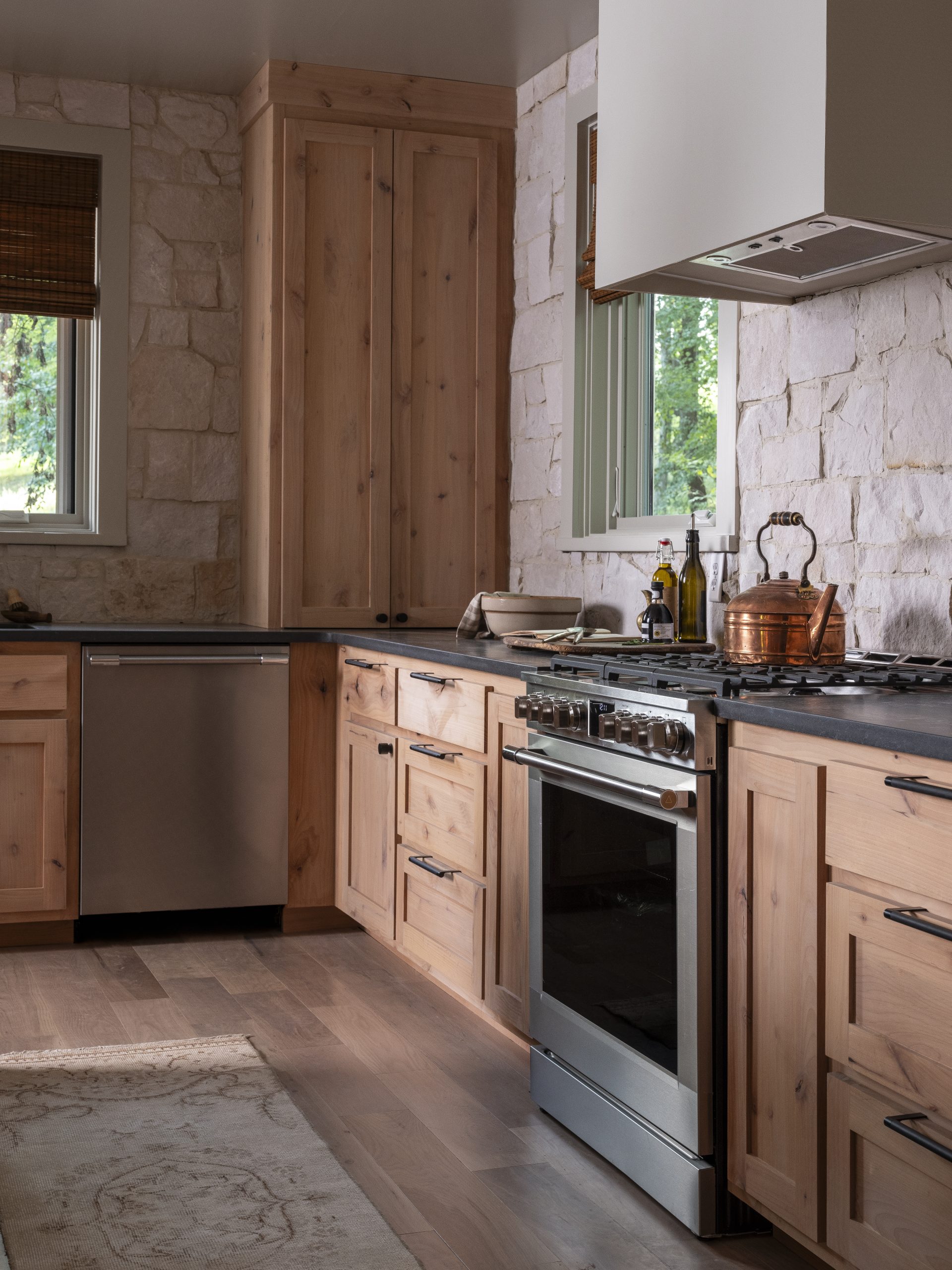 The main living area, which now includes the kitchen, dining room, and living room, was previously the bathroom, bedroom, and closet. The plan was to give Emily a kitchen with a lighter, more feminine touch while still honoring the rustic look Jeff wanted. We were able to achieve this with Alder wood cabinets that were the perfect cross between the two styles, paired with a real stone backsplash and beautiful stone countertops.