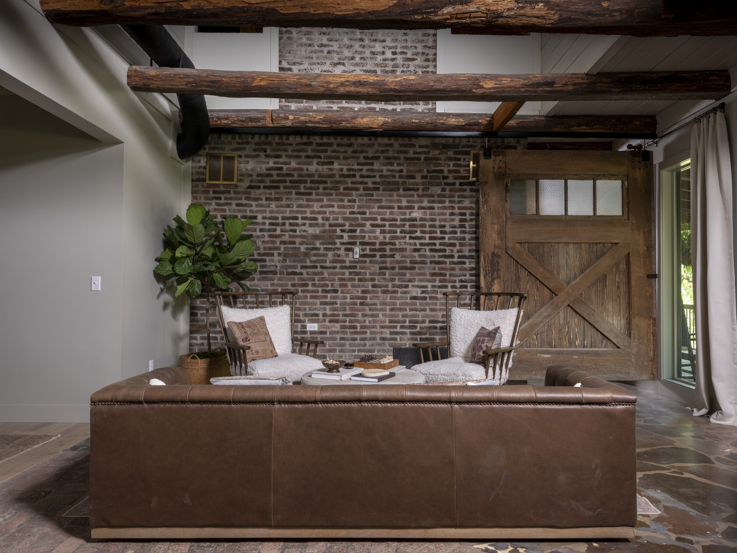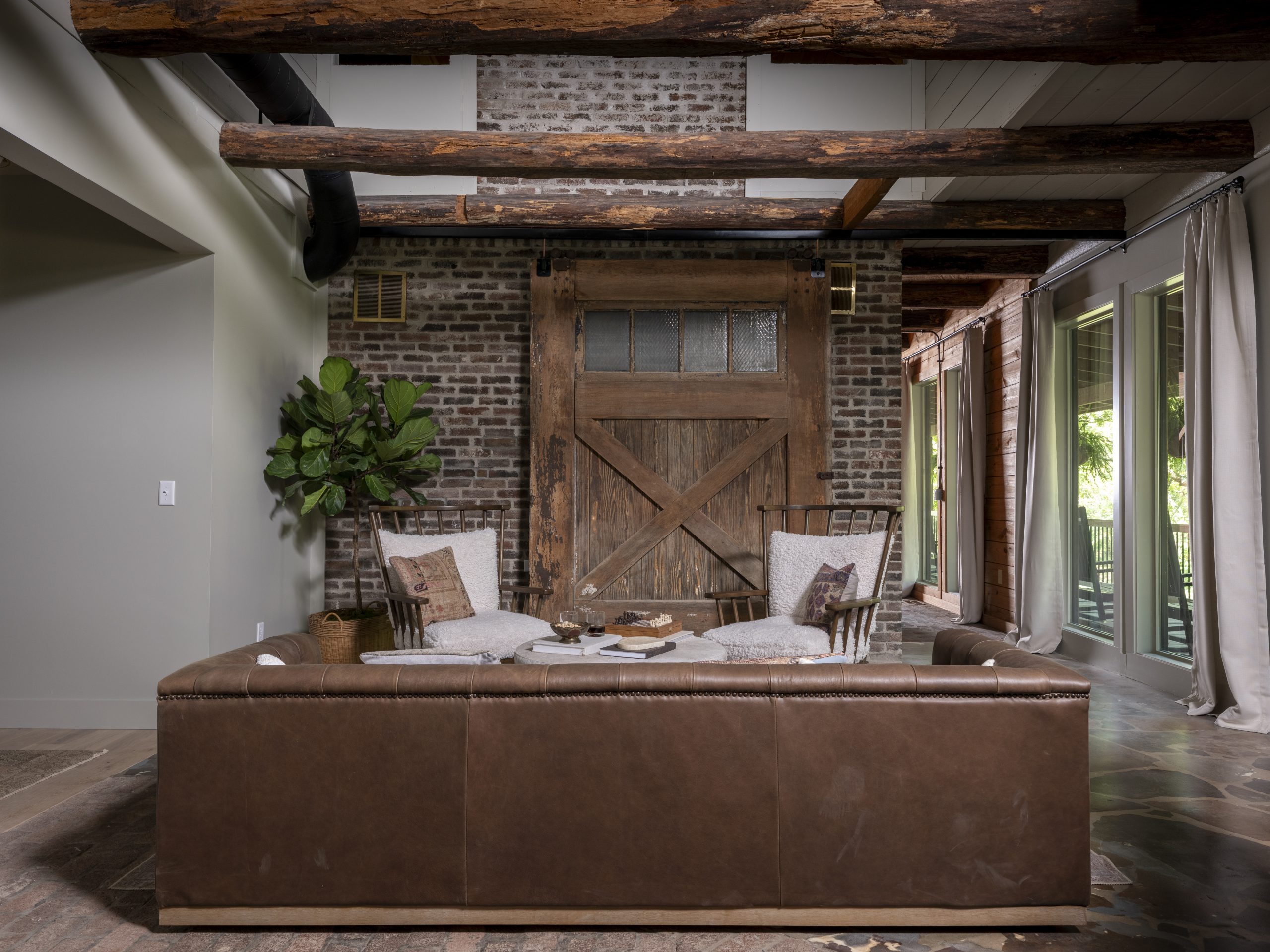 This space was previously the dining room and family room. Since those rooms were moved to the other side of the house, we were able to turn this area into a cozy man cave that really leans into the cabin feel. We closed off the wall between this new living room and the new main bedroom, added windows, and updated the furniture to create a comfortable place to hang out and play.