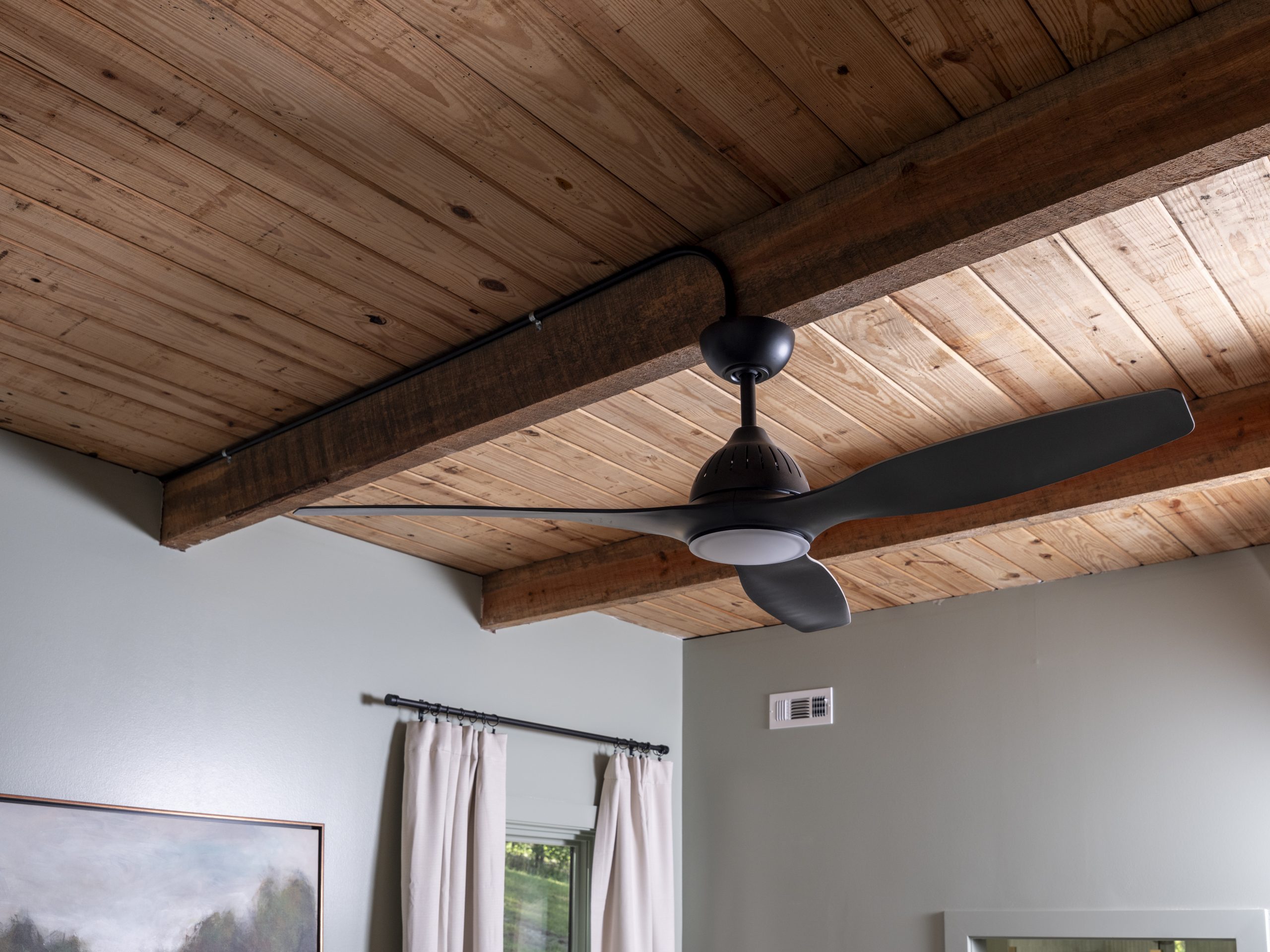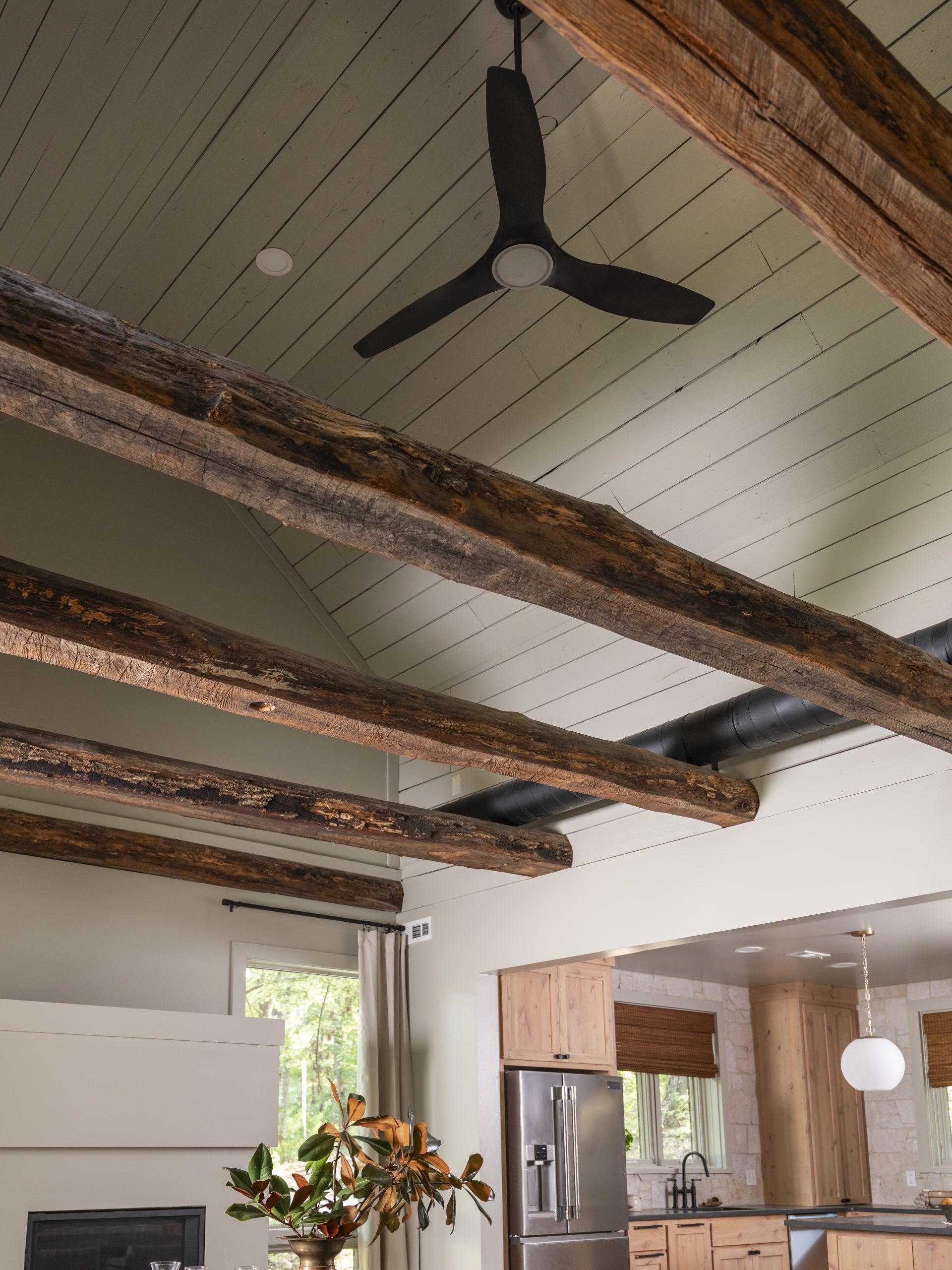 Above the dining area was an unused loft that the homeowners suggested removing to create a vaulted ceiling with exposed beams, letting natural light from the dormers spill in. I wasn’t sure about it at first, since the ceiling was asymmetrical and not the traditional shape you expect with a vaulted ceiling. In the end, once the flooring was removed and the entire area was painted, it turned out to be a beautiful update.
