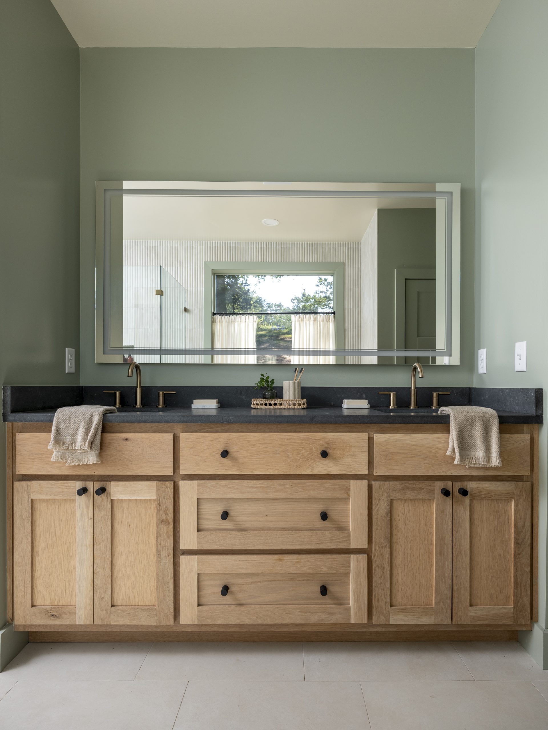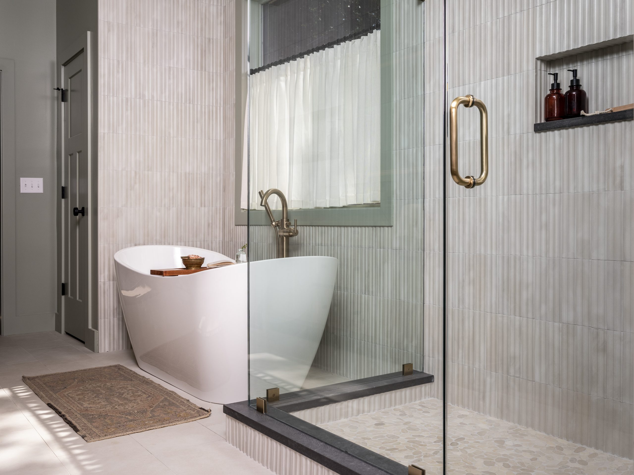 With a fresh slate, we were able to give the Wolfes a large, modern bathroom, complete with a tub under the window and a spacious walk-in shower. They loved the unique wavy tile pattern and the bright, airy feel of the space overall.