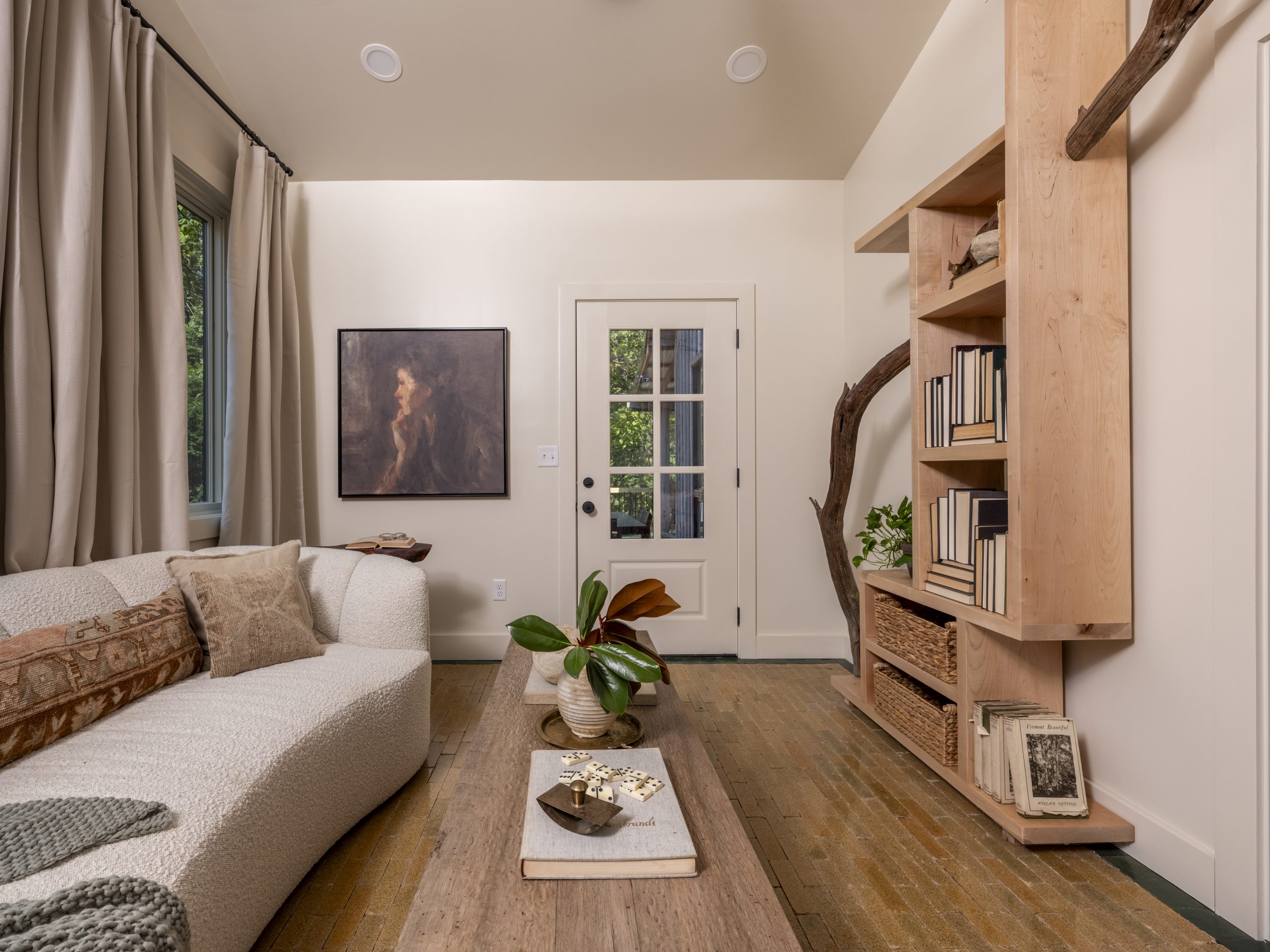 It was important to Emily to have a designated workspace in her new home. Since she tutors students online, I wanted to give her something fun behind her where she could sit opposite the windows. Dave built a bookshelf with a unique piece of driftwood running through the center, adding a whimsical, natural element that fits perfectly with the style of the house.