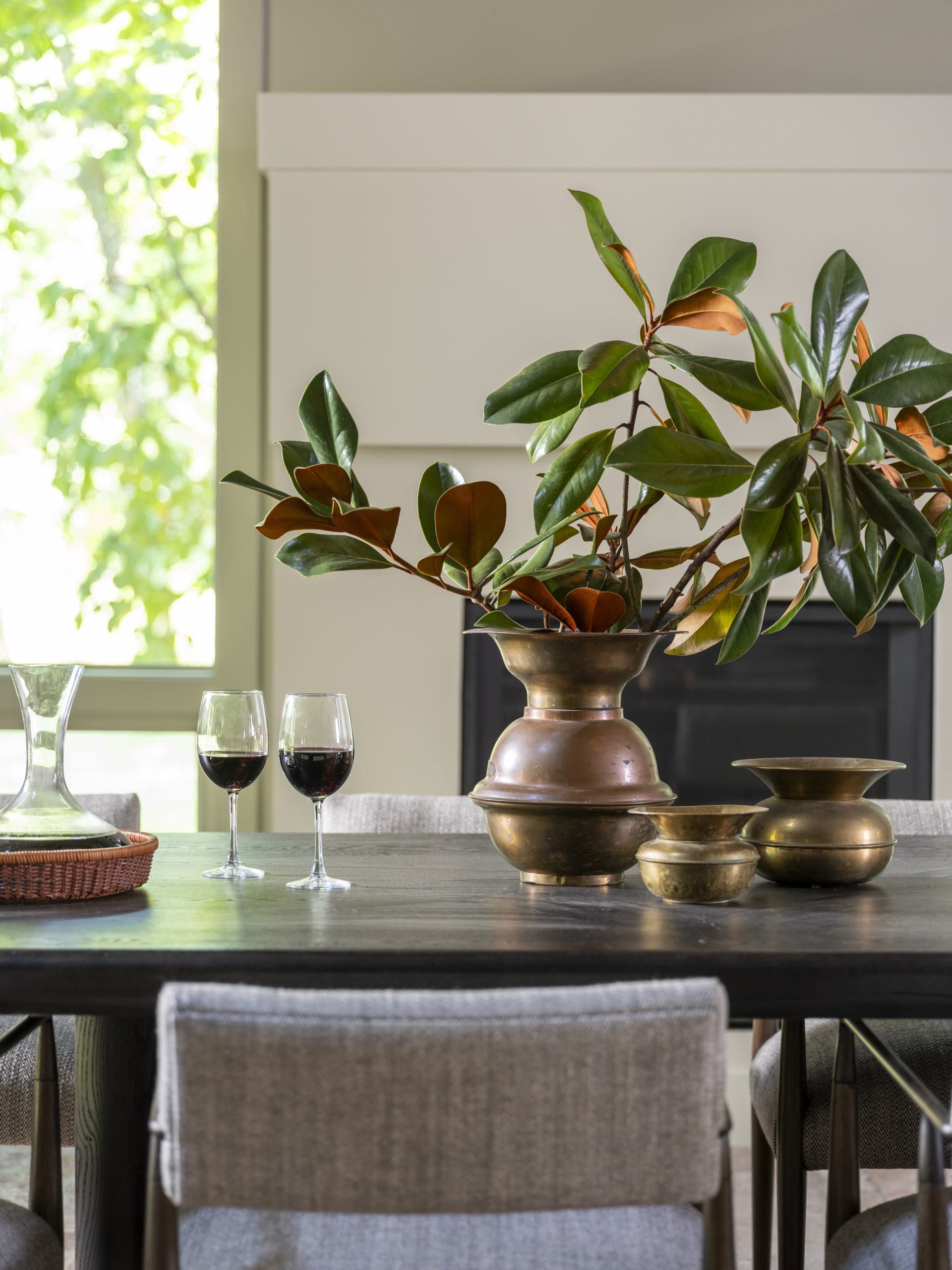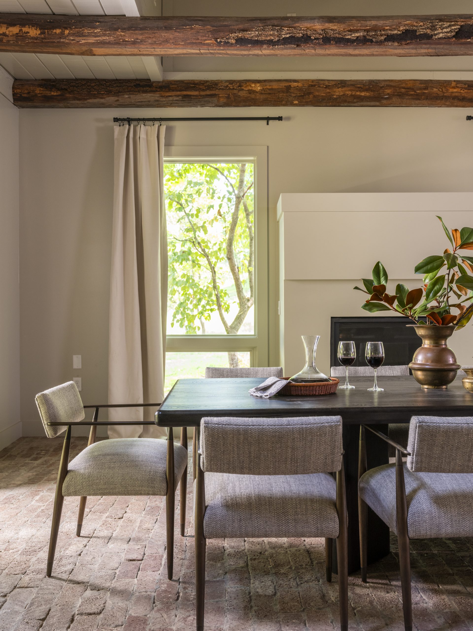 Between the open kitchen, living room, dining area, and the high vaulted ceiling, this part of the house could have felt cavernous if we had gone with a traditional white paint. Instead, I chose a warmer taupe that complements the brick and wood beams, creating a much cozier feel.