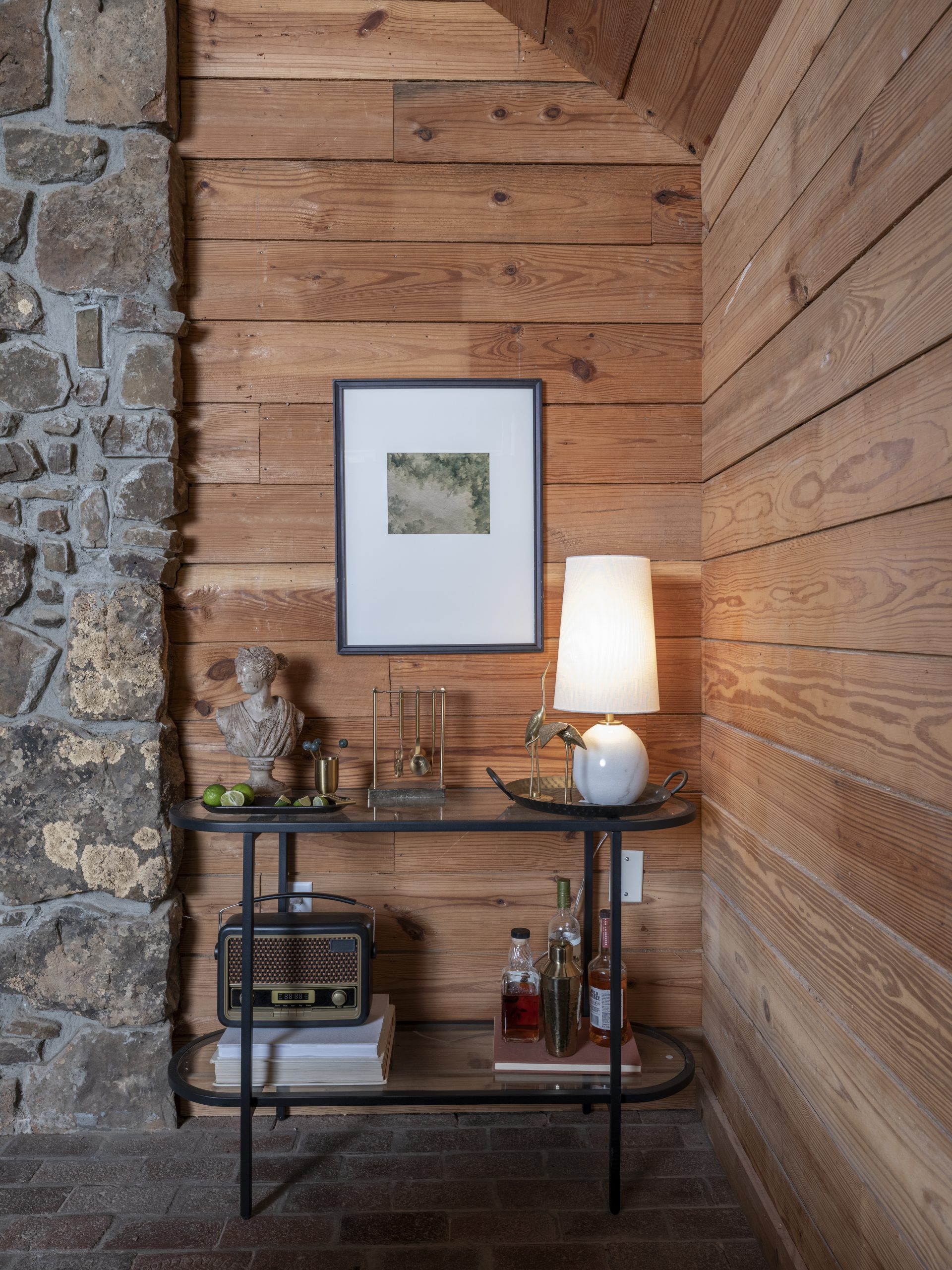 Dave used an old rusted barrel and walnut planks he found on the Wolfes’ property to create a one-of-a-kind repurposed coffee table. It was a fun addition to the man cave, and we always love finding ways to reuse old materials, especially when they bring in authentic details that reflect the history of the space.