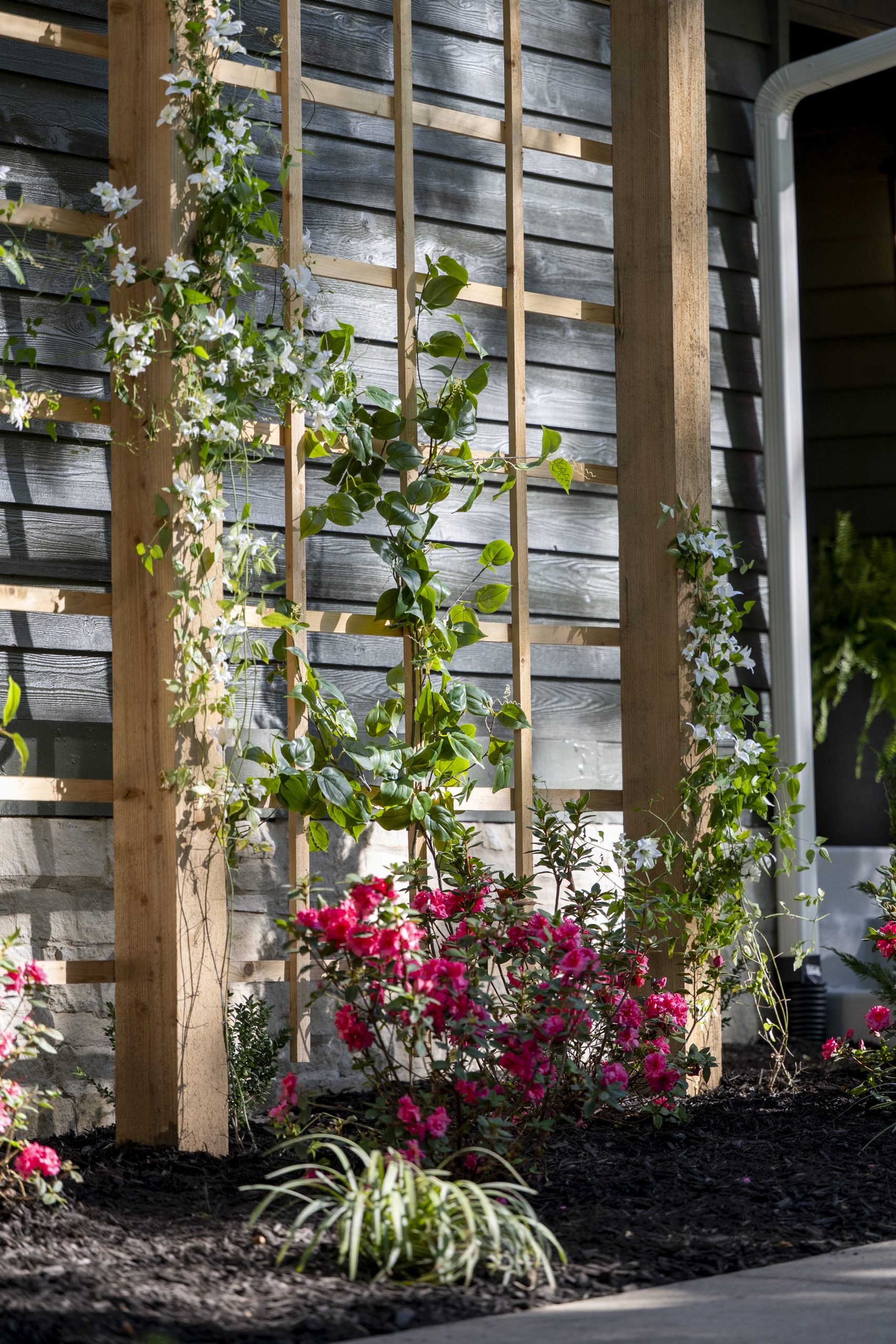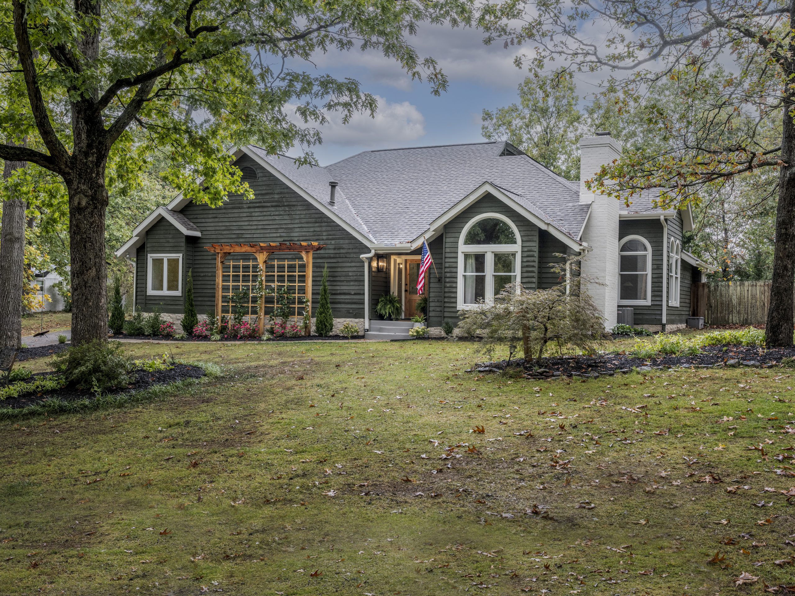 Renee told us she wanted the outside of the house to look more modern and natural, ideally in a darker color. We went with a shade of green on the cedar walls and added stone over the brick to tie in with the house’s natural surroundings. To break up the large, awkward wall at the front, we installed an arbor that adds visual interest and brings balance to the overall exterior.