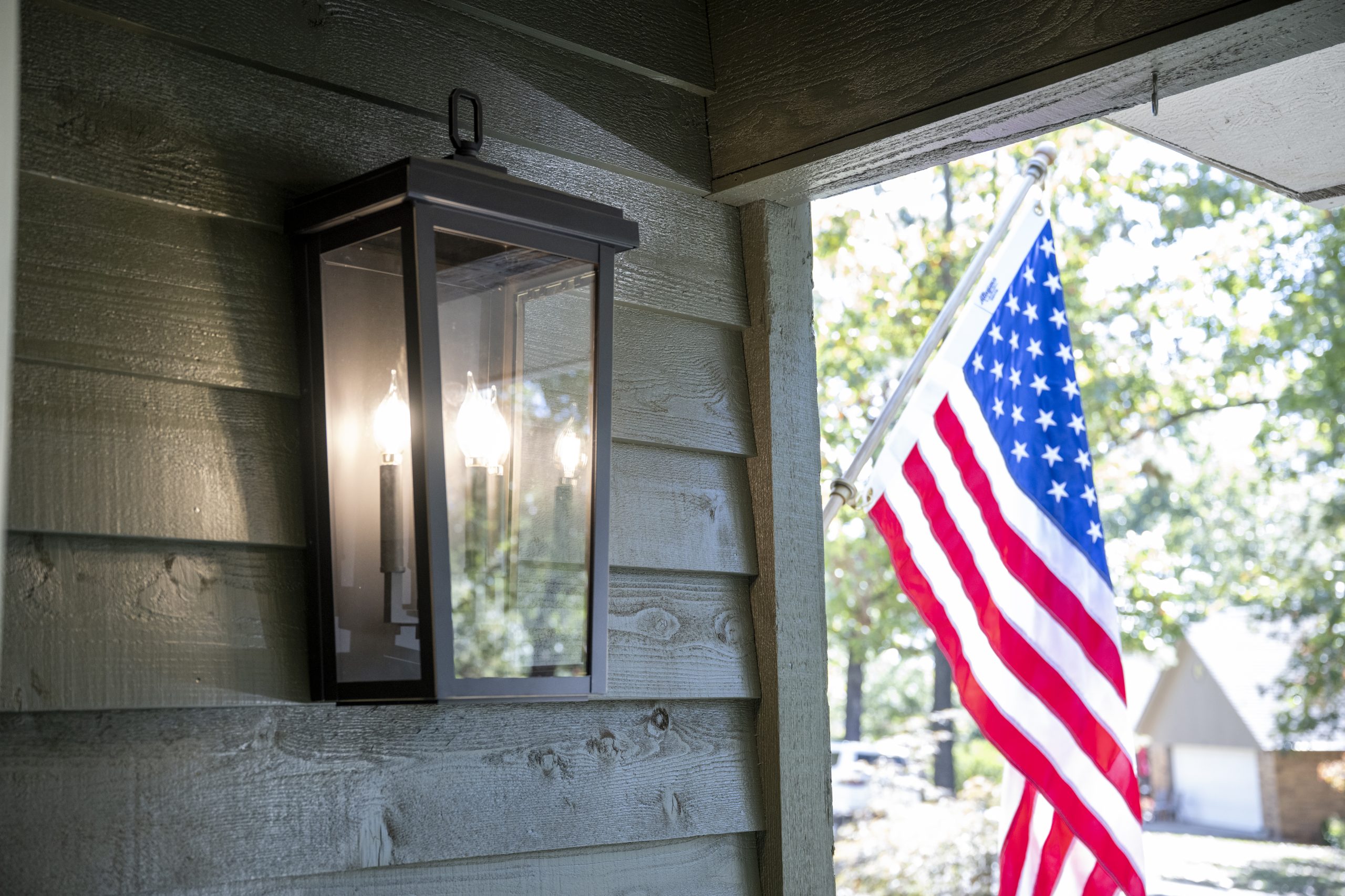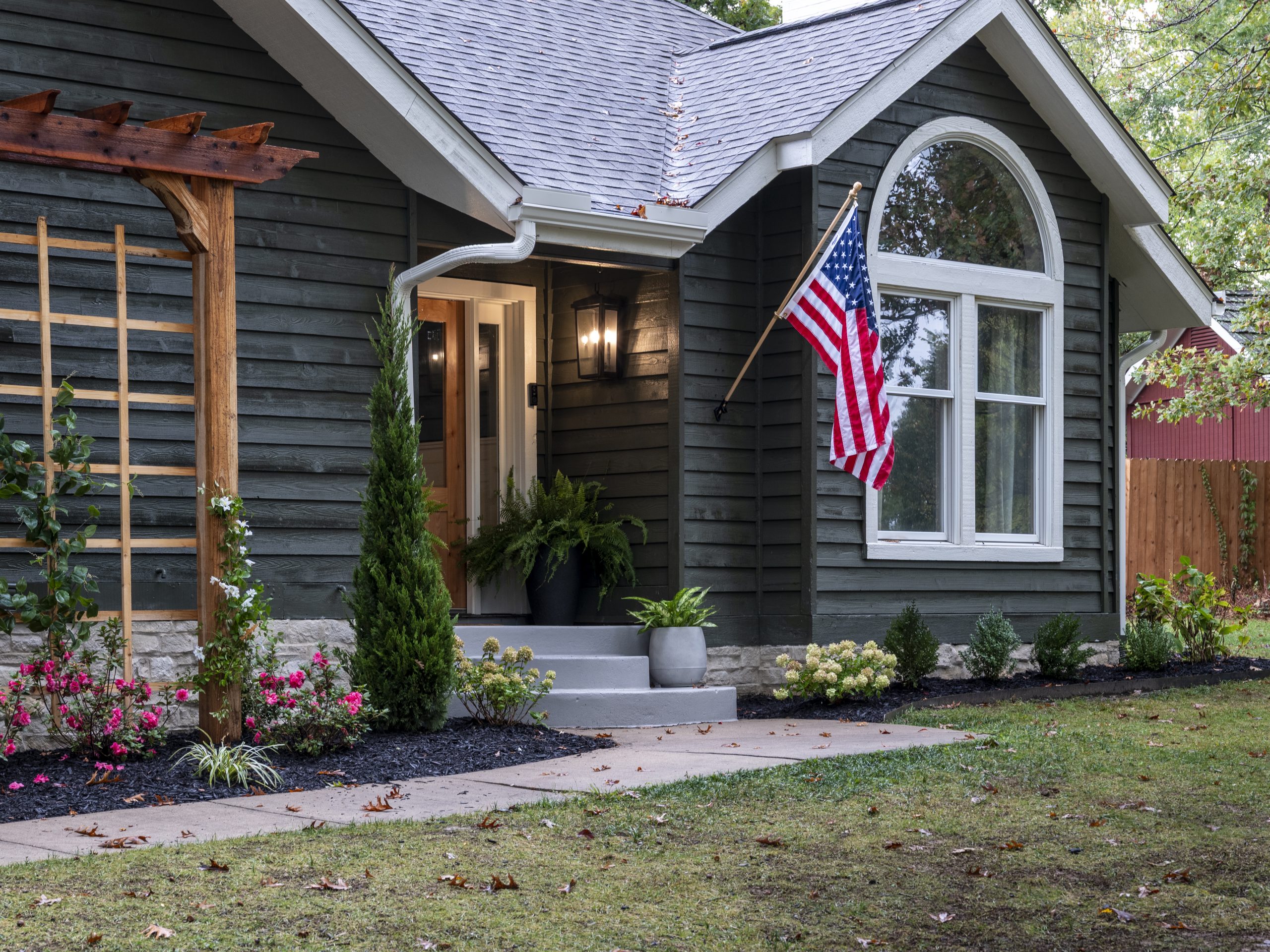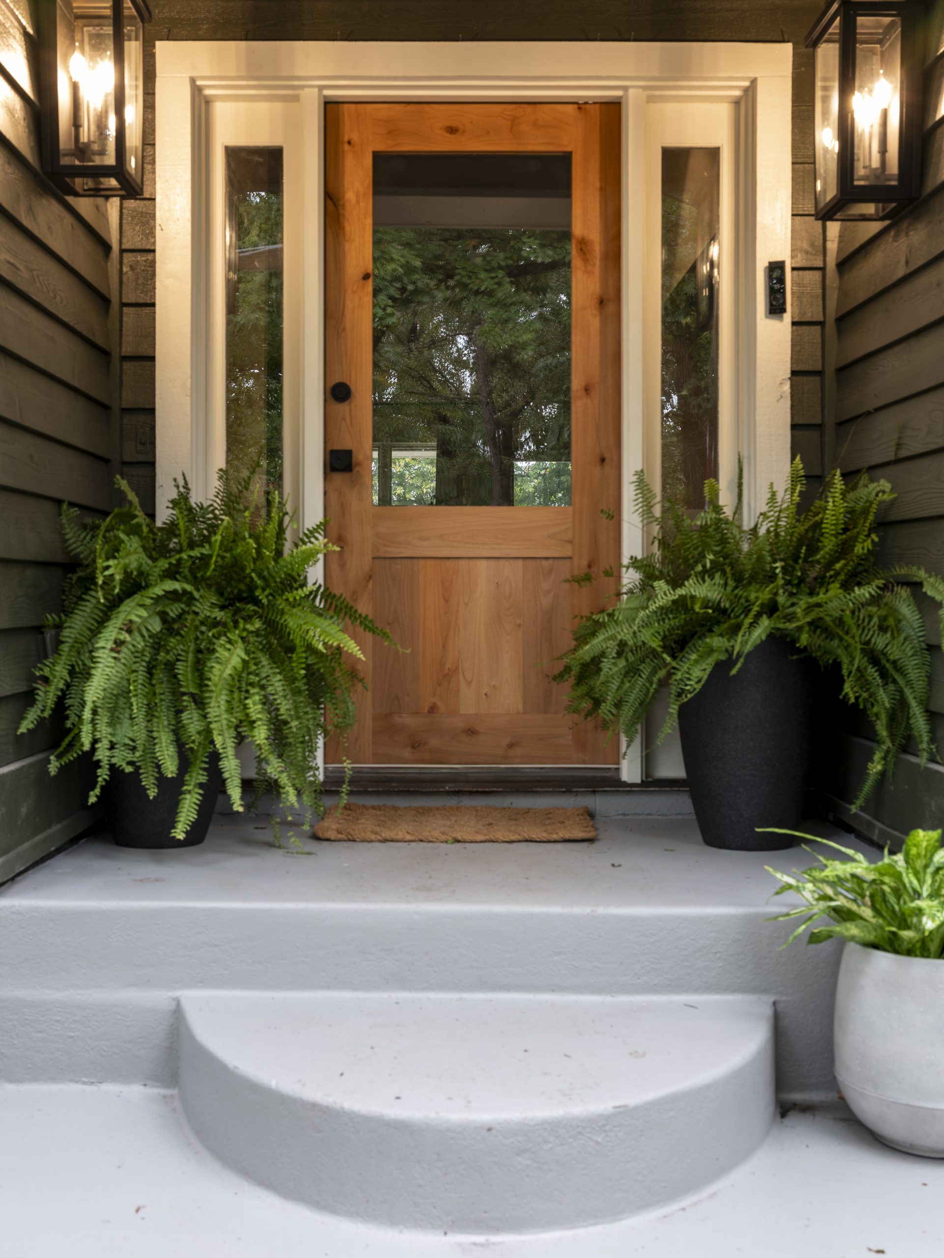 White window trim, new landscaping, a new front door, and new lighting pull it all together.