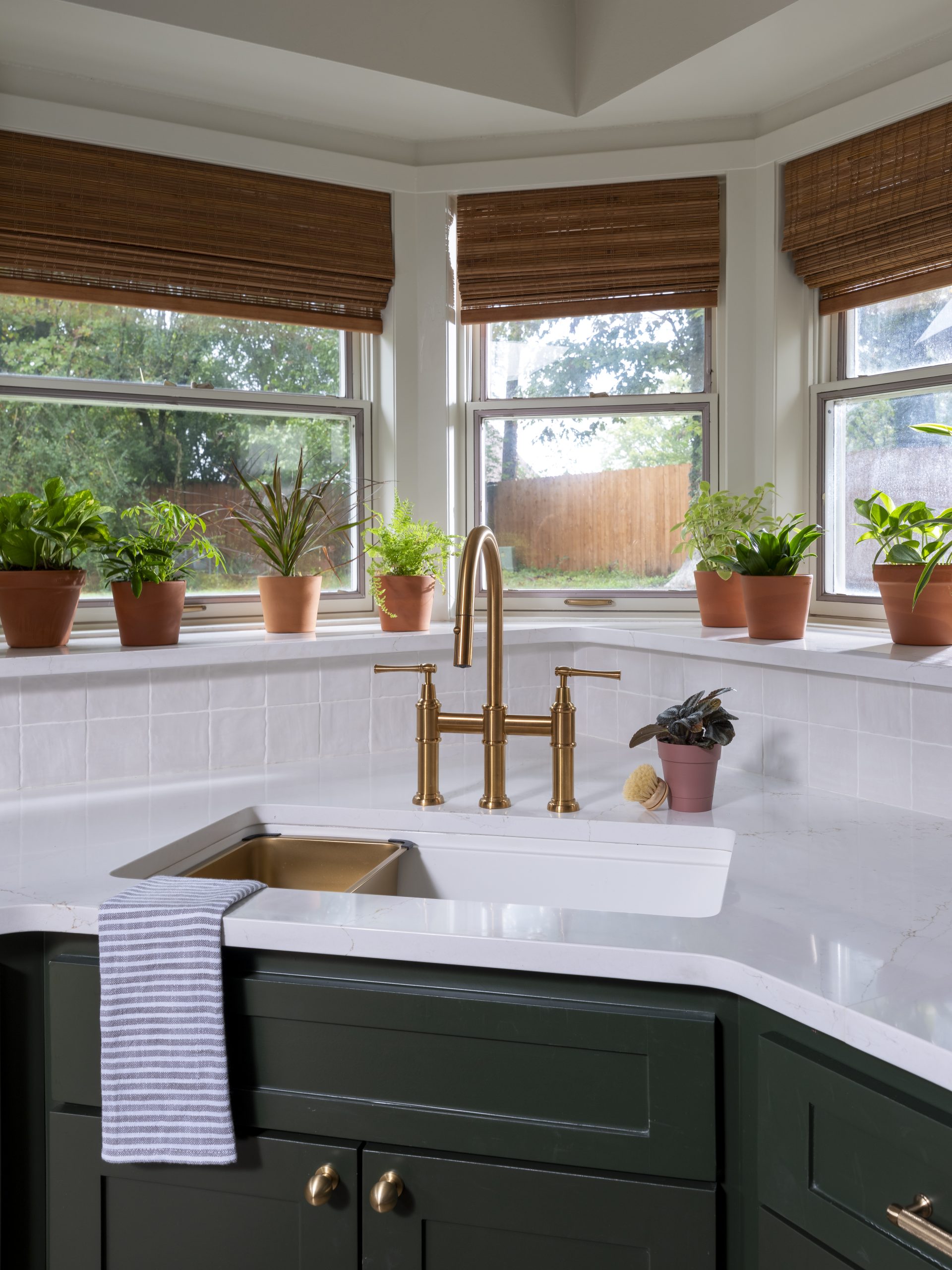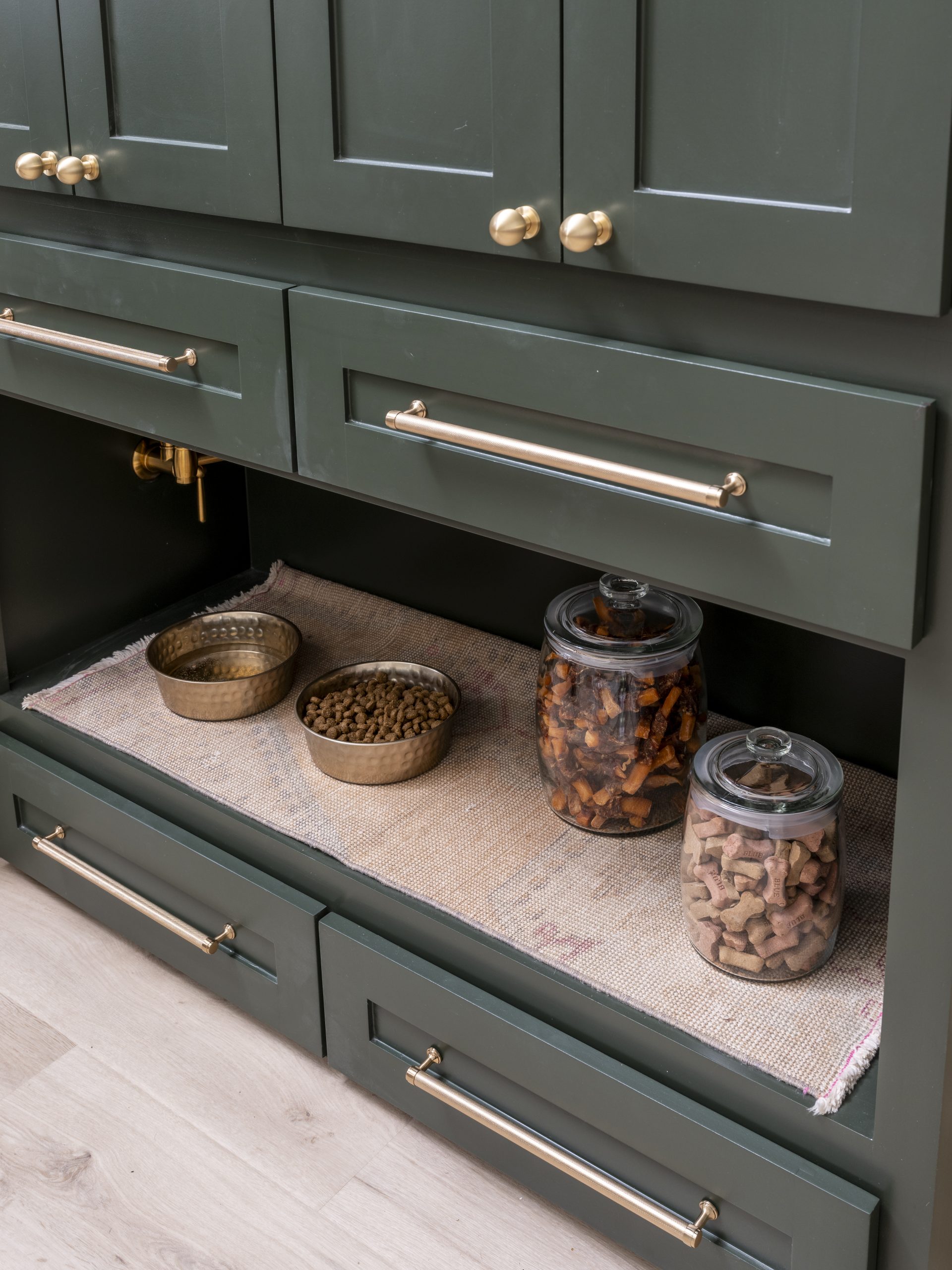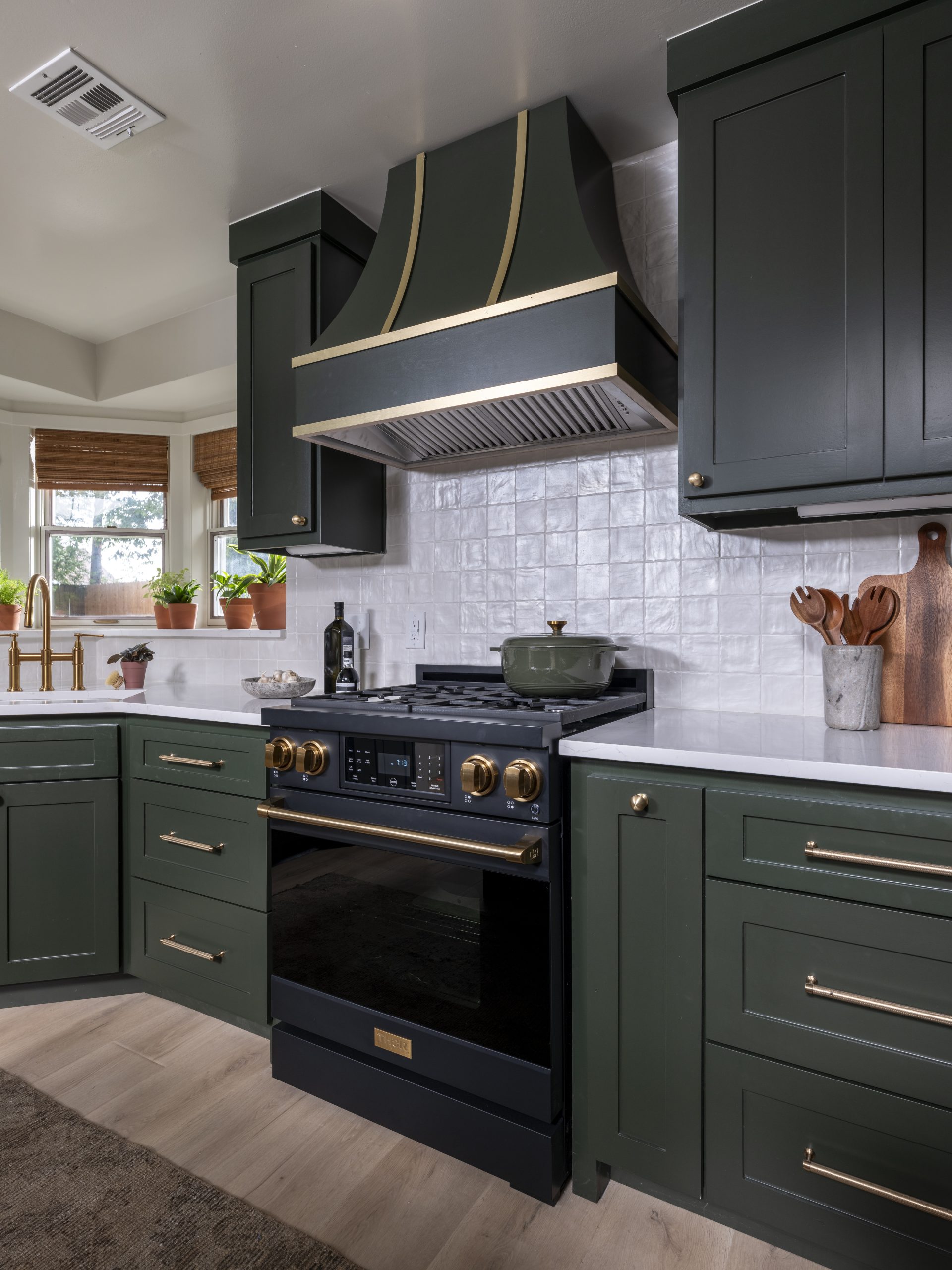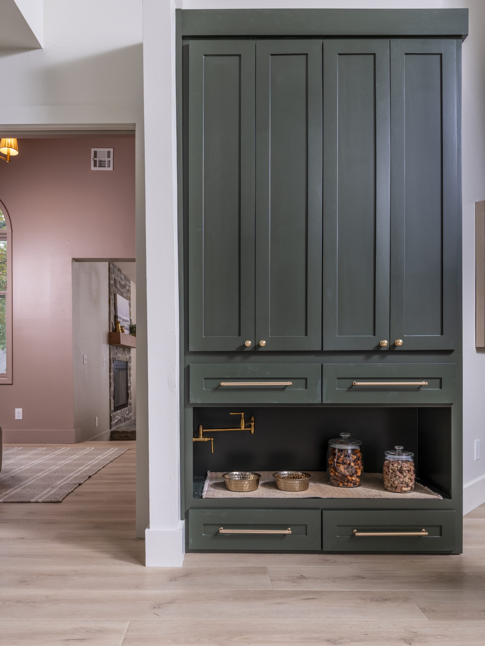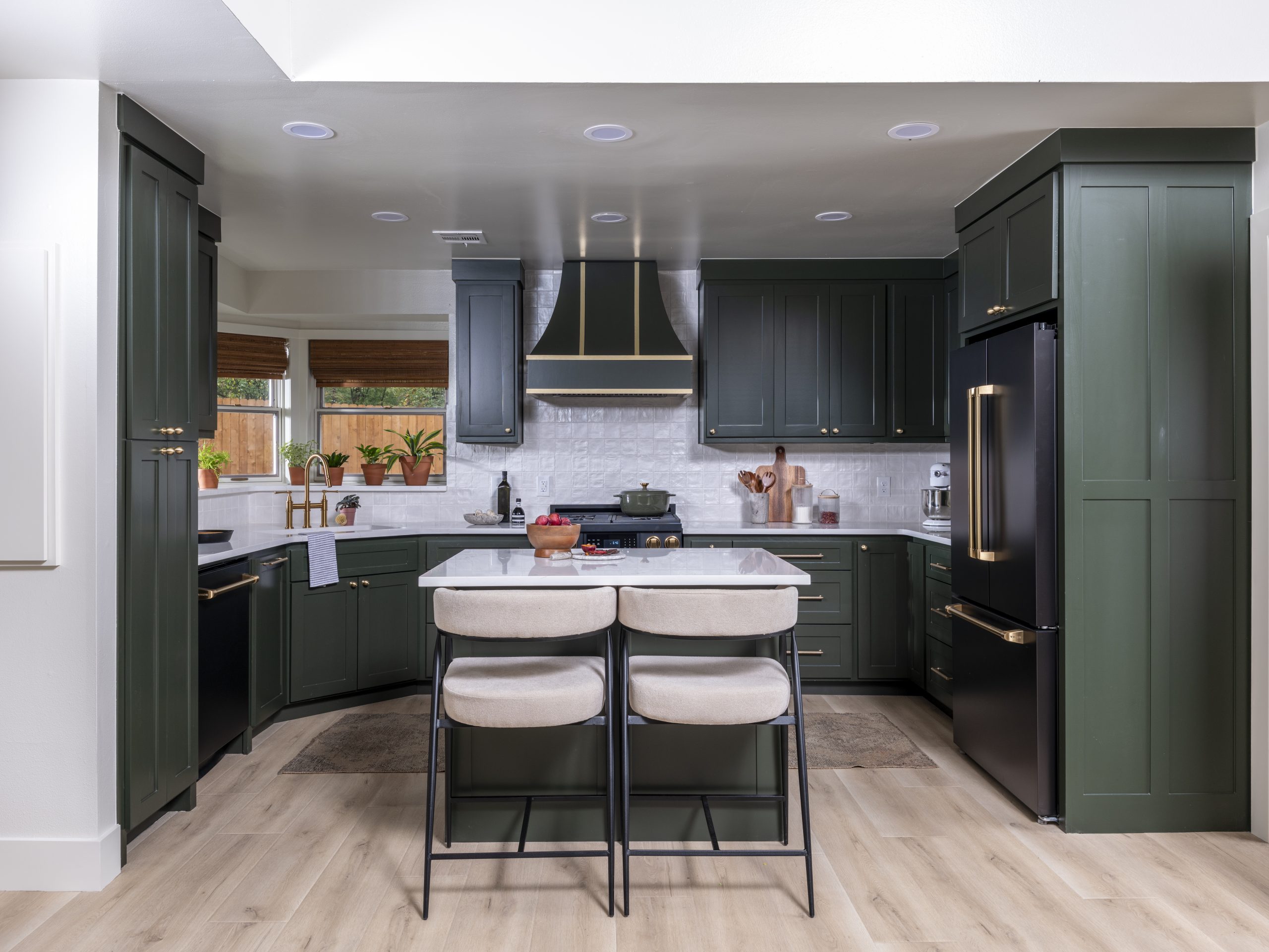 Renee’s kitchen was dated and not functional. It had lots of odd shapes and corners and was missing a pantry. We gutted the entire space and started over with new cabinets, new appliances, and a simpler little island in the center. By closing off an unneeded window, we gained wall space and were able to add a pantry. Renee loved the cute little alcove at the bottom for her puppy’s food and water dish, complete with a working faucet for refilling his water bowl. The rich green cabinets and hood with gold accents contrast beautifully with the white stone-style countertops and soft white backsplash tile.