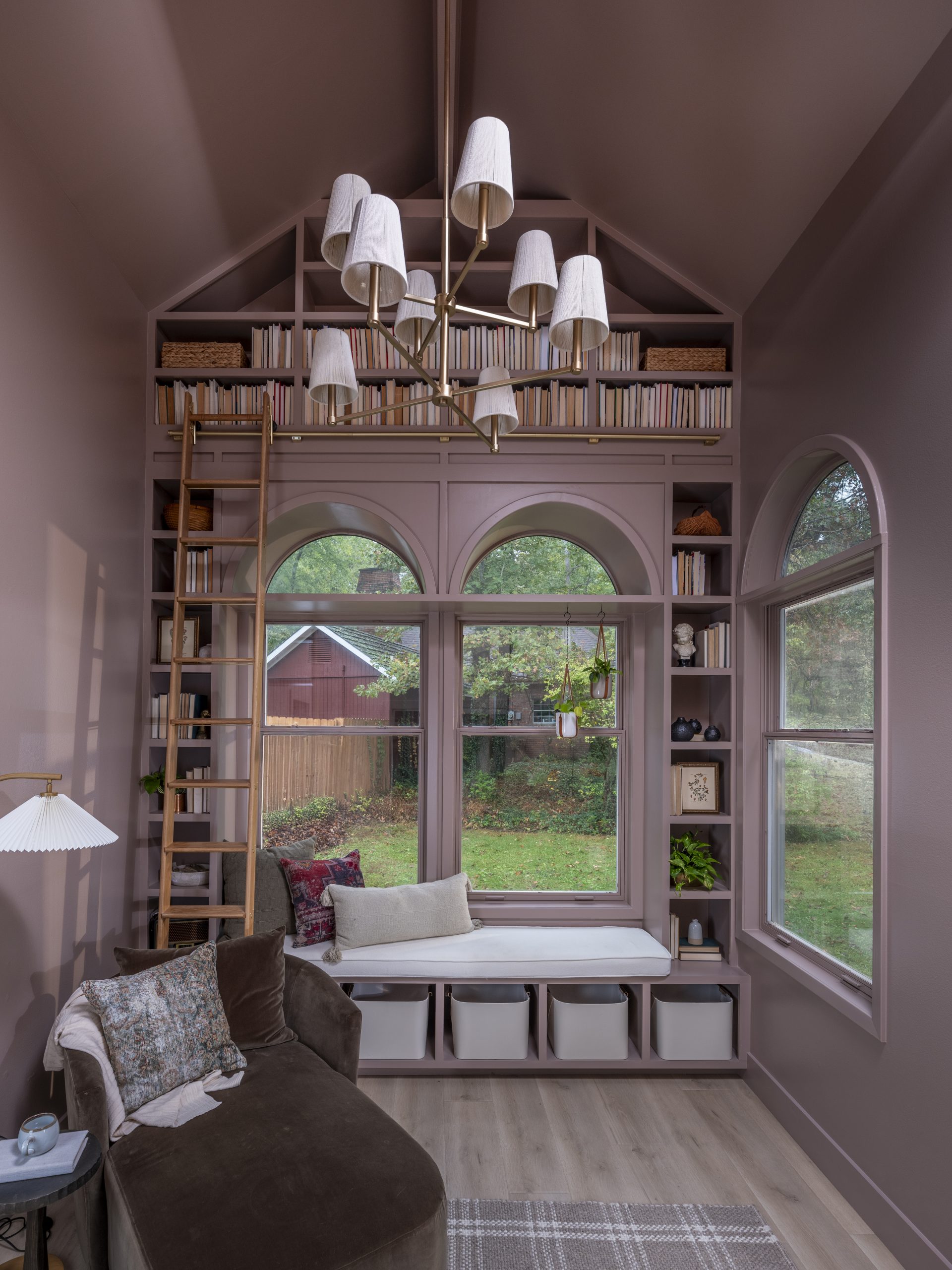Originally, this was a dining room that wasn’t being used. Renee asked us to turn it into a library. The high ceilings and arched windows made this the perfect spot for a floor-to-ceiling book wall with a rolling ladder.