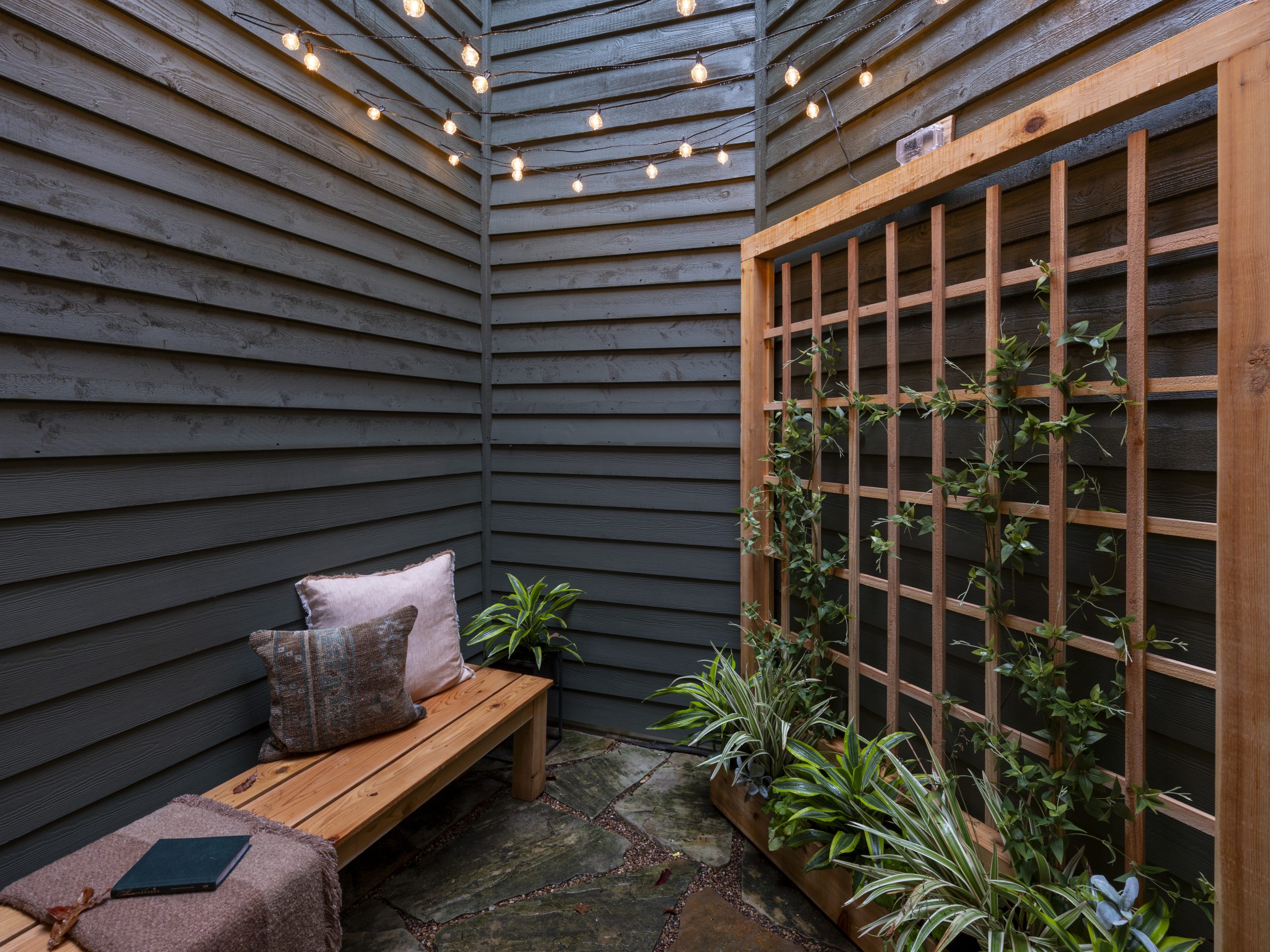 To make this space into a magical little garden for Renee, we added a wooden bench with a matching wooden trellis, fresh greenery, and cute hanging lights.