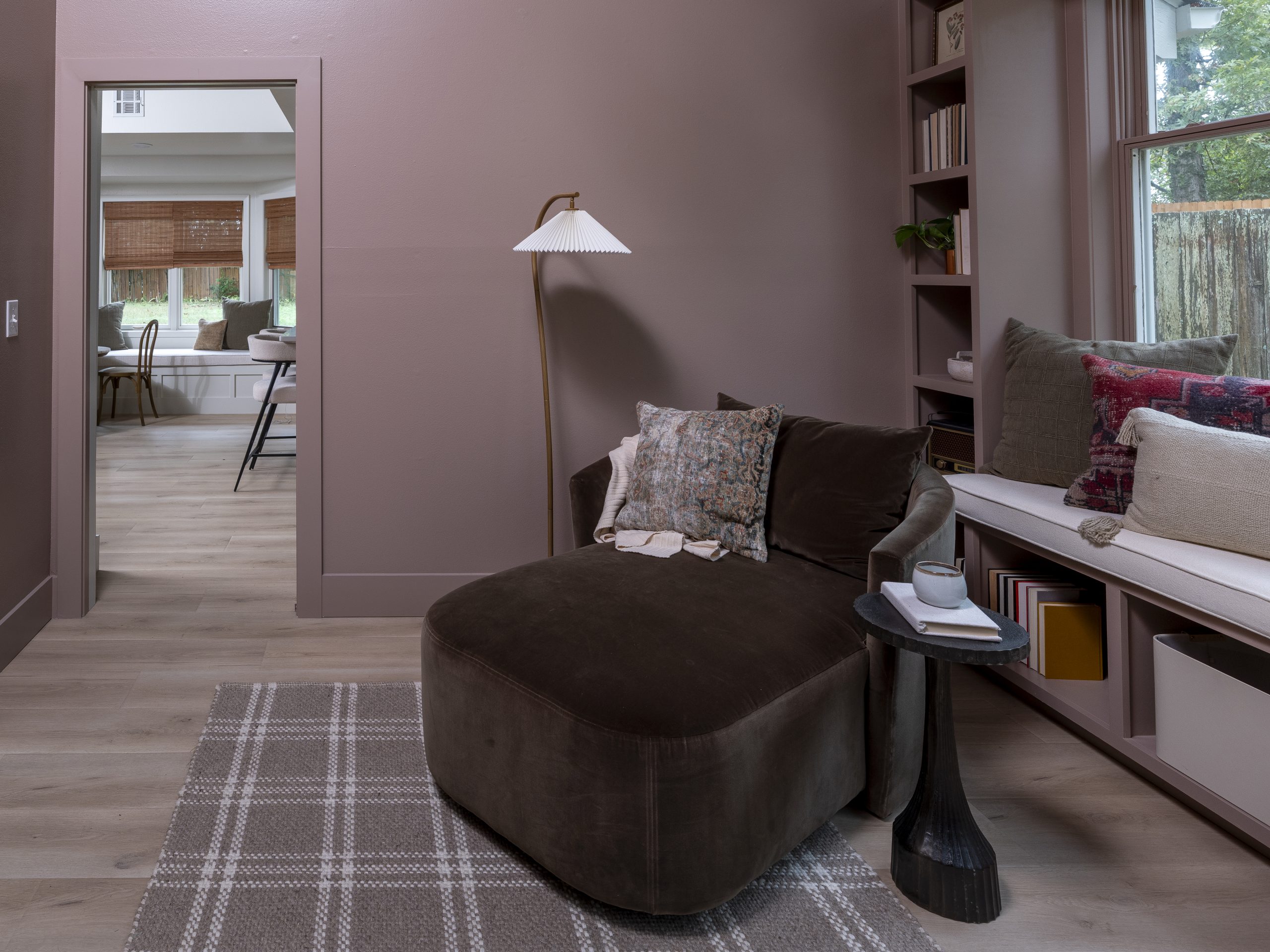 We replaced the slider that leads to the courtyard with a new energy-efficient one and painted the entire room (including the ceiling) a soothing blush pink. Of course, this space called for a cozy window seat and a beautiful chandelier.