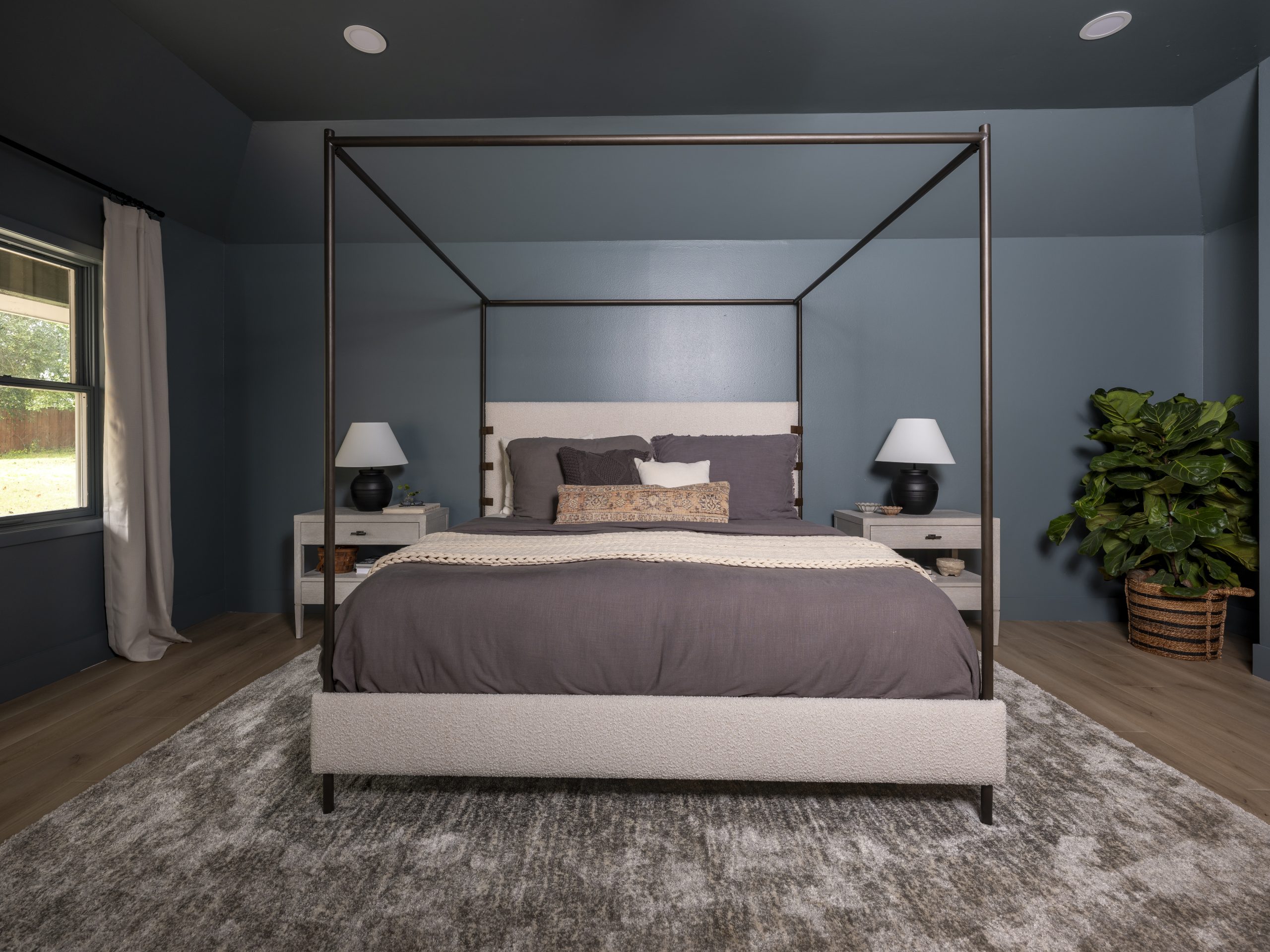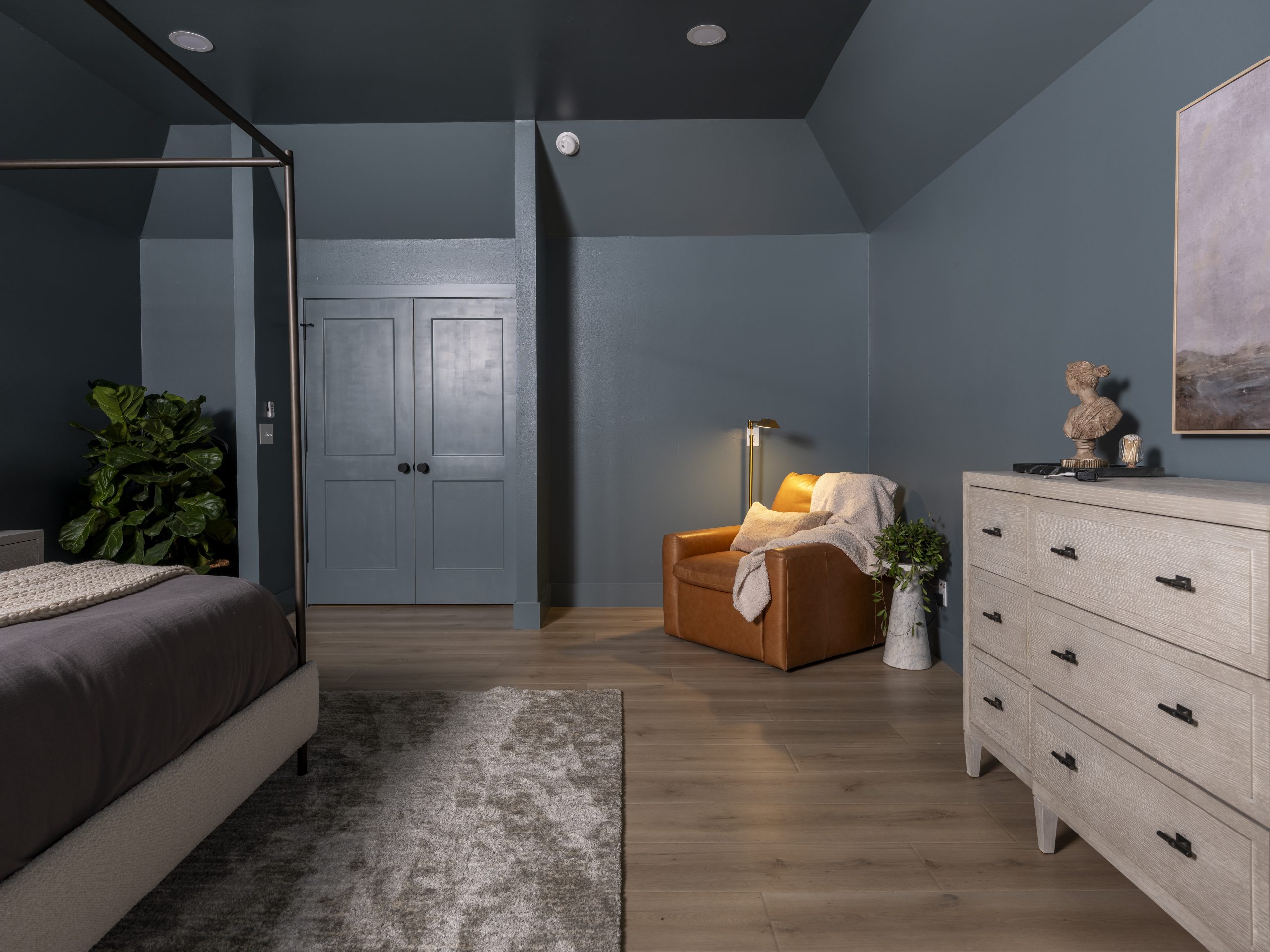 The room was carpeted and felt bland. The closet was small, with its door located all the way on the opposite side of the long bathroom, so improving access was a priority. Painting the room a darker color, replacing the flooring, and updating the furniture were simple, cost-effective ways to refresh the space. These changes made the room feel more restful and much cozier.