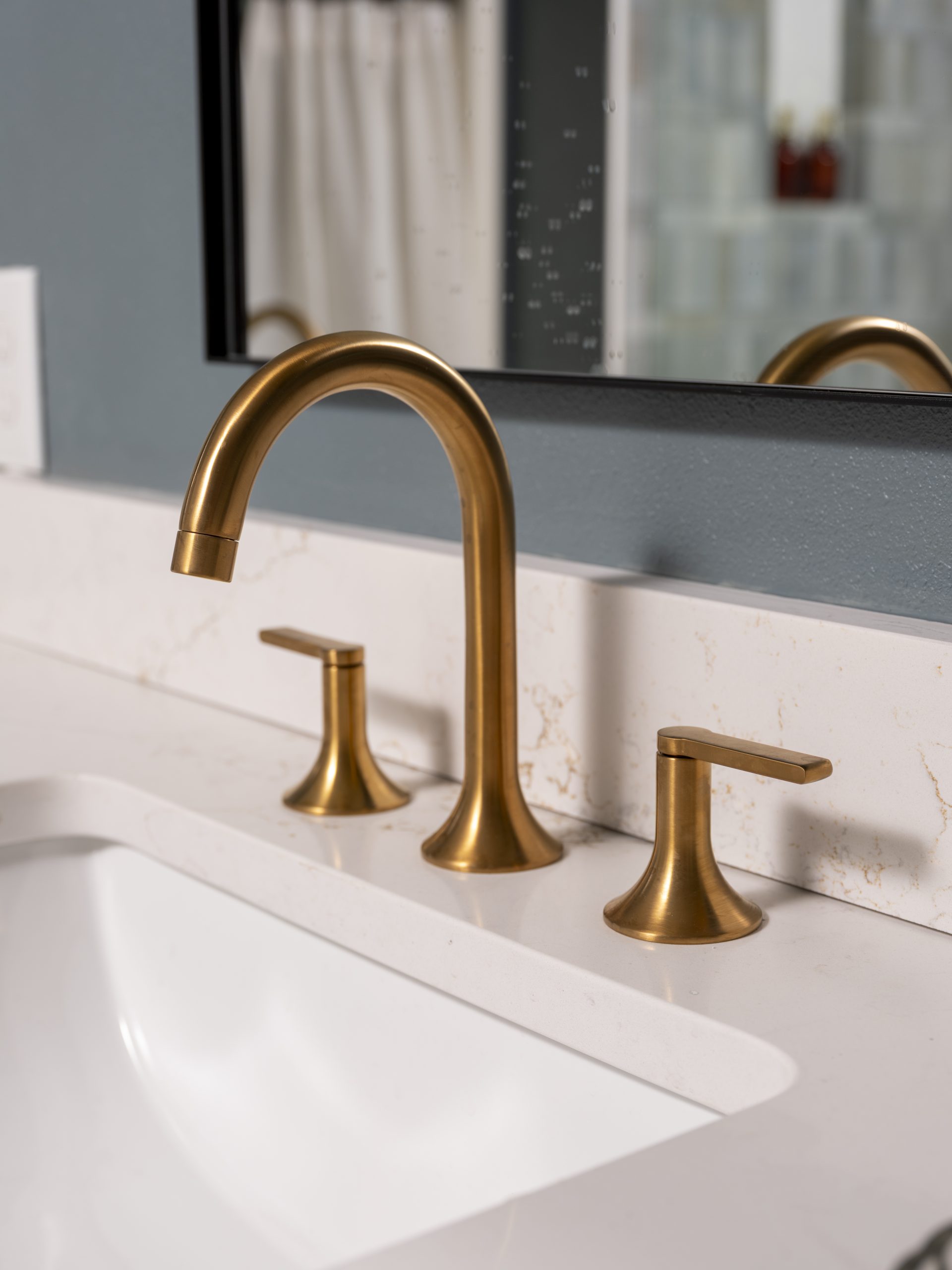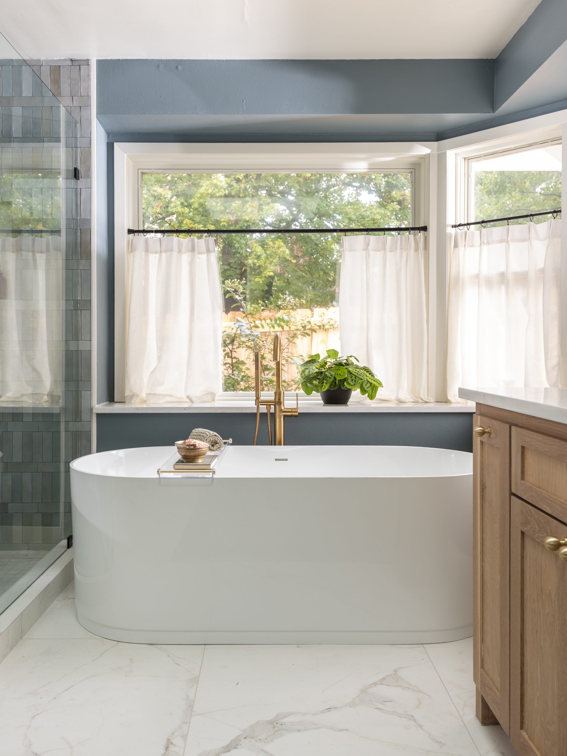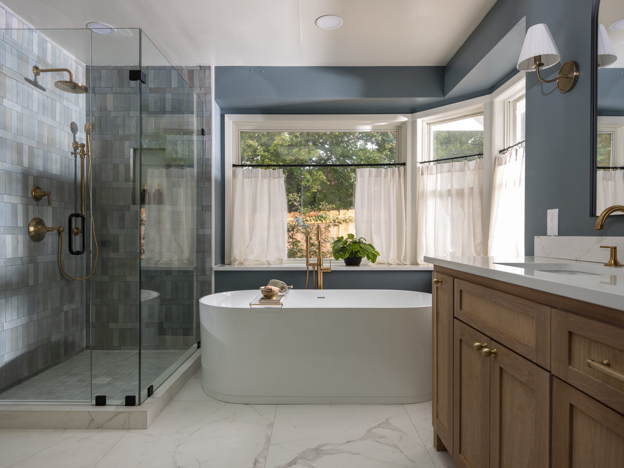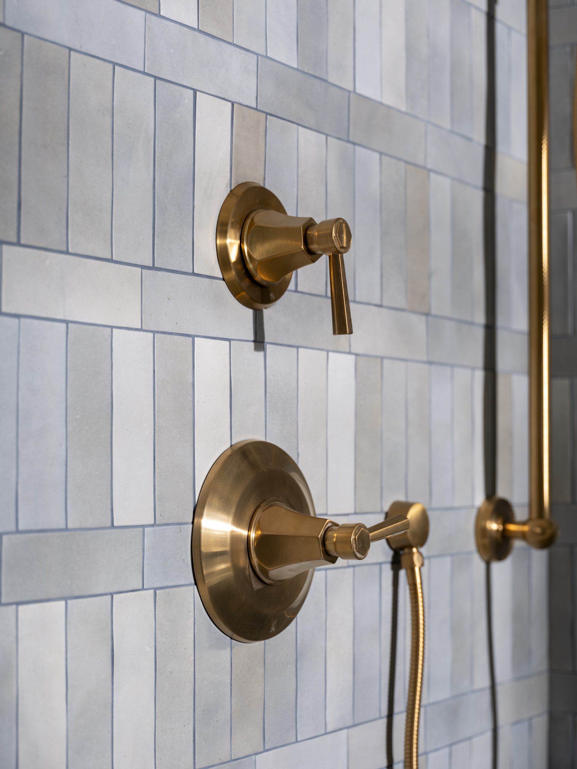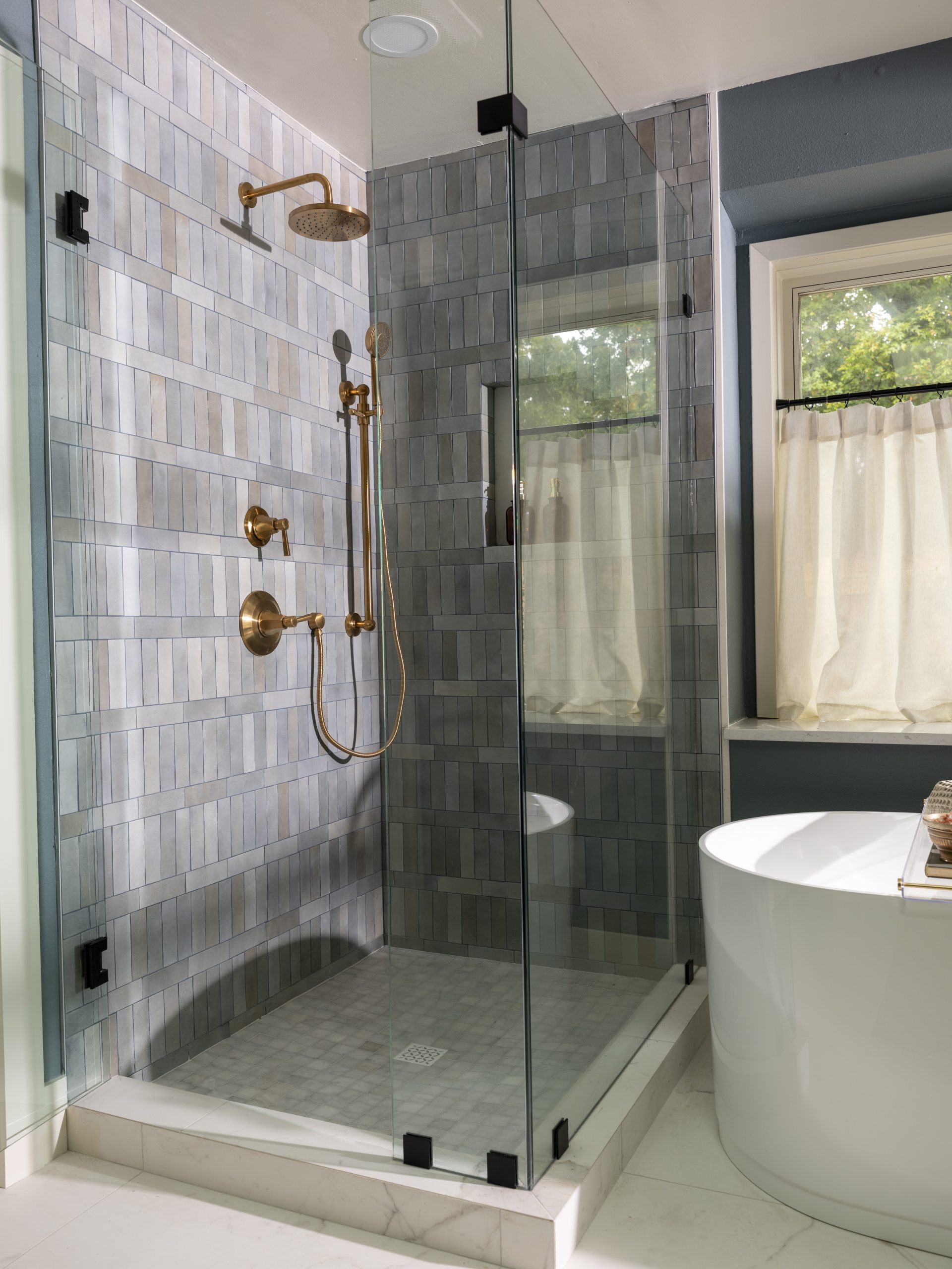 In the shower, we soldier-stacked the tile with a row running through the center. The gray shower tile pairs beautifully with the deep blue paint on the walls, which has subtle gray undertones. The gold finishes we added throughout the bathroom feel feminine and luxurious.