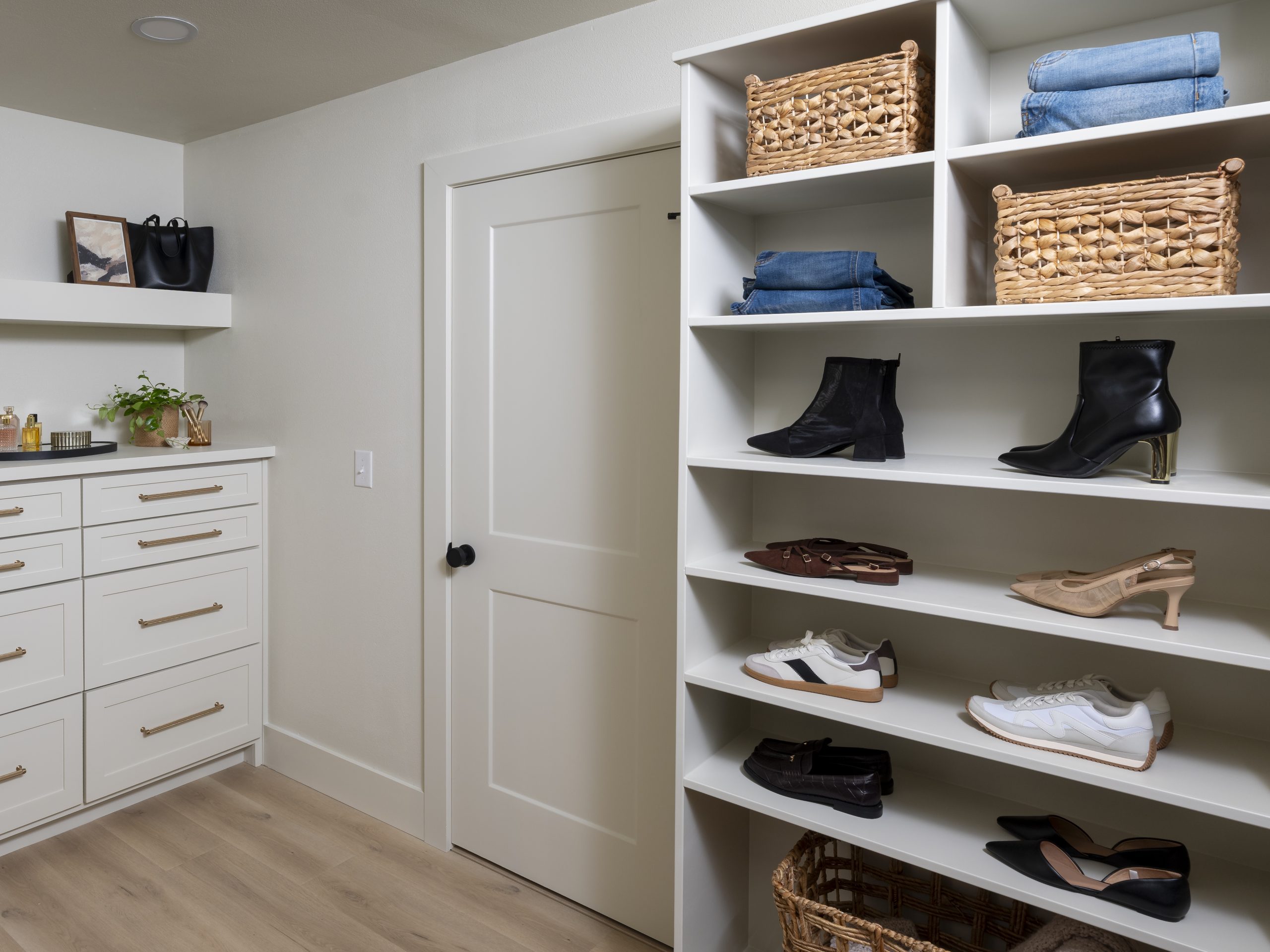 To make the closet larger, we borrowed space from the guest bedroom next door and added built-ins, including a built-in dresser. The result is a bedroom that feels updated, elegant, and still timeless.
