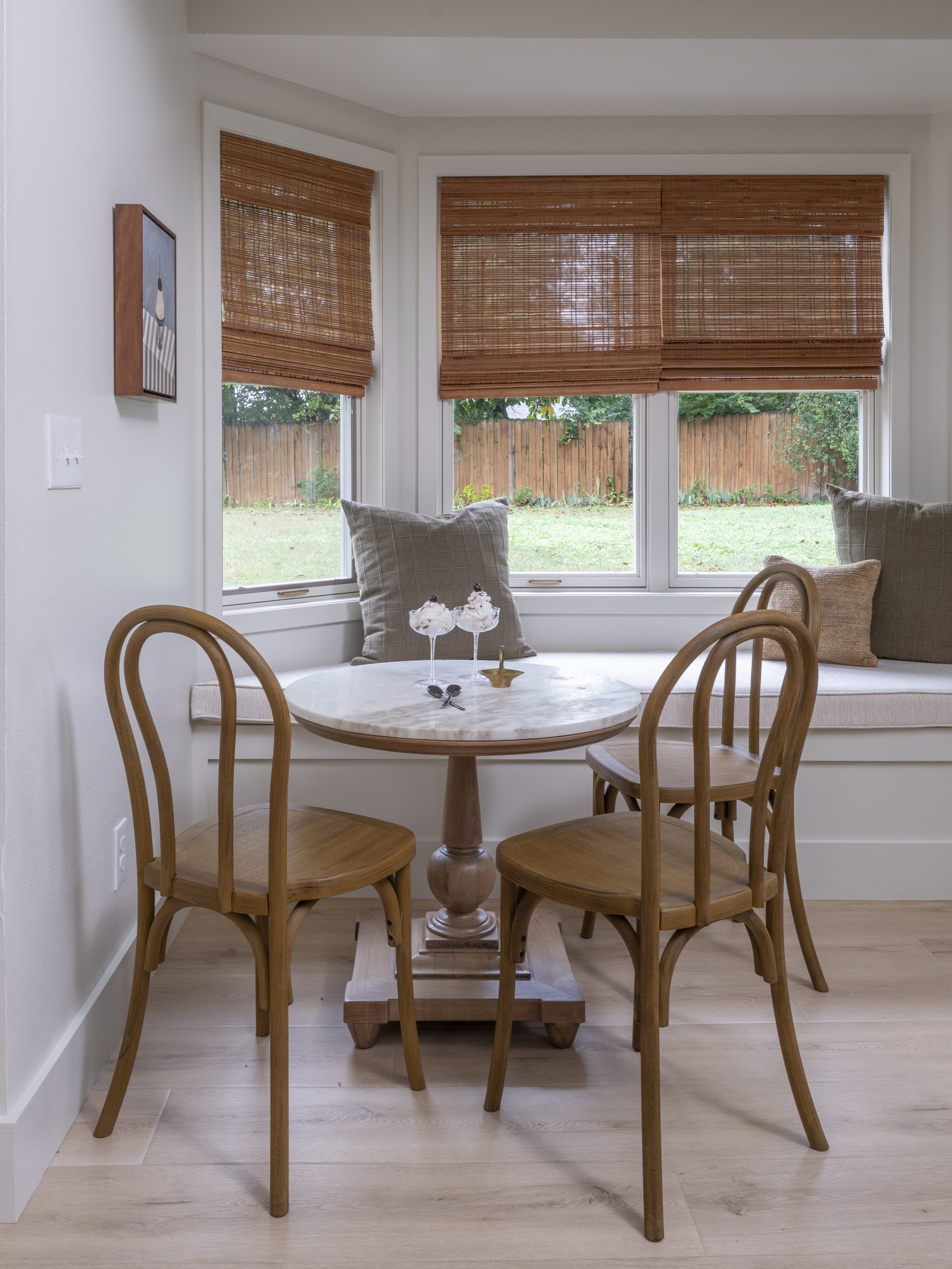 Just off the kitchen, Renee had a large window seat area that was nice but too deep to sit comfortably. We trimmed back the benches to keep just the section directly in front of the window and added a small circular breakfast table.