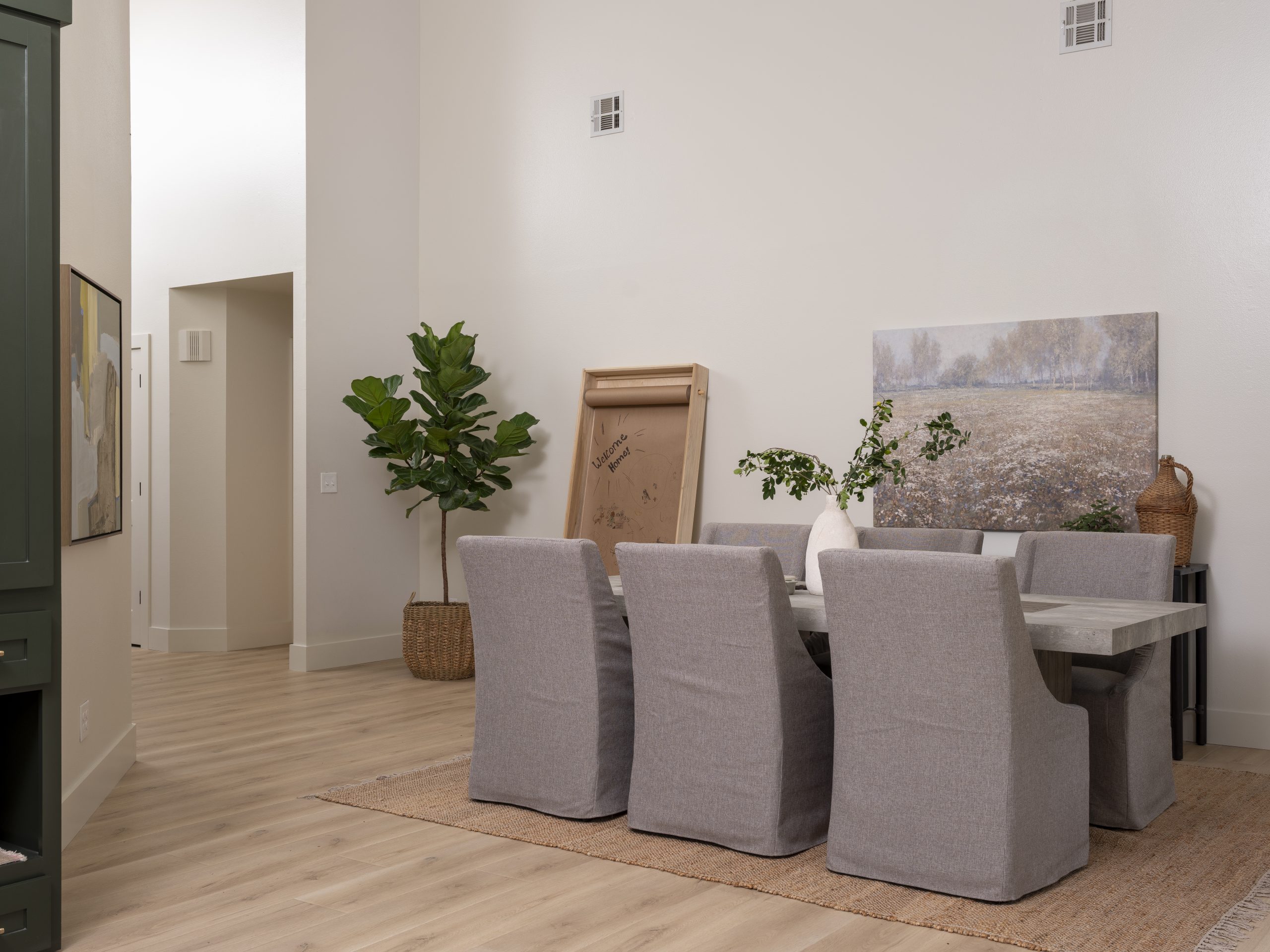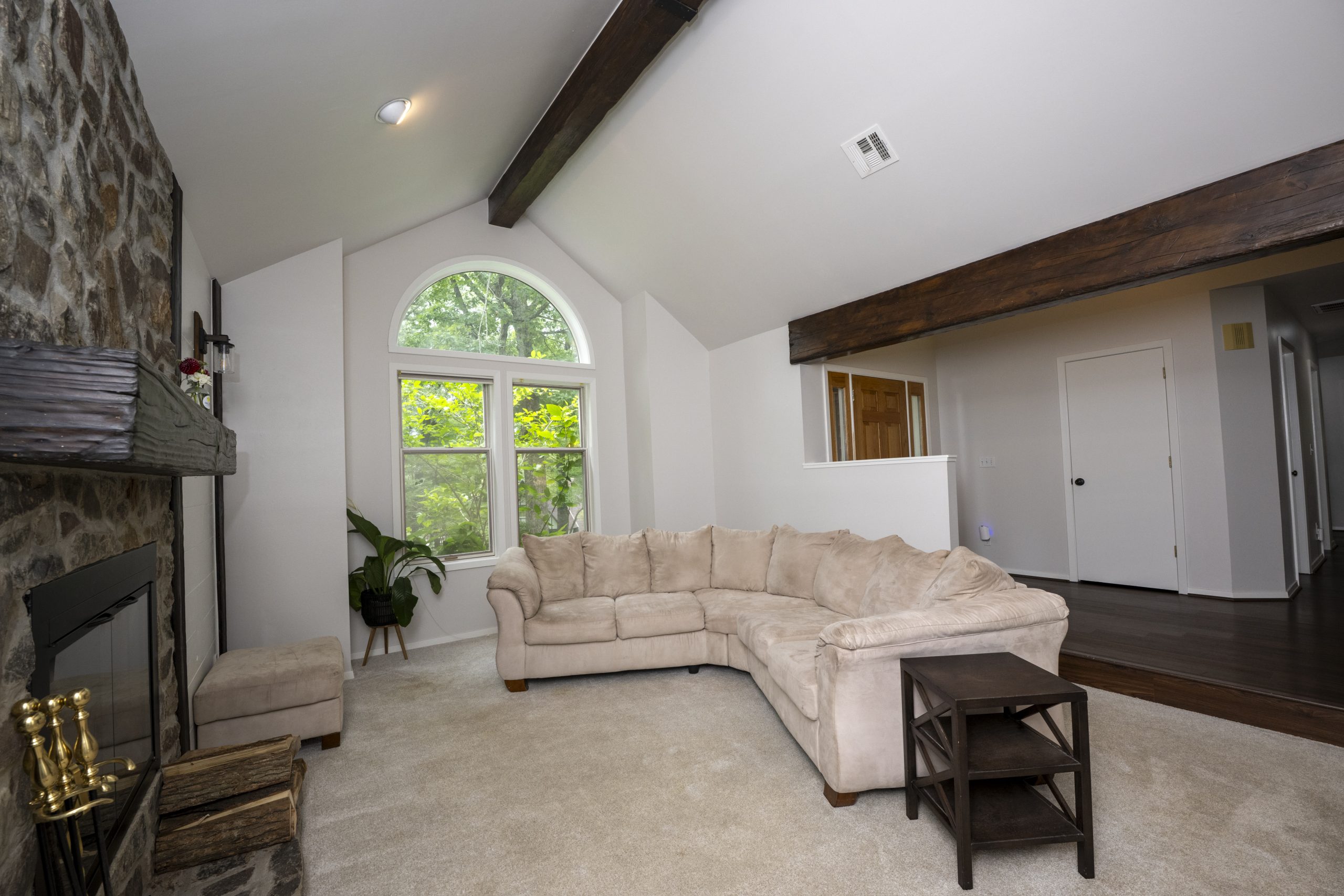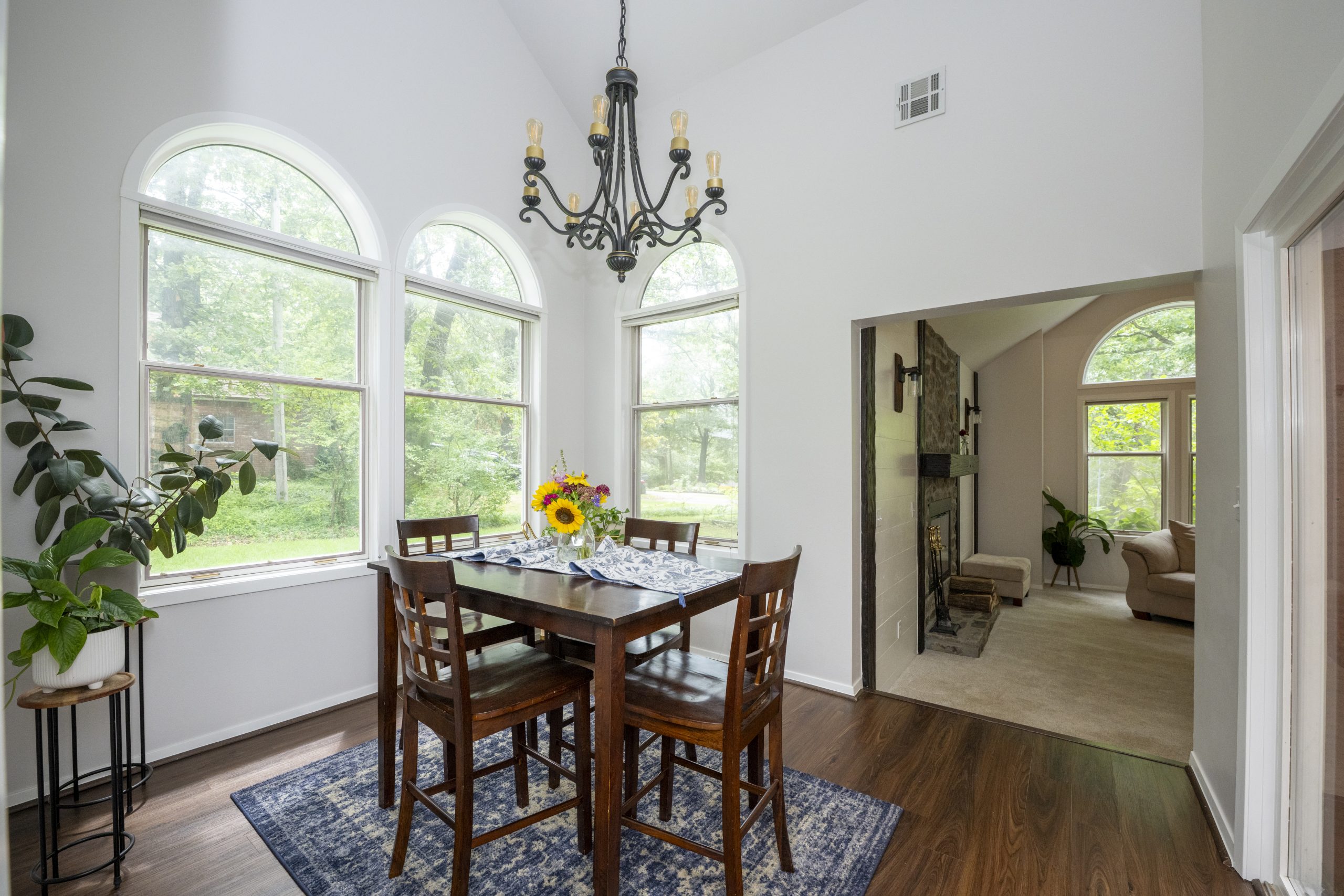When you walk in the front door, the living room is the first room you see. The shiplap on the fireplace wall did not match the rest of the house, and there was carpet in this room, which Renee didn’t like. Our plan was to replace the flooring, remove the extra elements, and make this a nice, cozy space with the fireplace as the center point. We were able to do that by swapping the oversized sectional for smaller furniture pieces and adding a new fireplace mantel, new lighting, and new LVP flooring throughout the house. Now this room is a great place to entertain and watch movies.