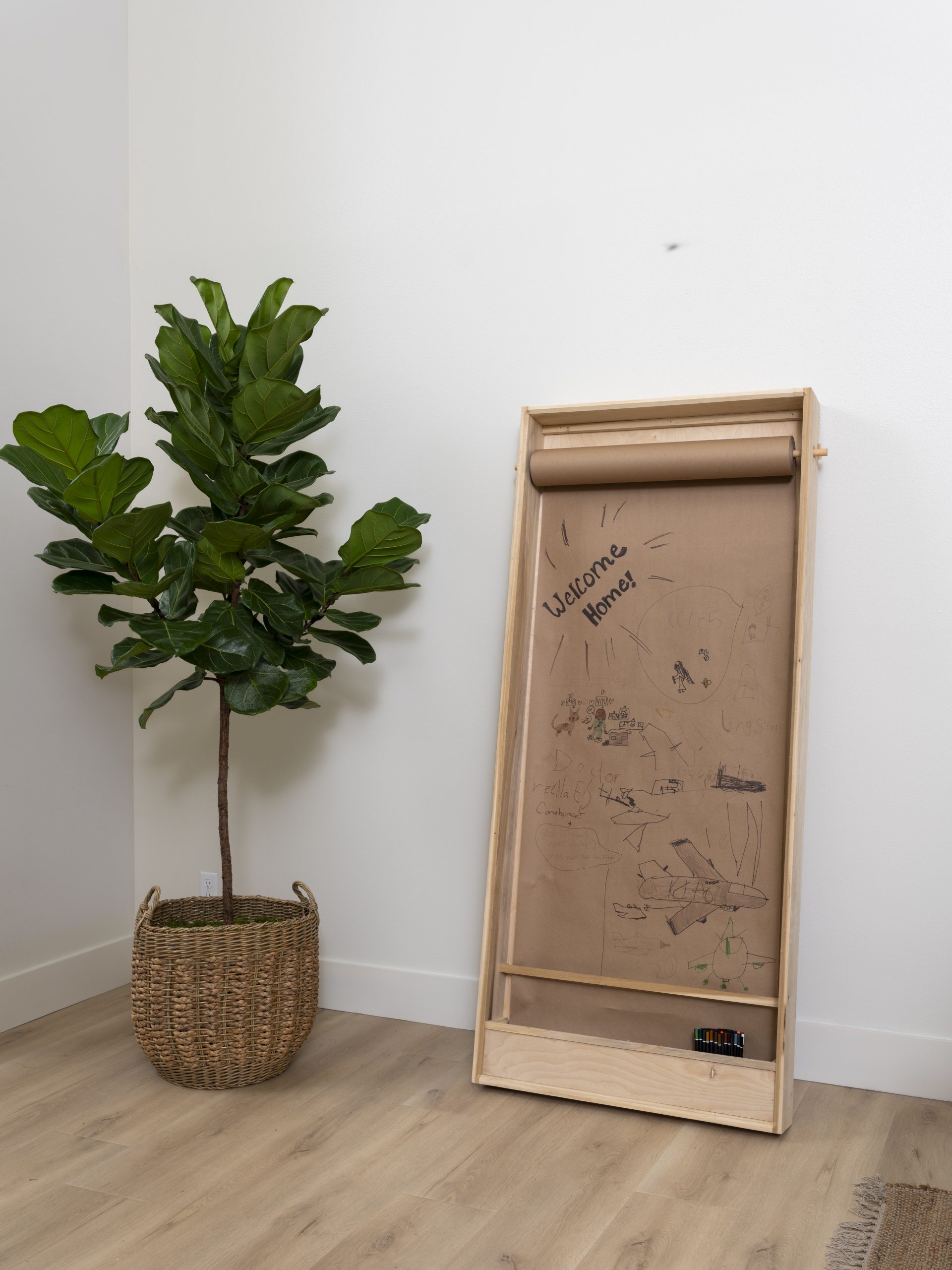 Originally, this was a bonus area that Renee didn’t quite know what to do with. Since we turned the dining room into a library, we moved the dining table here, and it’s now the ideal dining space right off the kitchen. Art on the walls and new window treatments complete the room, while a handmade addition adds some fun. Renee’s niece and nephew visit often, so Dave made them a portable drawing station where they can create art whenever they come over.