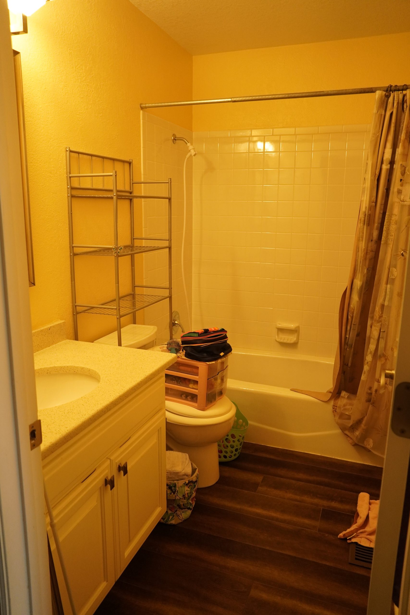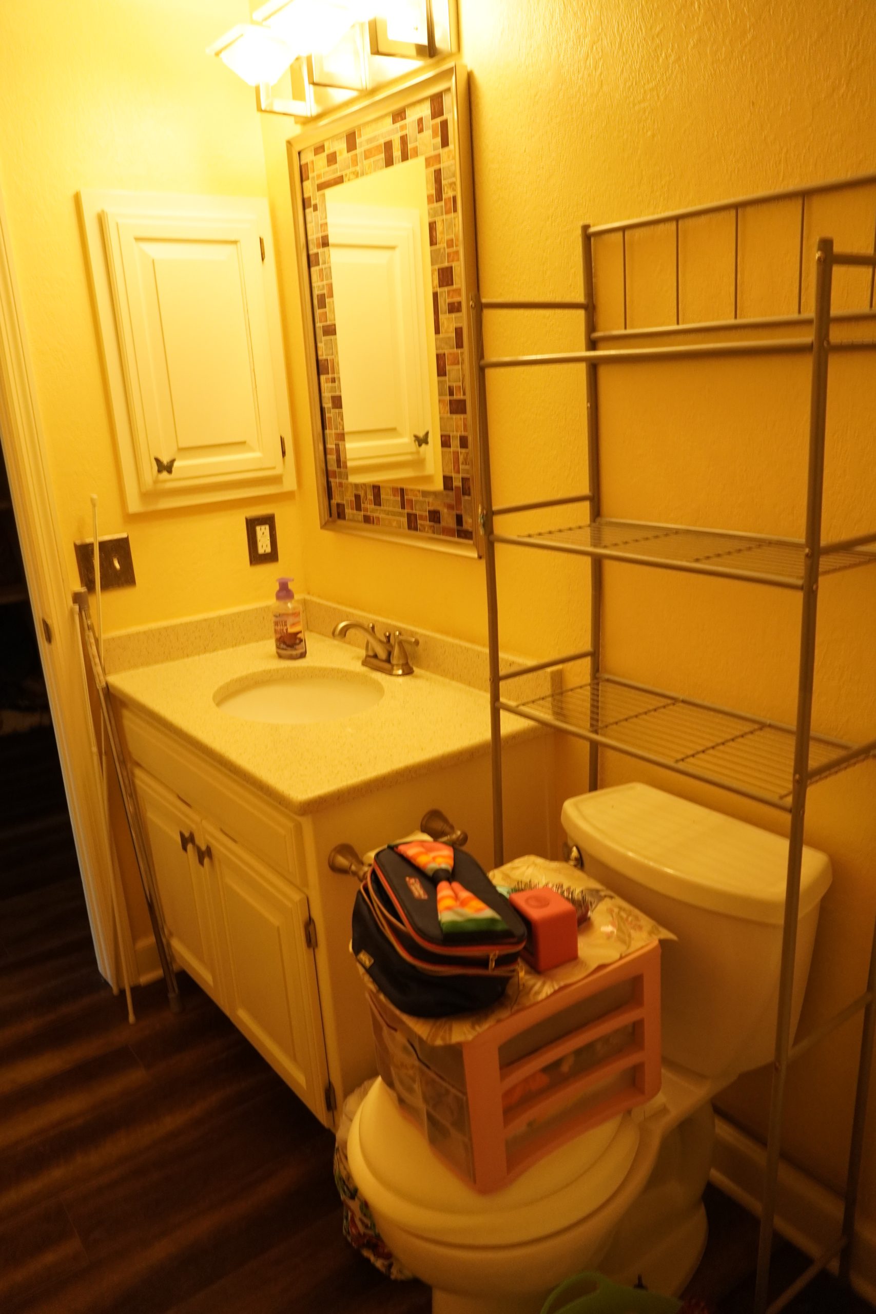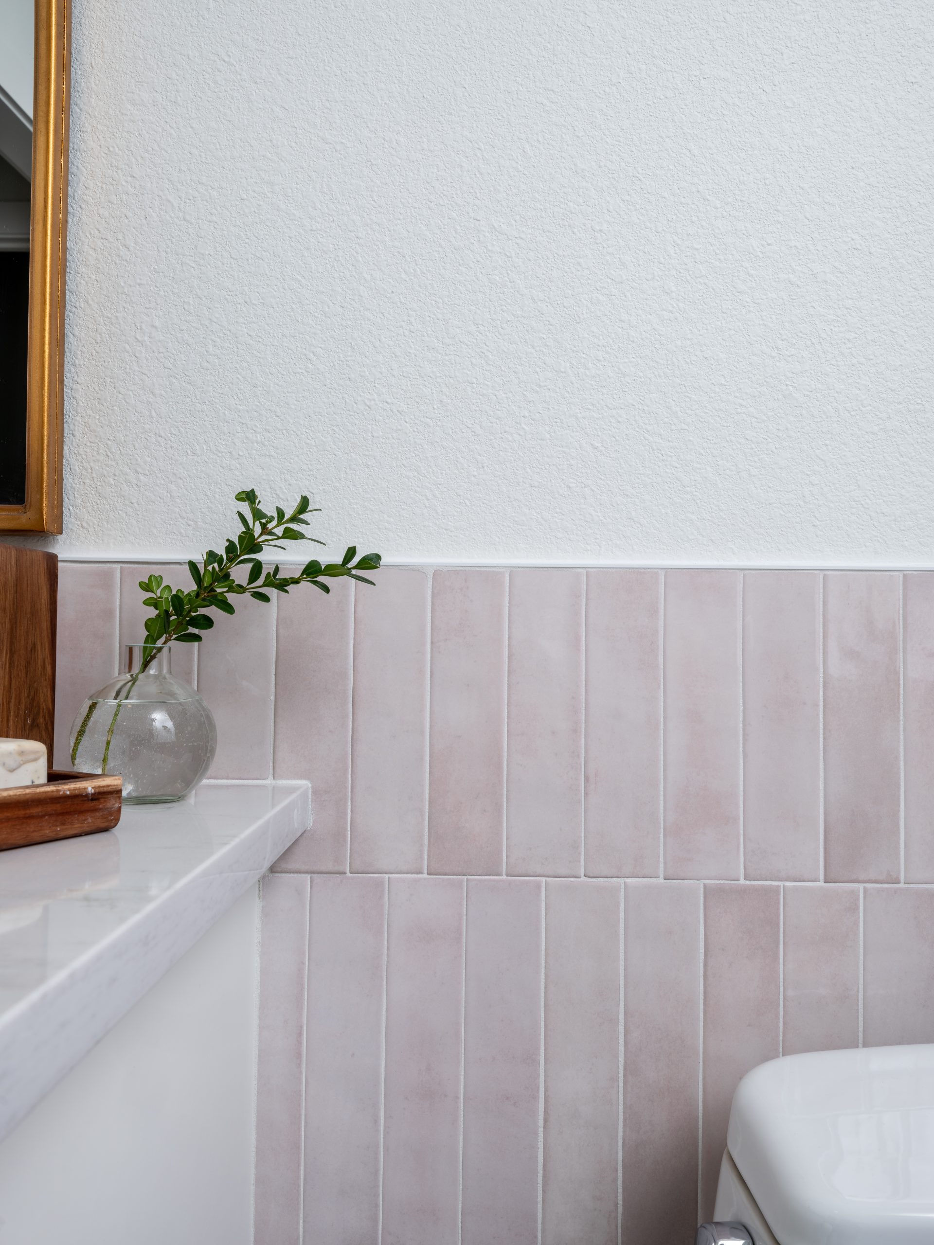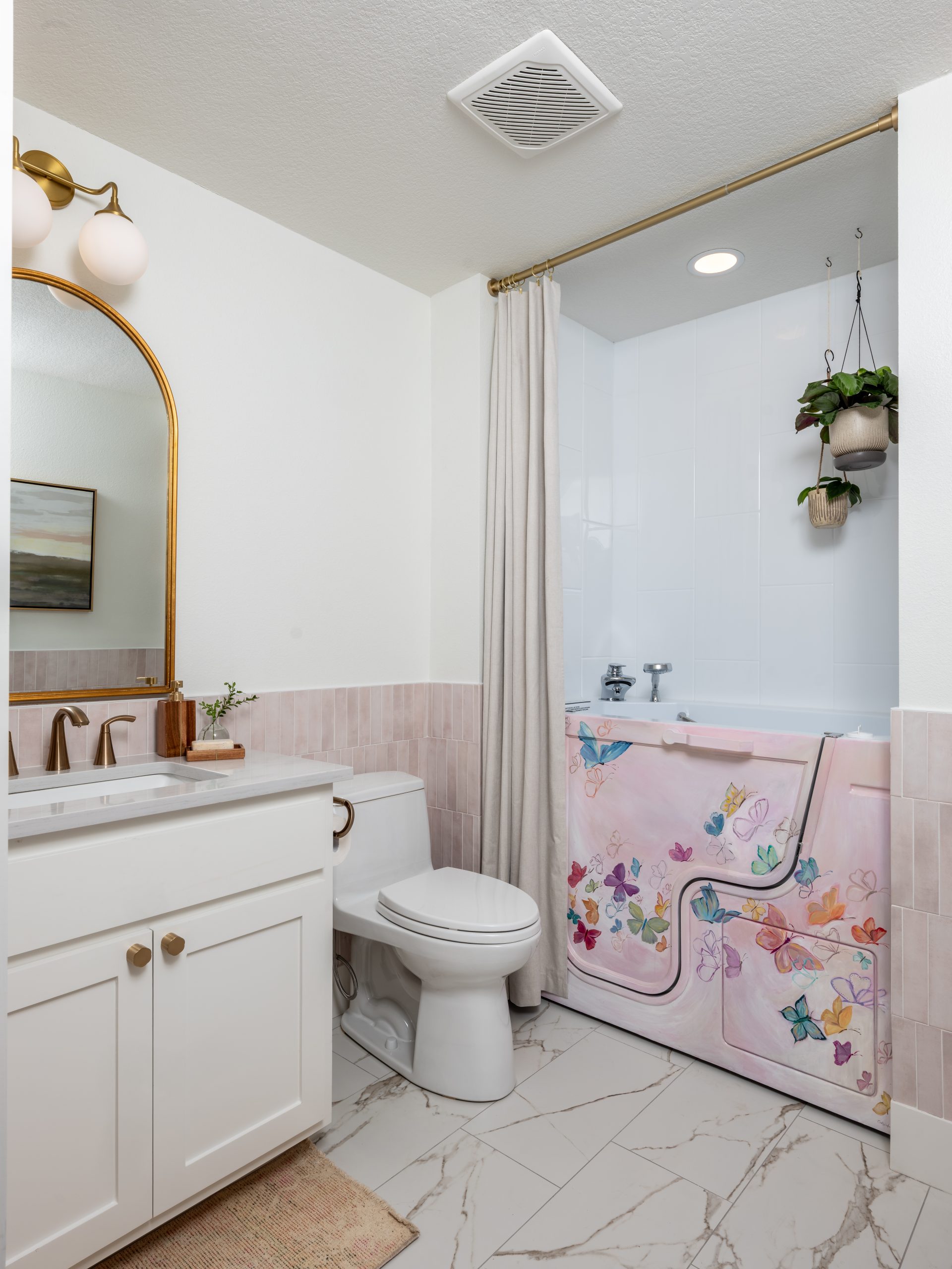 This bathroom was very dated and not functional for Caroline, who needs more space and an accessible bathtub. I made a visit to one of our plumbing suppliers to pick out a walk-in shower and bathtub combo, and while I was there, I came across a fun hand-painted bathtub, which sparked an idea for a special project. The same artist, Nicole Hardeman, who painted the bathtub in the showroom, made a trip out to the Lundeens’ home to hand-paint dainty butterflies, creating a beautiful mural on Caroline’s tub. For the rest of the bathroom, we incorporated a classic marble floor tile and soft hues of pink and cream on the walls to play off the bathtub’s colors.
