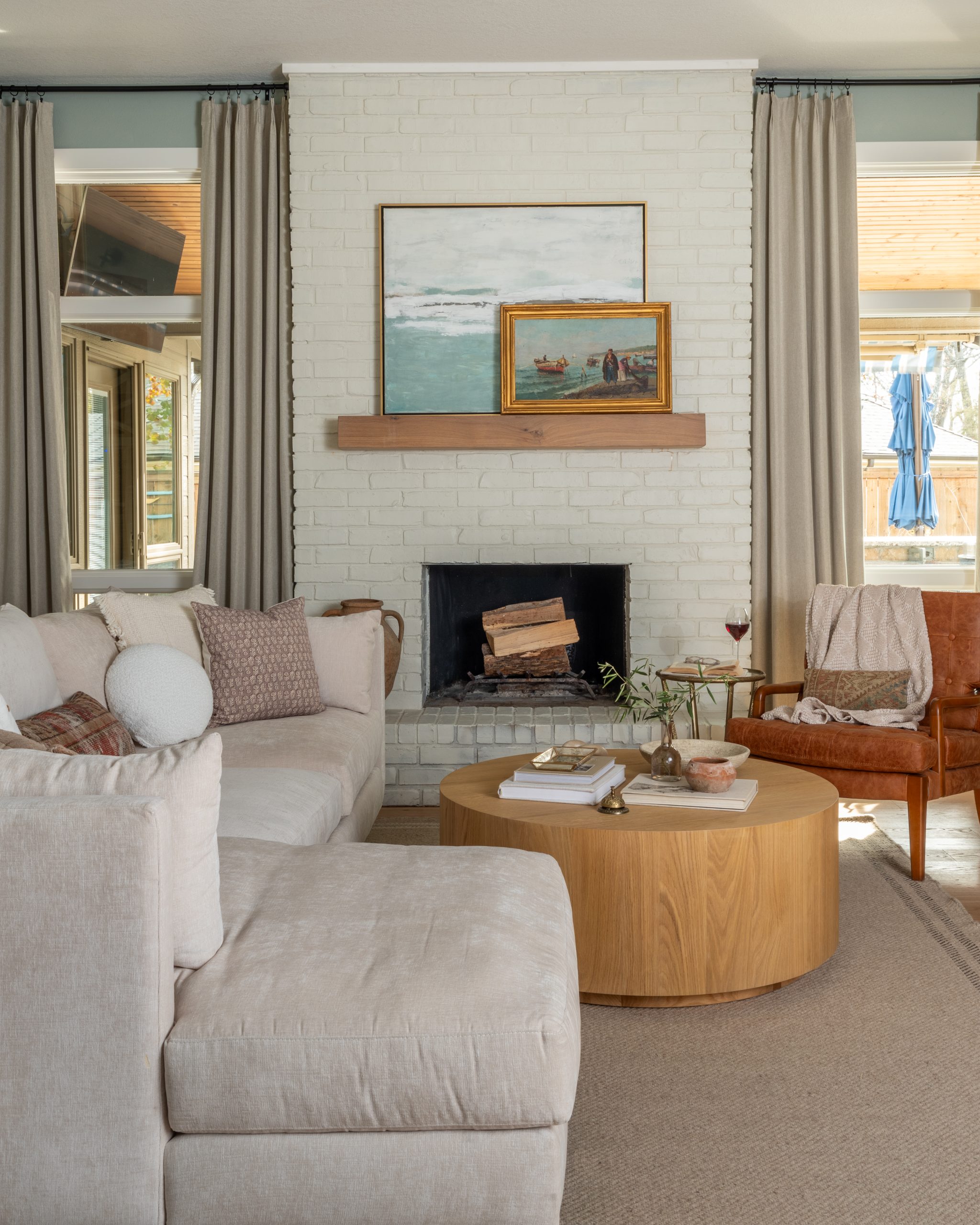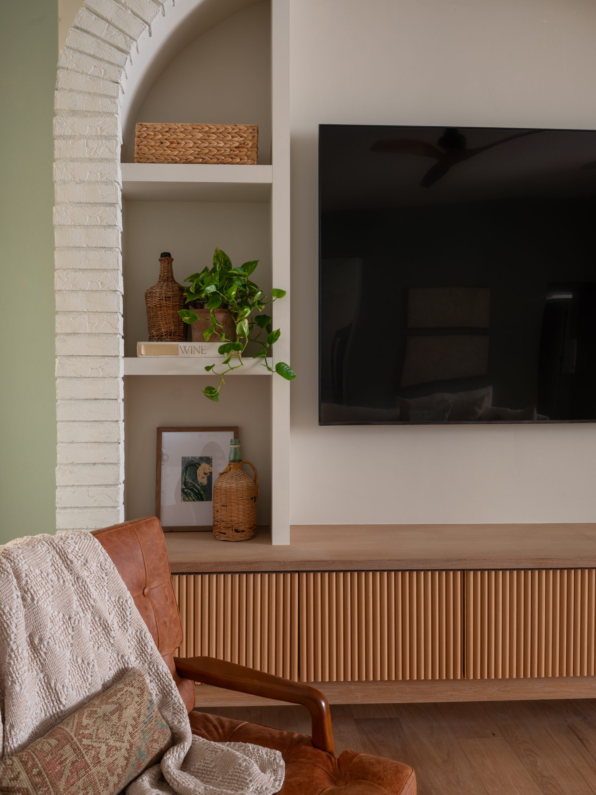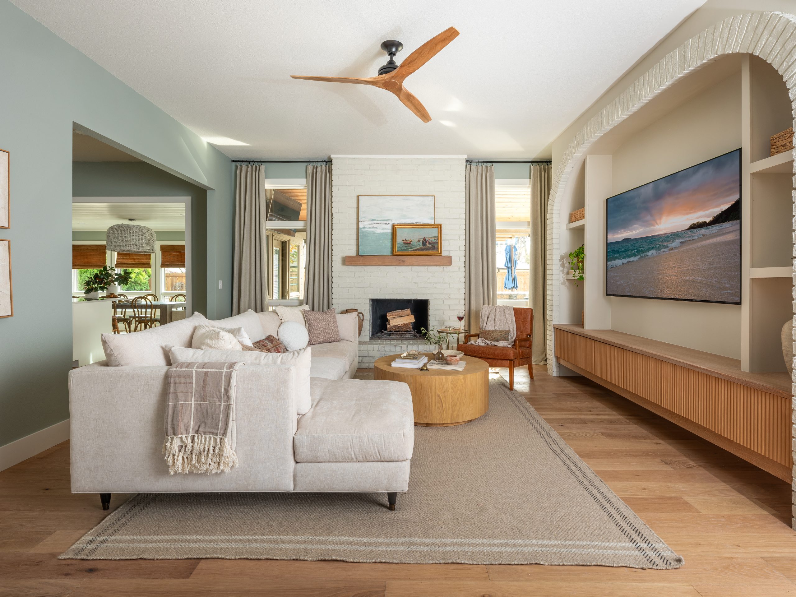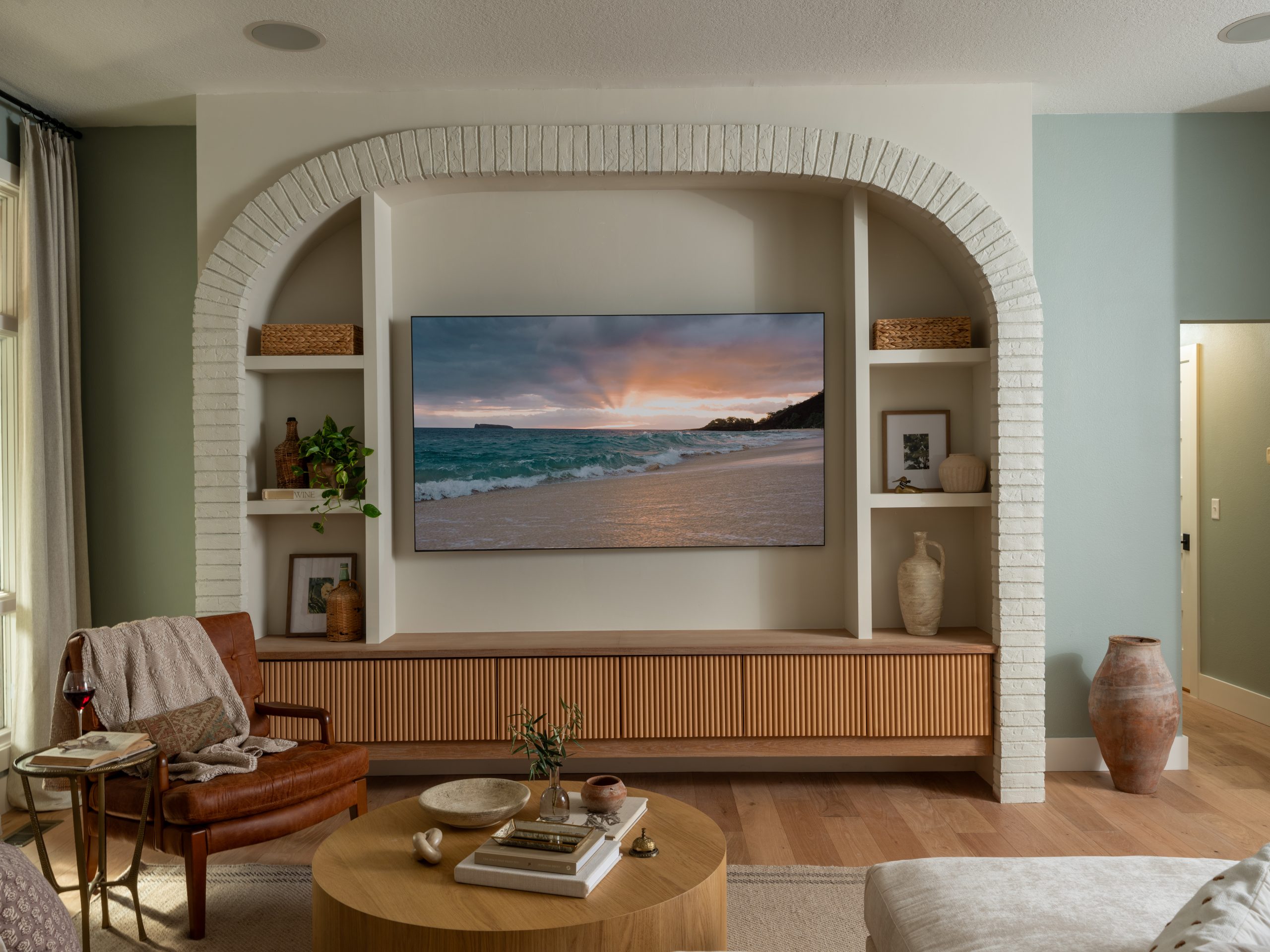 Two focal points were competing with each other in this room, and the flooring didn’t match the rest of the house. To resolve this, we moved the TV to the opposite wall and established that side of the room as the new focal point. We added a built-in cabinet with a brick arch, which brings texture and architectural interest to the space.